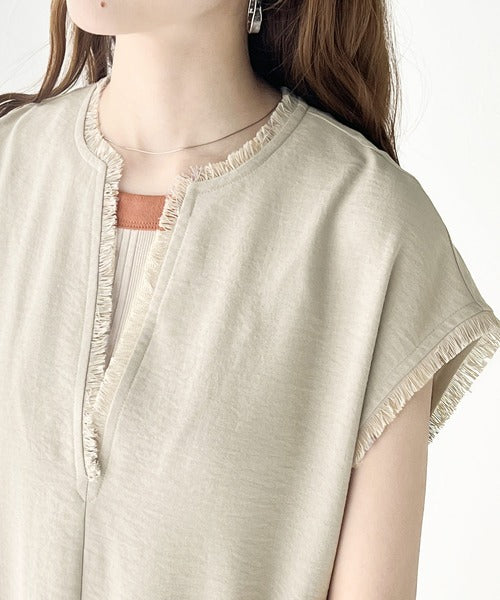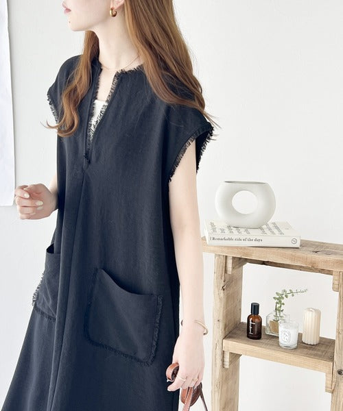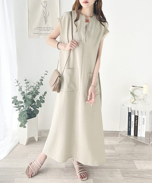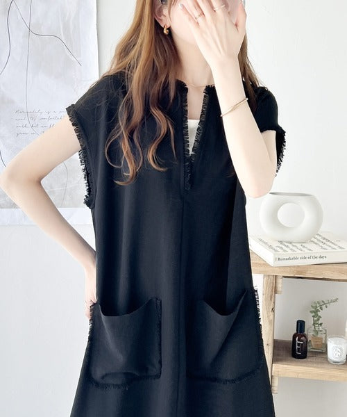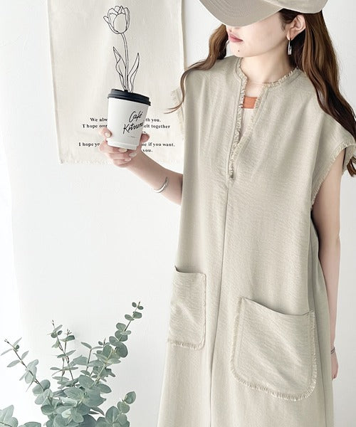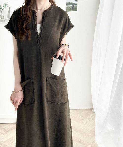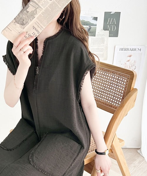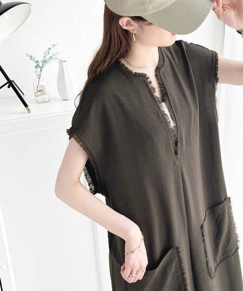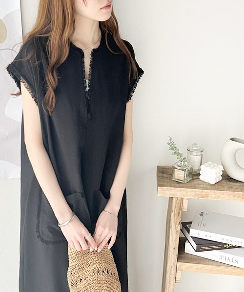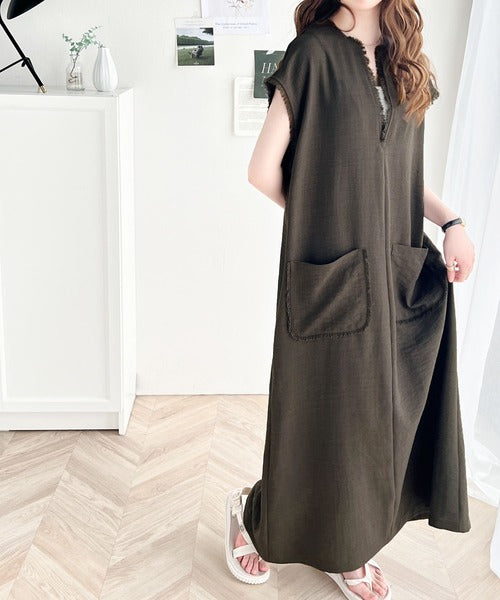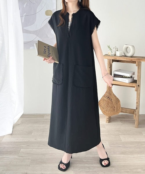 楽ちんなのに上品見え。Vネックフリンジフレンチスリーブロングワンピース ce0940182