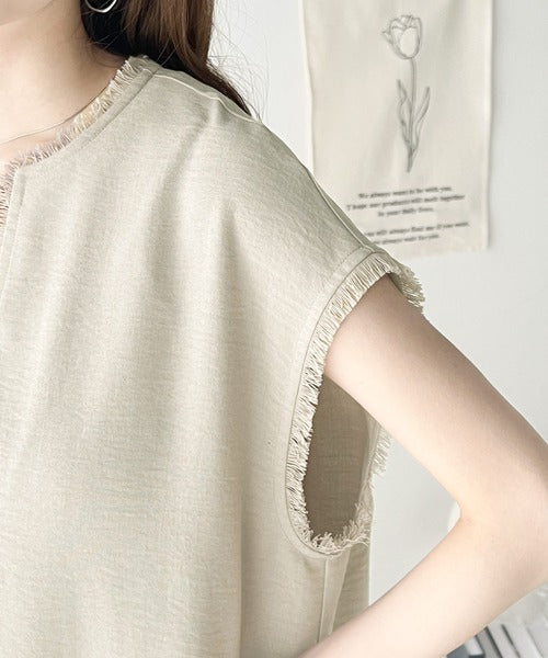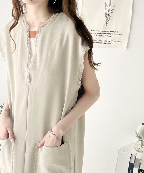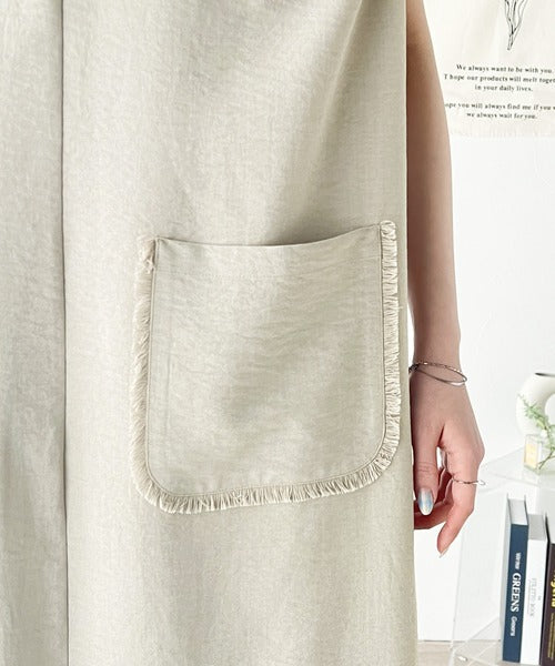 襟回り、アームホール、ポケットまわりにフリンジをあしらったこなれ感のある1着。