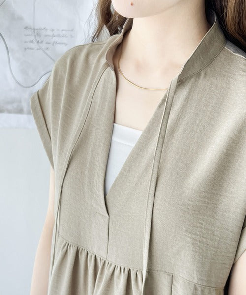襟もとはスキッパーデザインになっていて、顔周りをスッキリ見せてくれるのも嬉しいポイント。