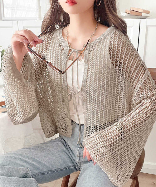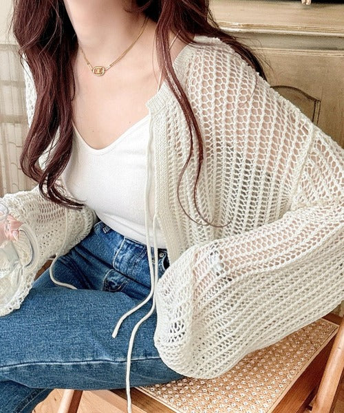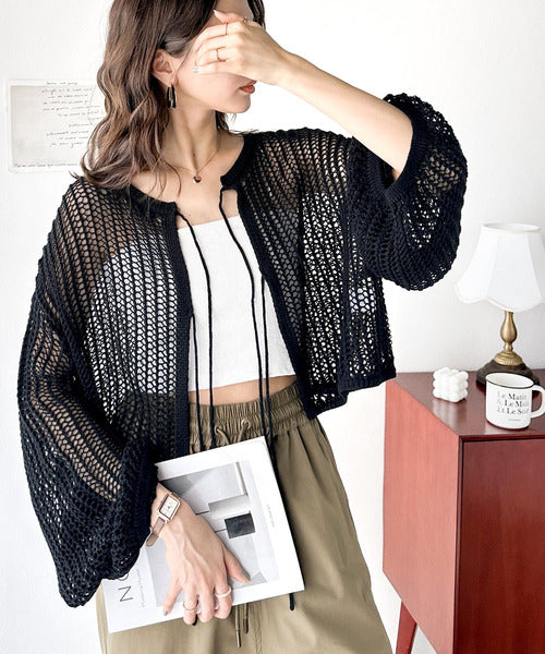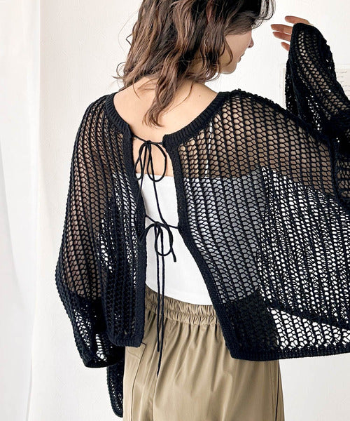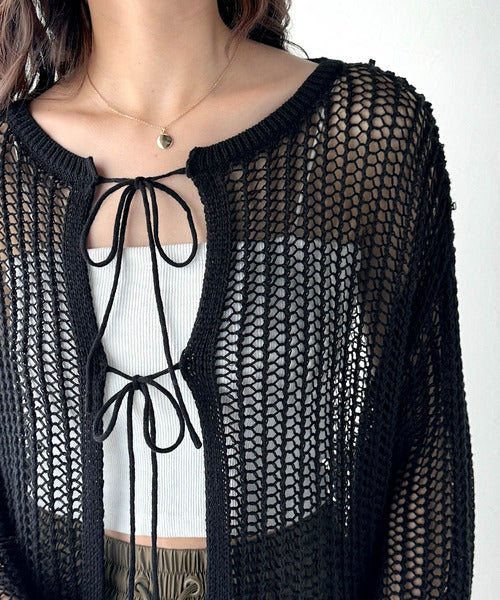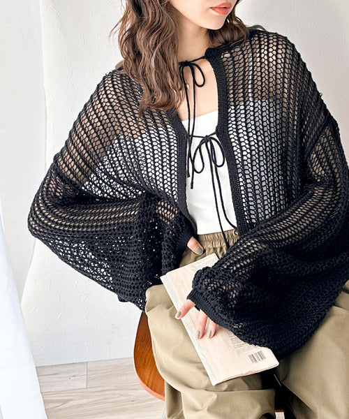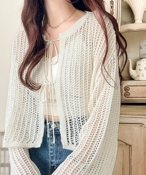 透かし編みで魅せる。前後2wayリボンカットレースカーディガン ce0940190