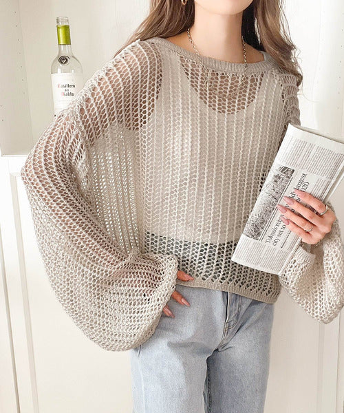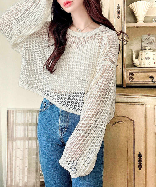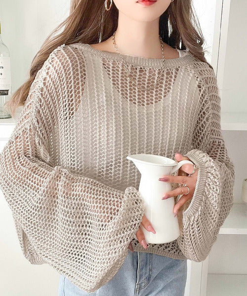 透かし編みがオシャレなメッシュニットなので、合わせるインナー次第でロングシーズン楽しめます。