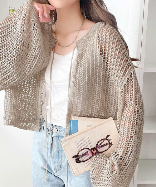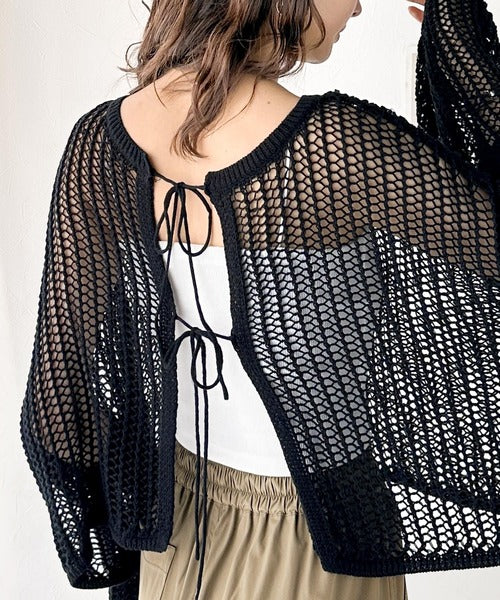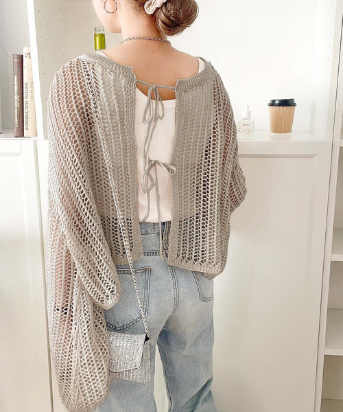 カーディガンとしてもプルオーバーとしても着用可能な、ゆるメッシュ編みの前後2WAYカーディガン。