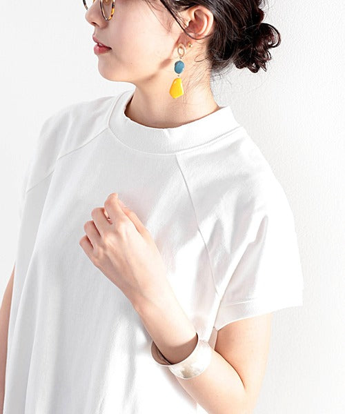 モックネックの首元から袖にかけて斜めに切替の入ったラグランスリーブで大人めカジュアルに。