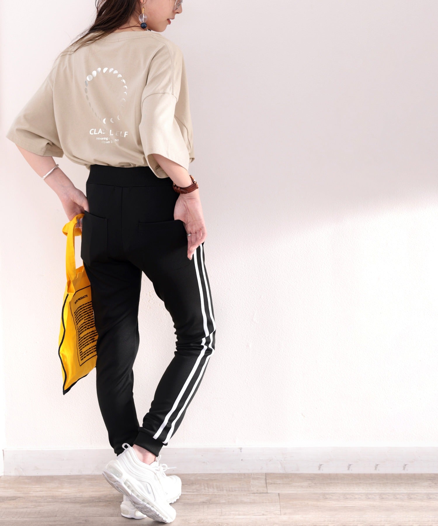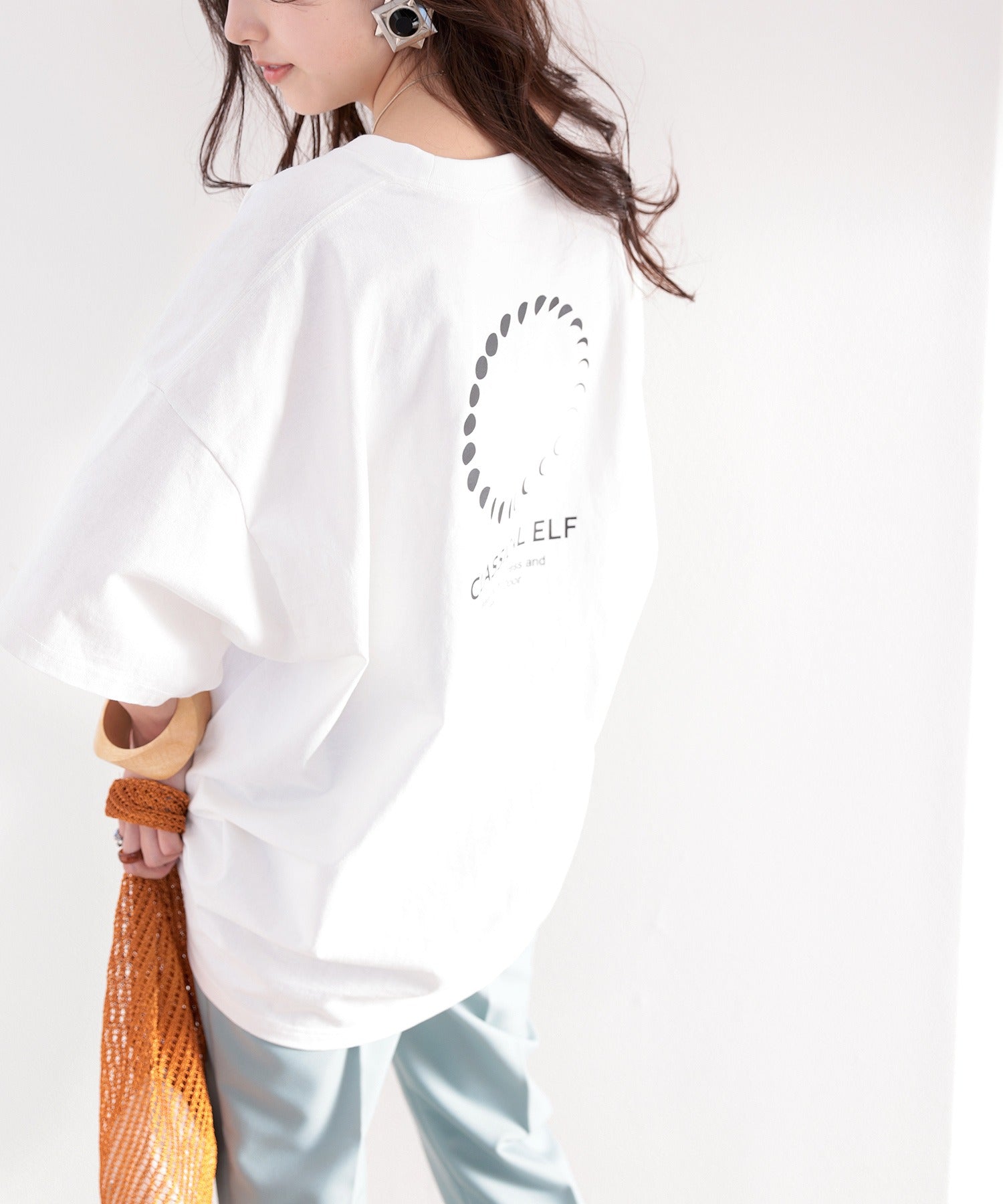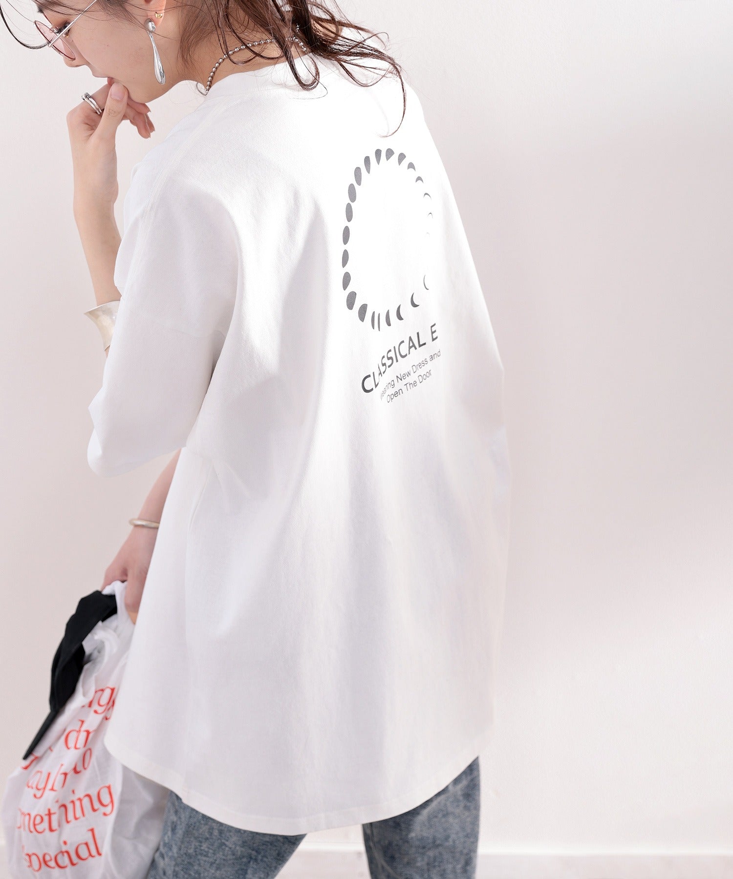 バックにあしらったプリントで、シンプルなTシャツでも一気にトレンド顔に。