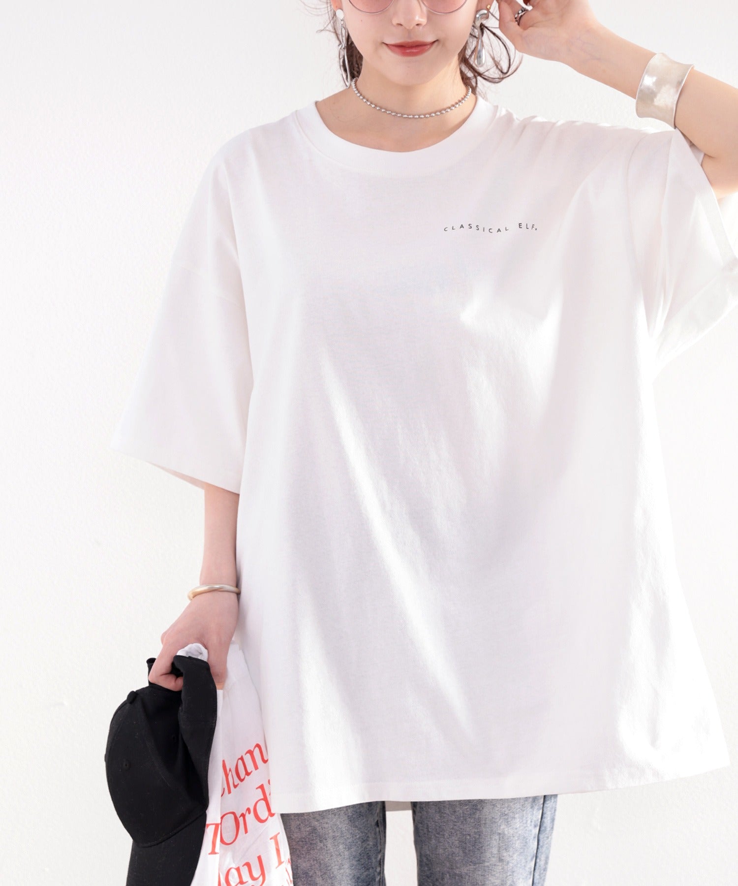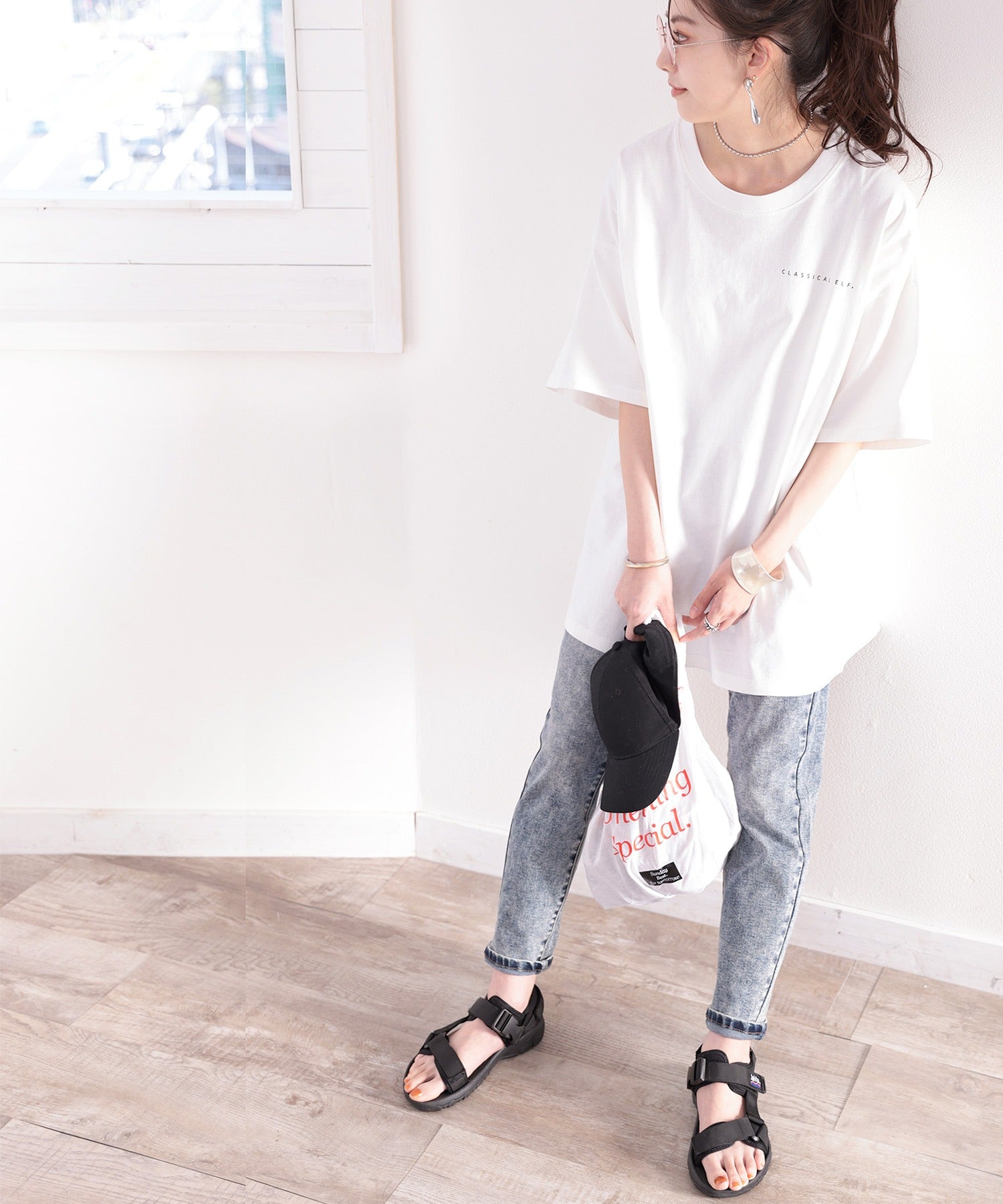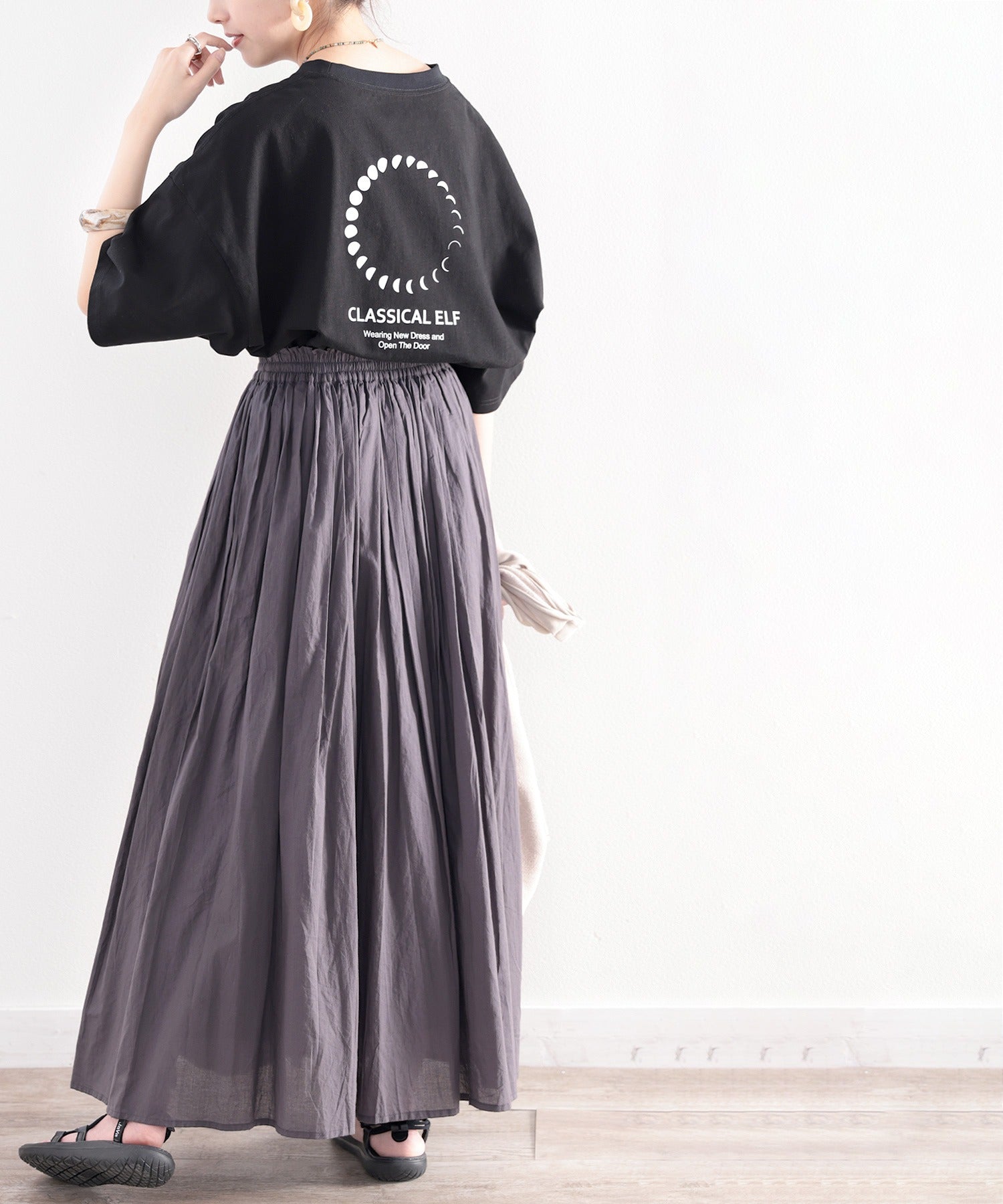 肘まで隠れる袖丈は同じTシャツでもぐっと大人っぽい印象に。
