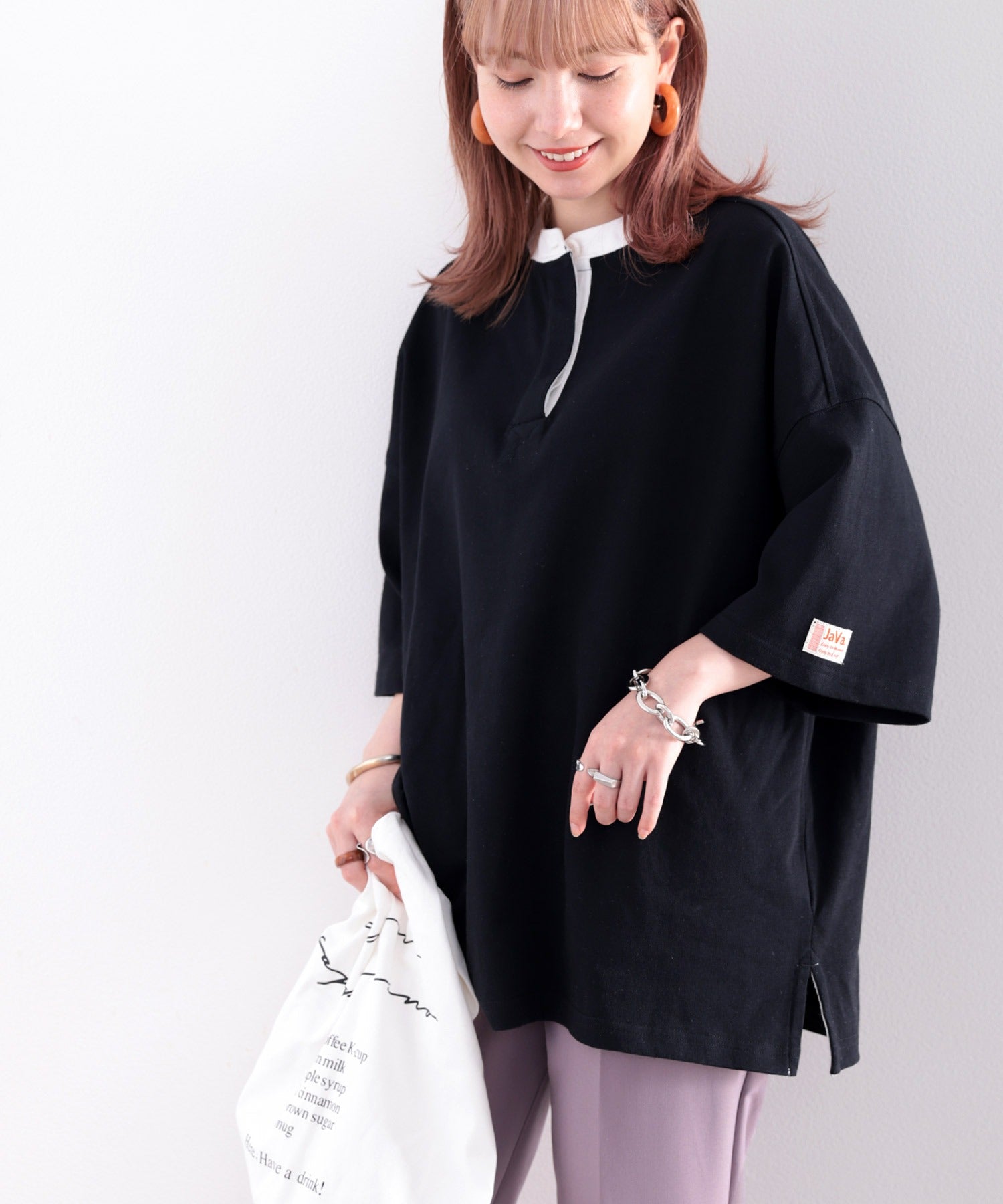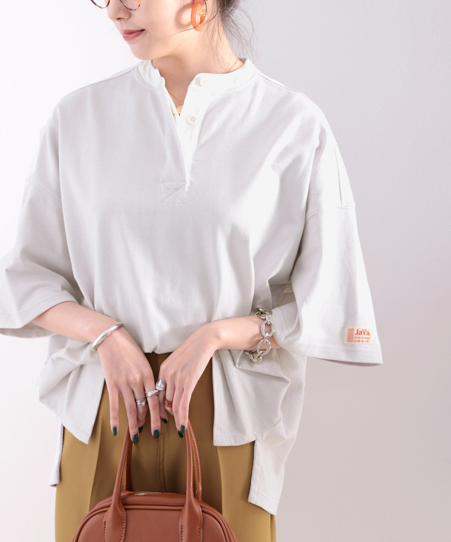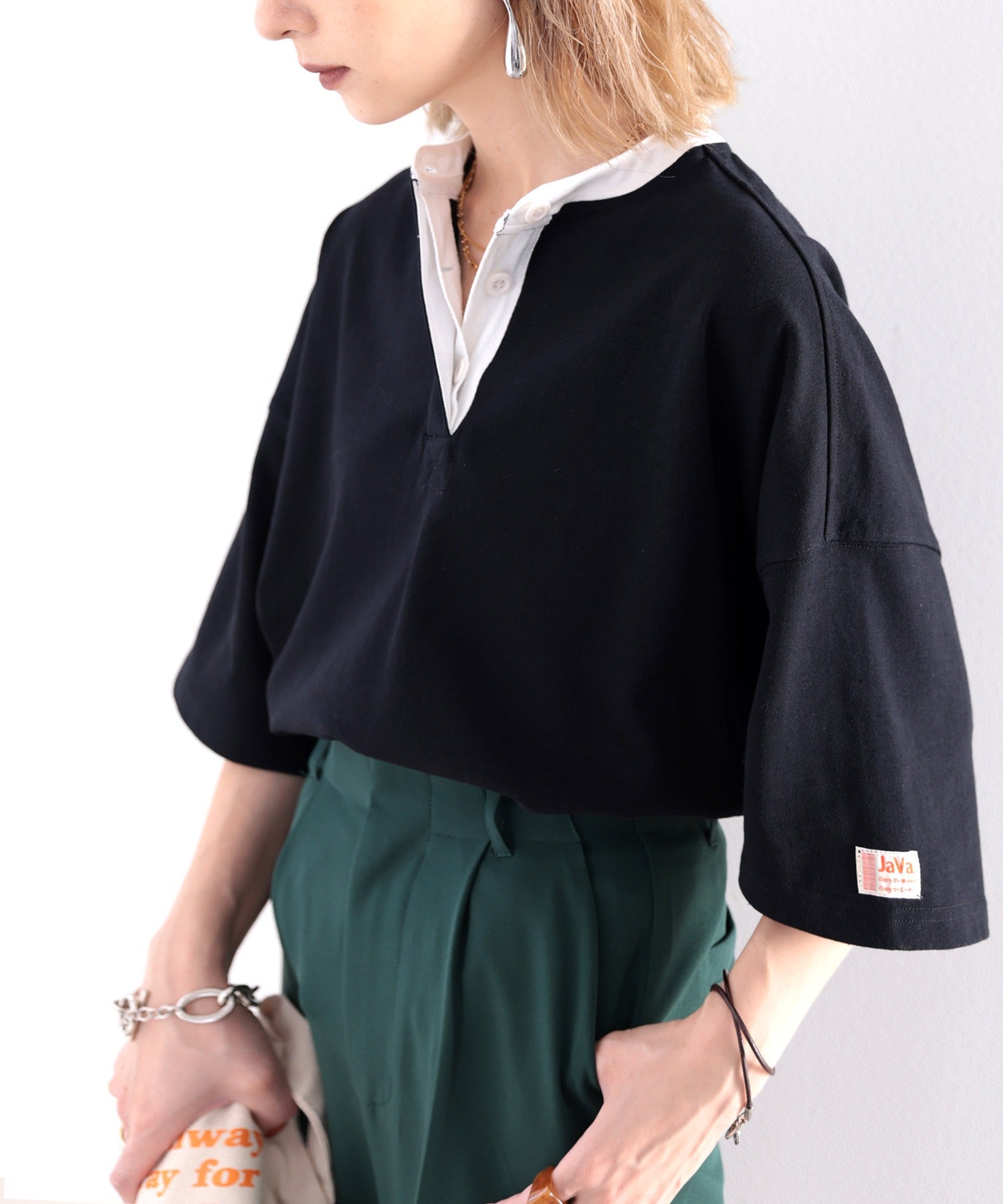 《JaVa ジャバコラボ》USAコットン100%、バンドカラートップス。 ce0960089