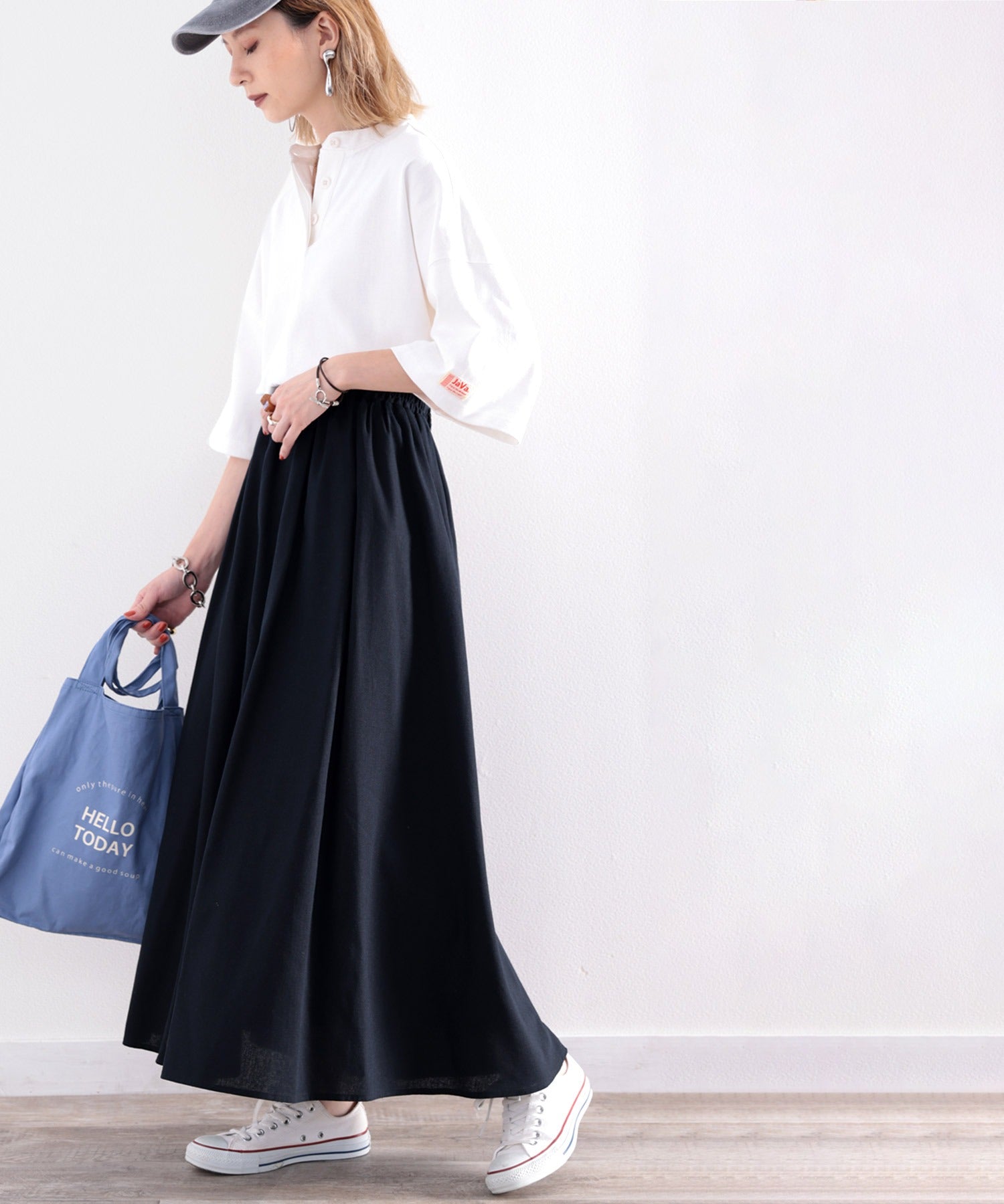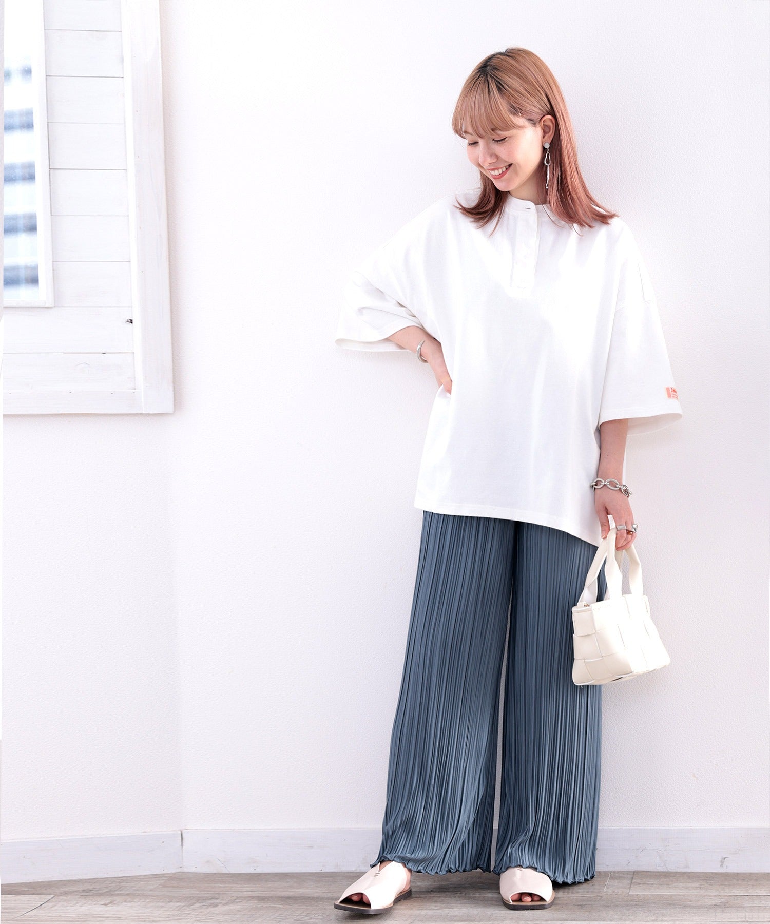 身体のラインを拾わないビッグシルエットと華奢見せするドロップショルダーで、