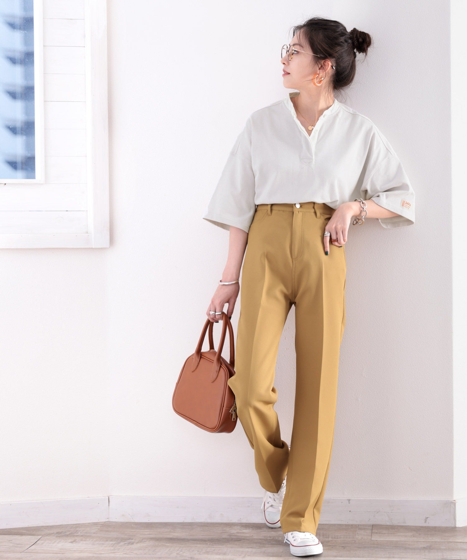 トレンドのバンドカラートップス。