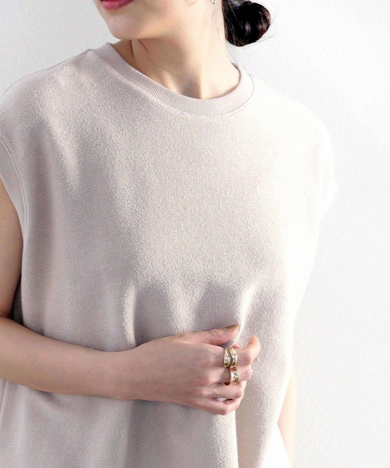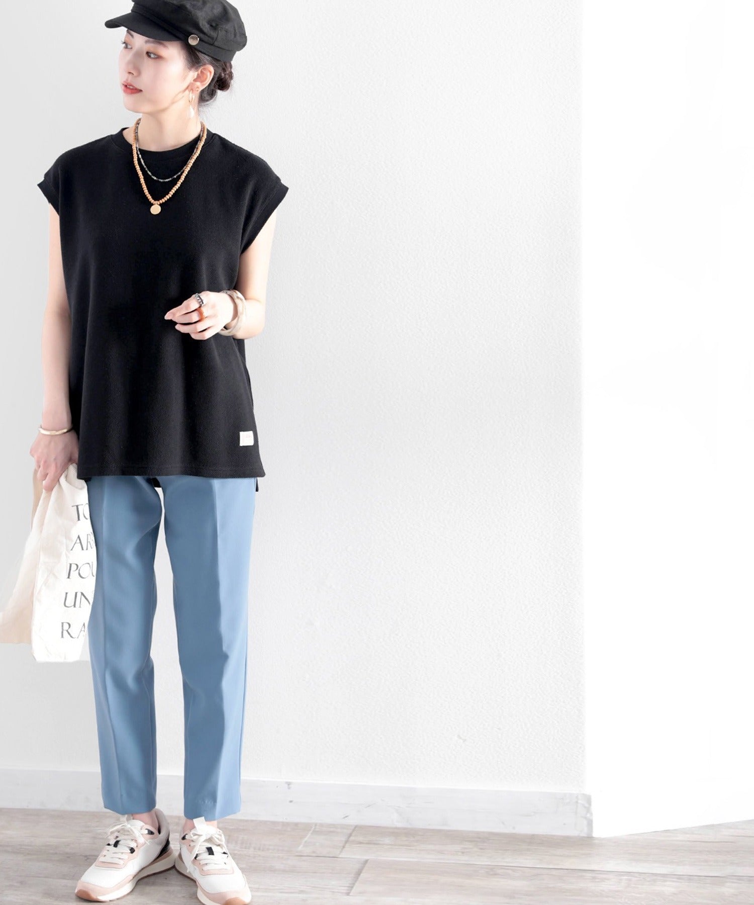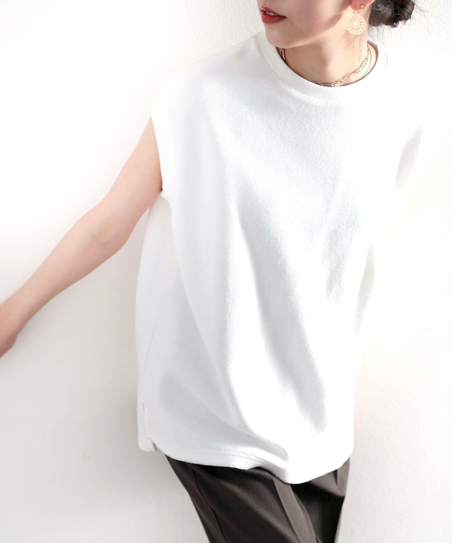 クルーネックデザインはノースリーブで抜け感を出し、バランスの取れたシルエットに。