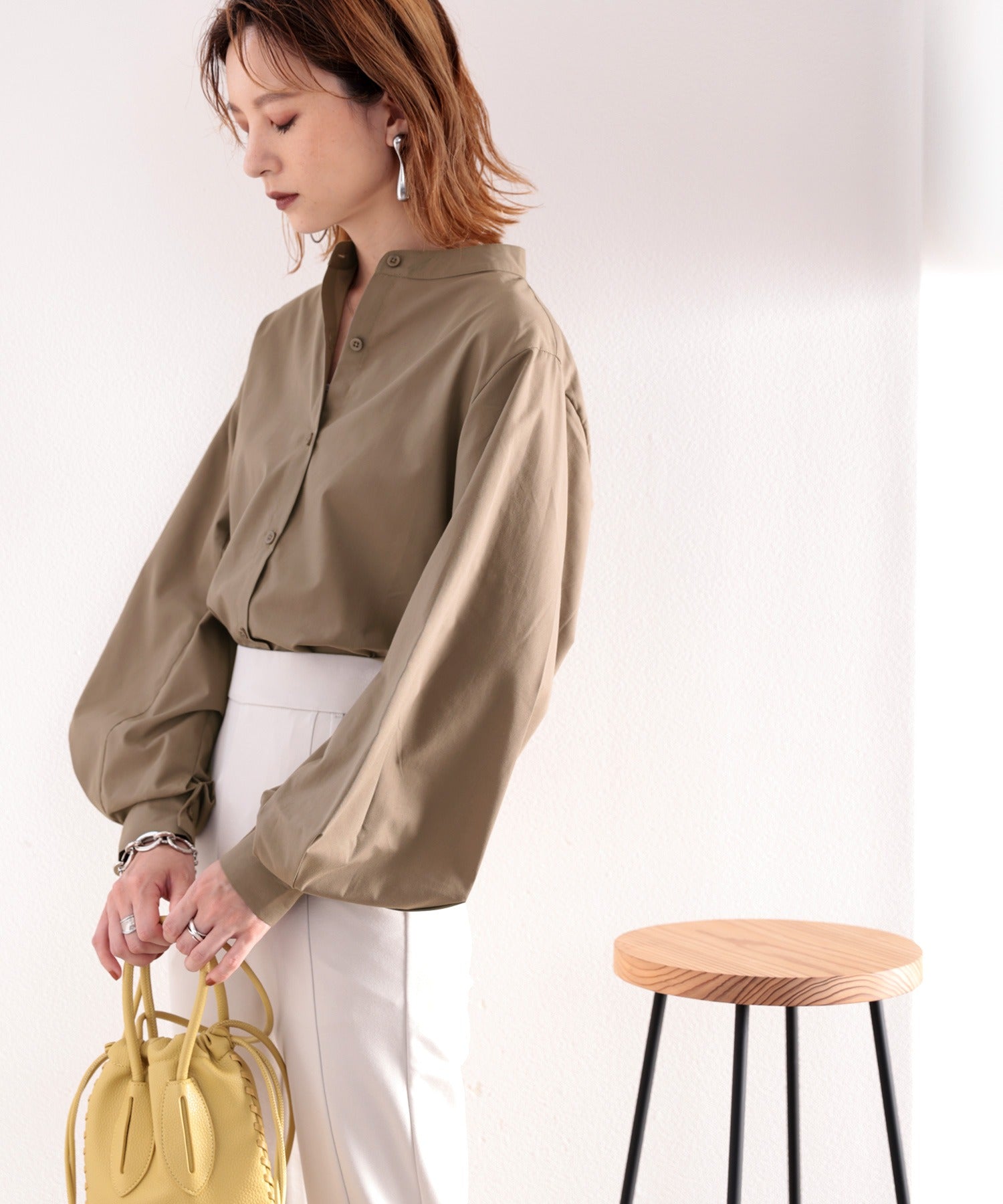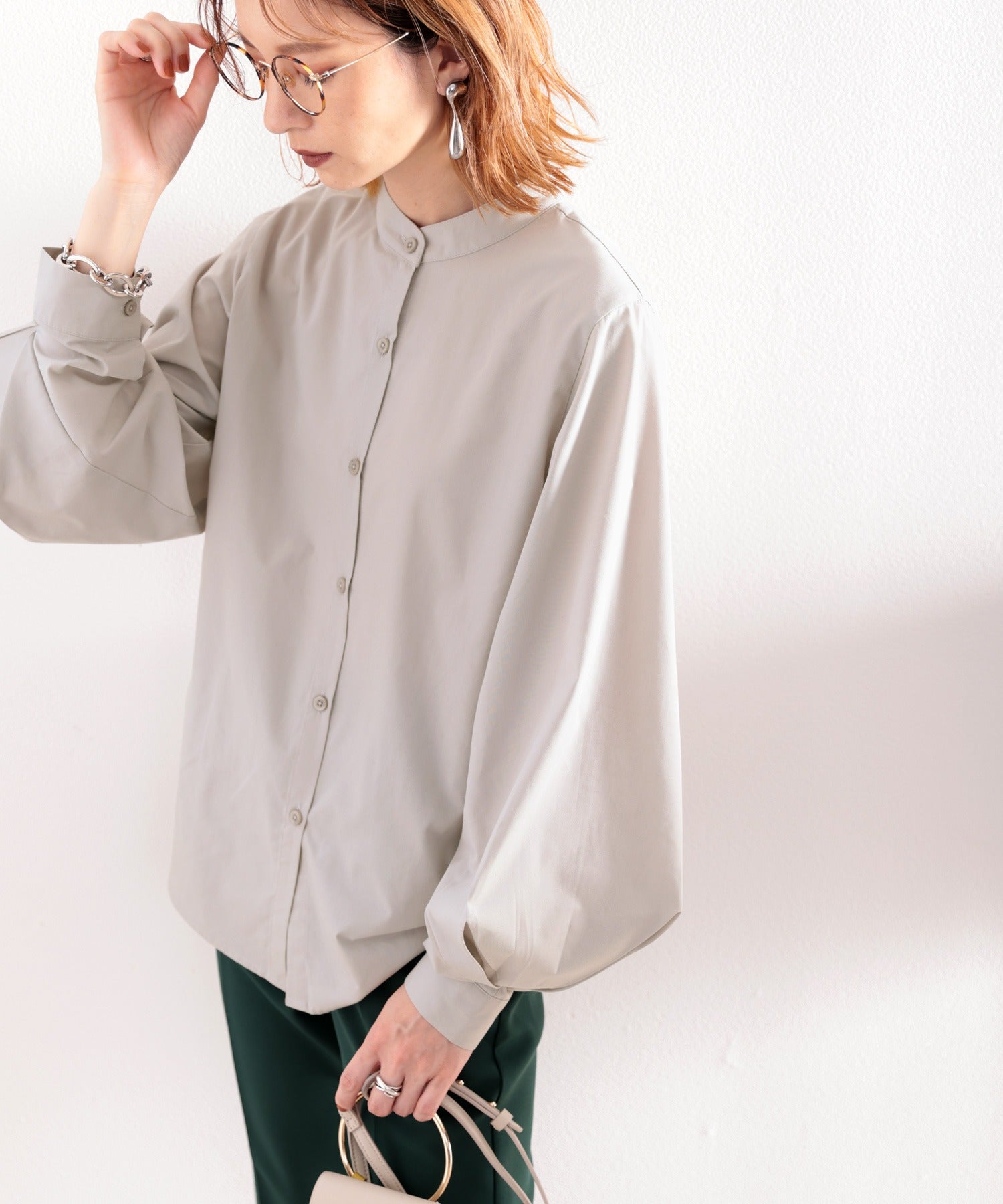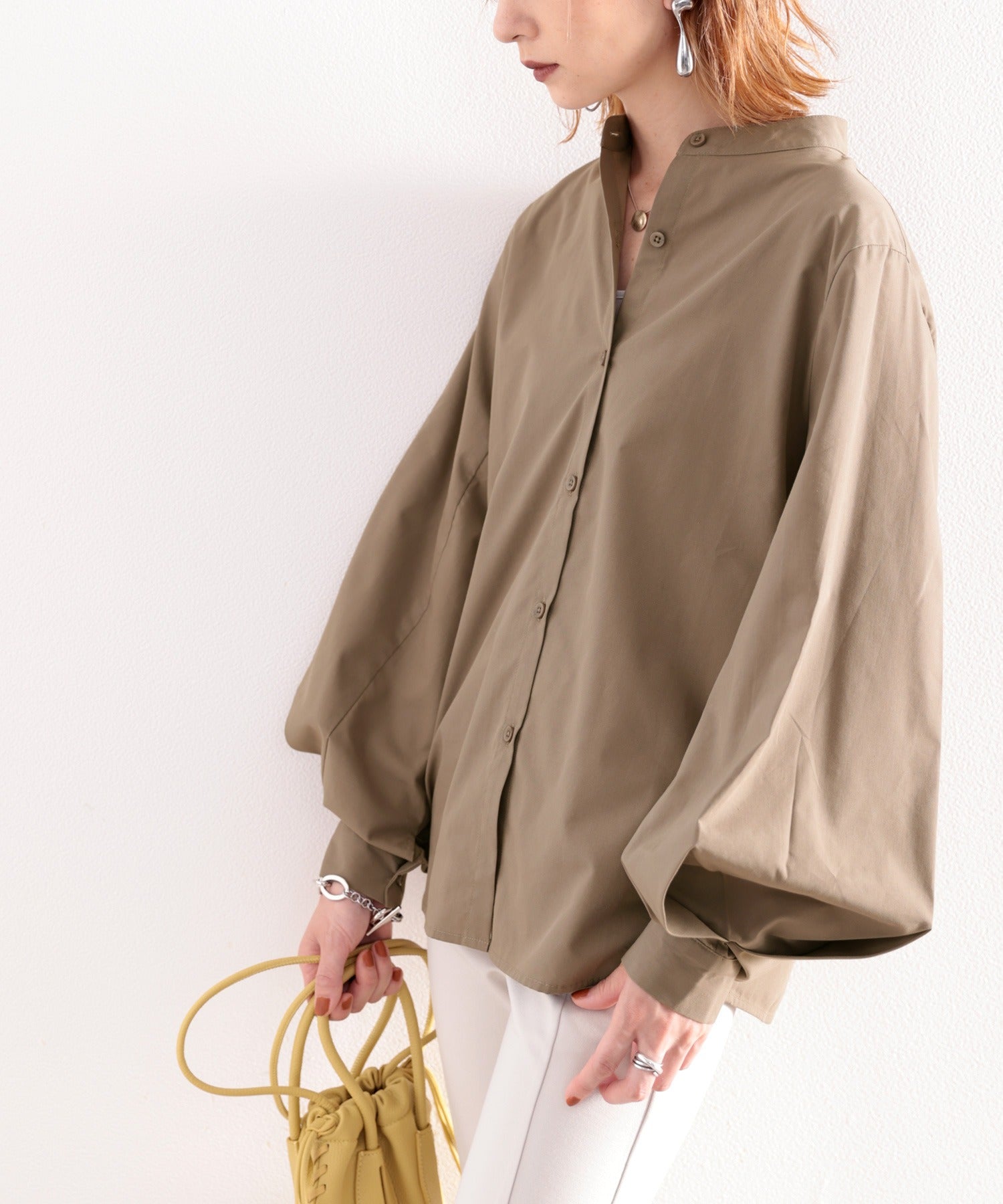 バンドカラーの詰まったデザインですがドロップショルダーで抜け感もプラス。