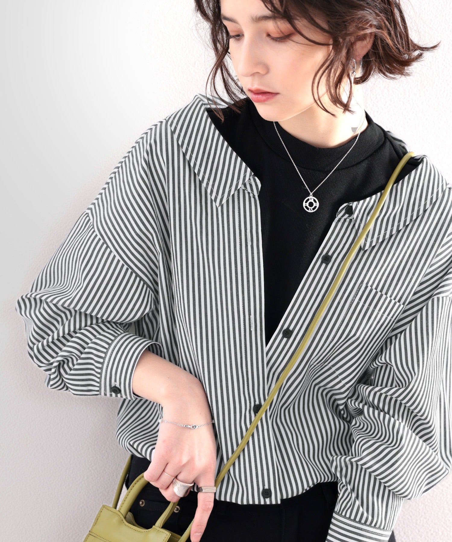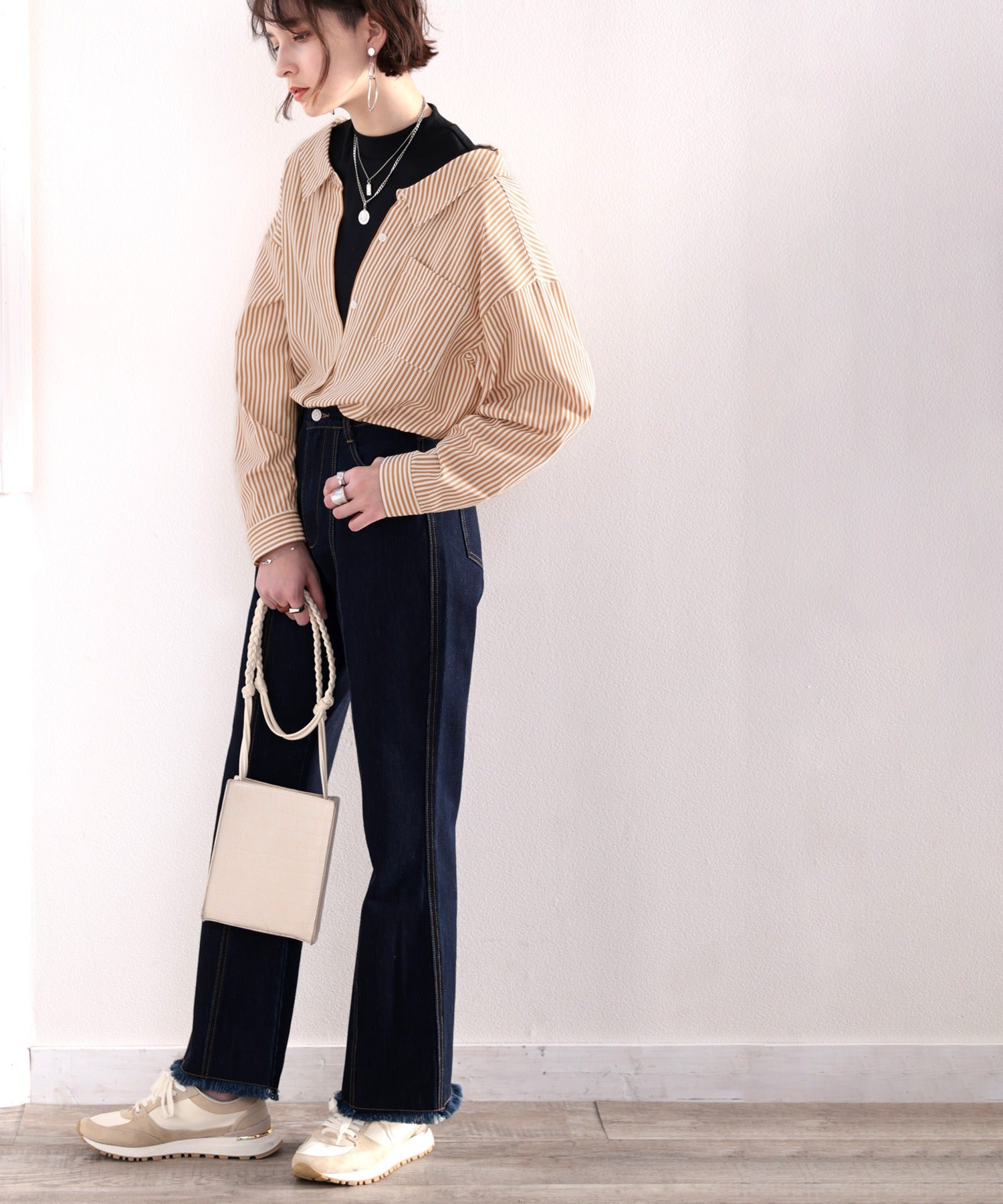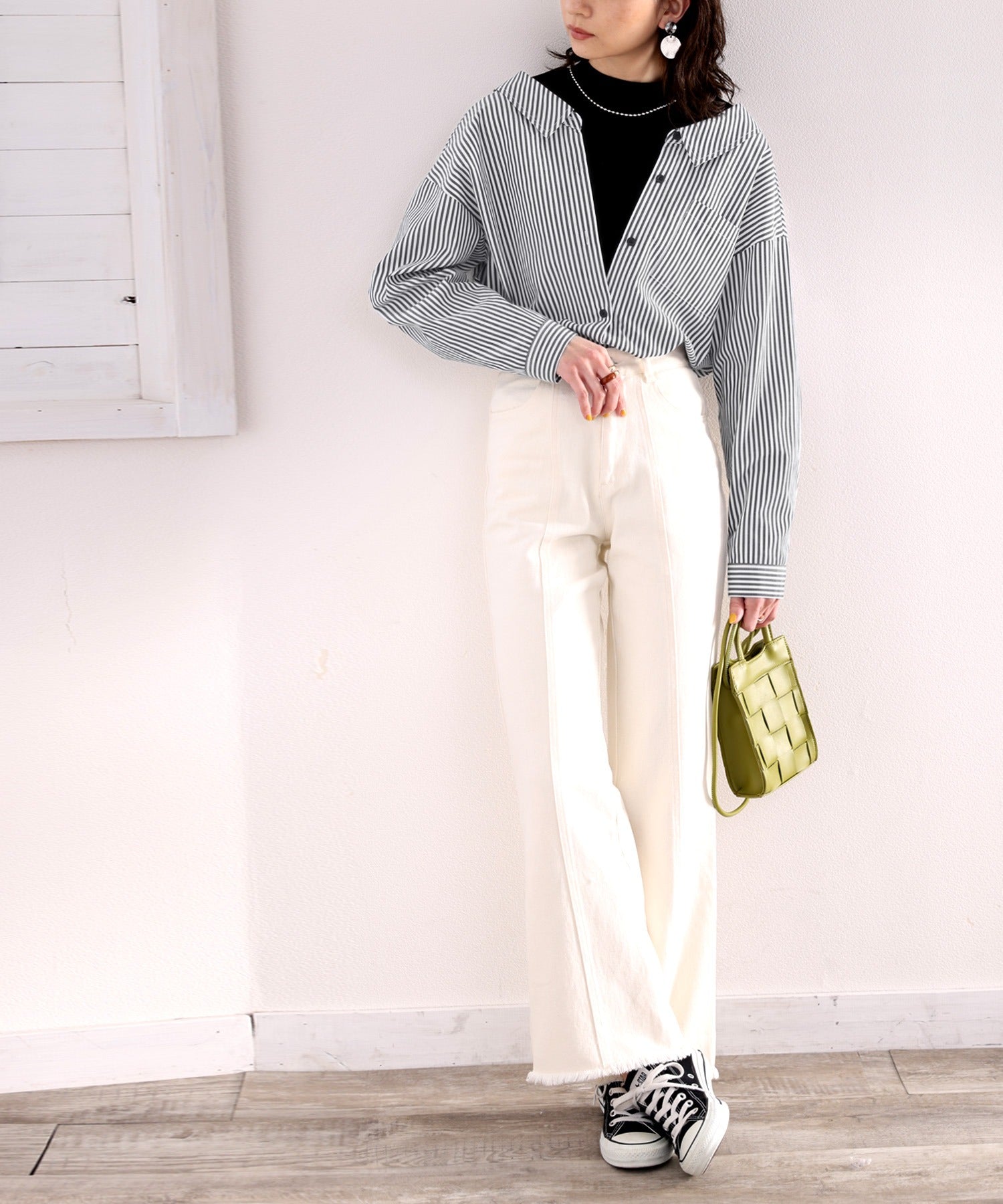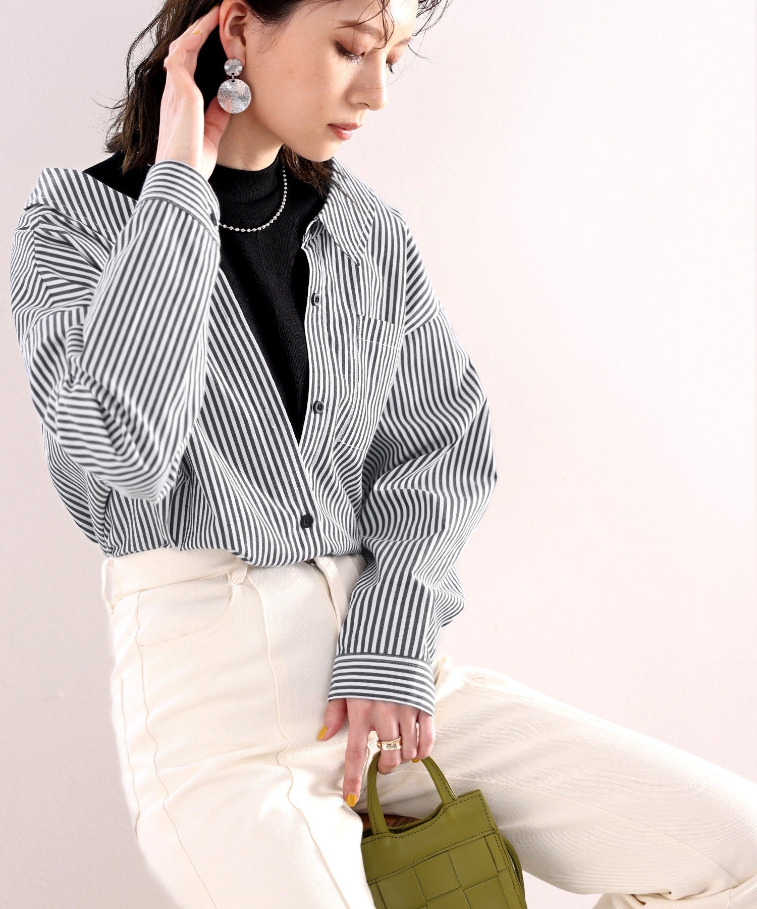 ストライプの抜き襟シャツ×黒ハイネックで旬の重ね着がすぐ楽しめる♪