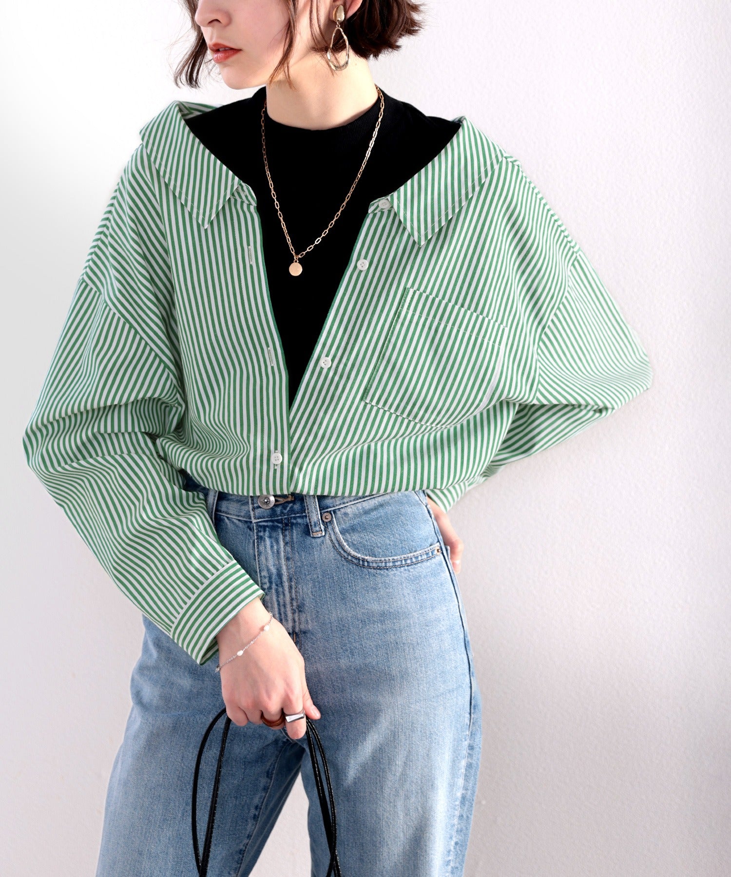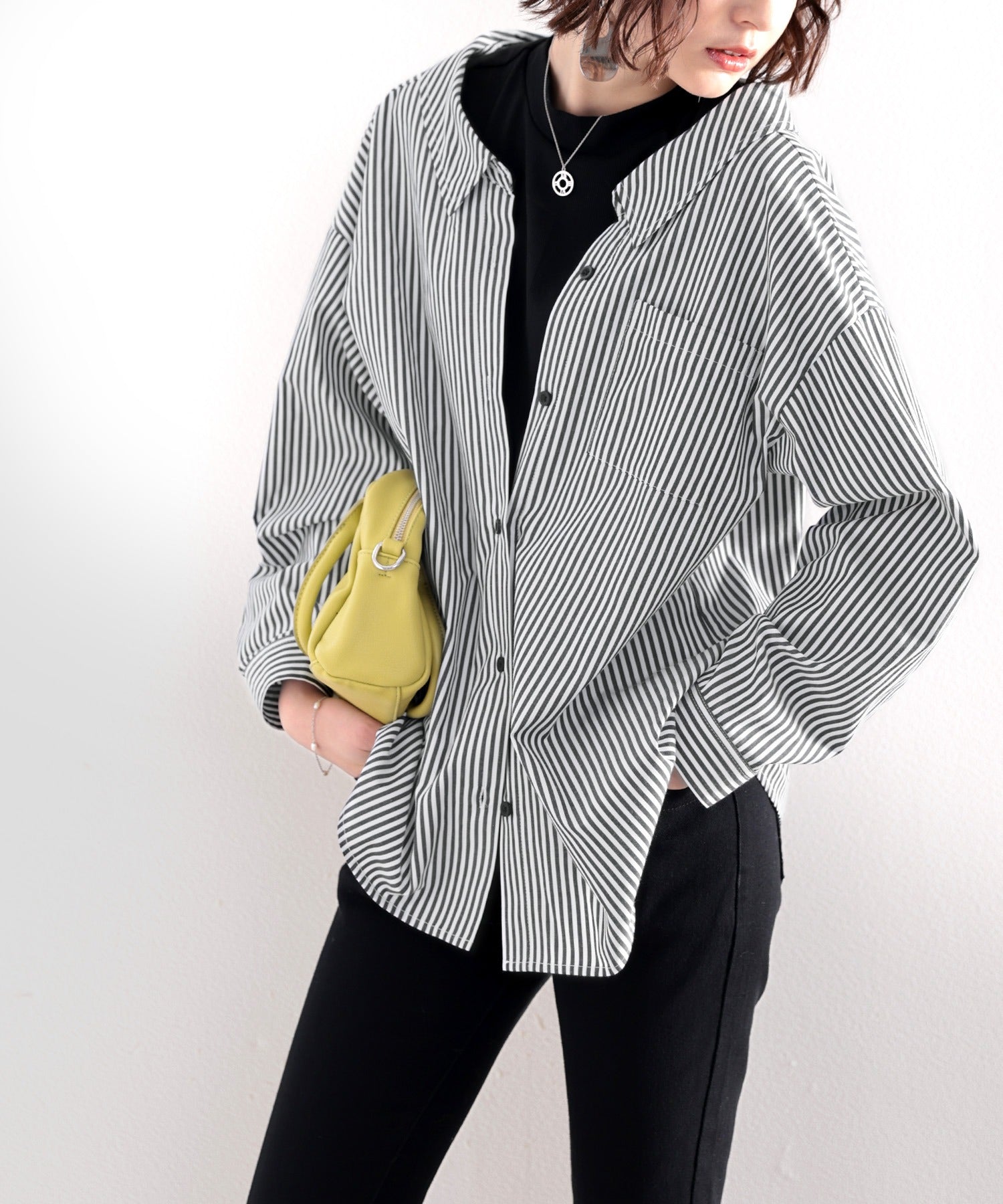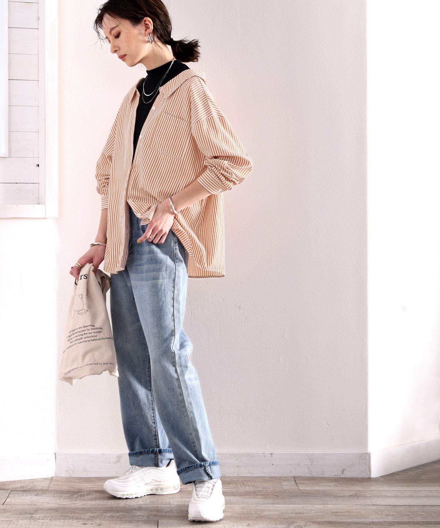 ストライプの抜き襟シャツ×黒ハイネックで旬の重ね着がすぐ楽しめる♪