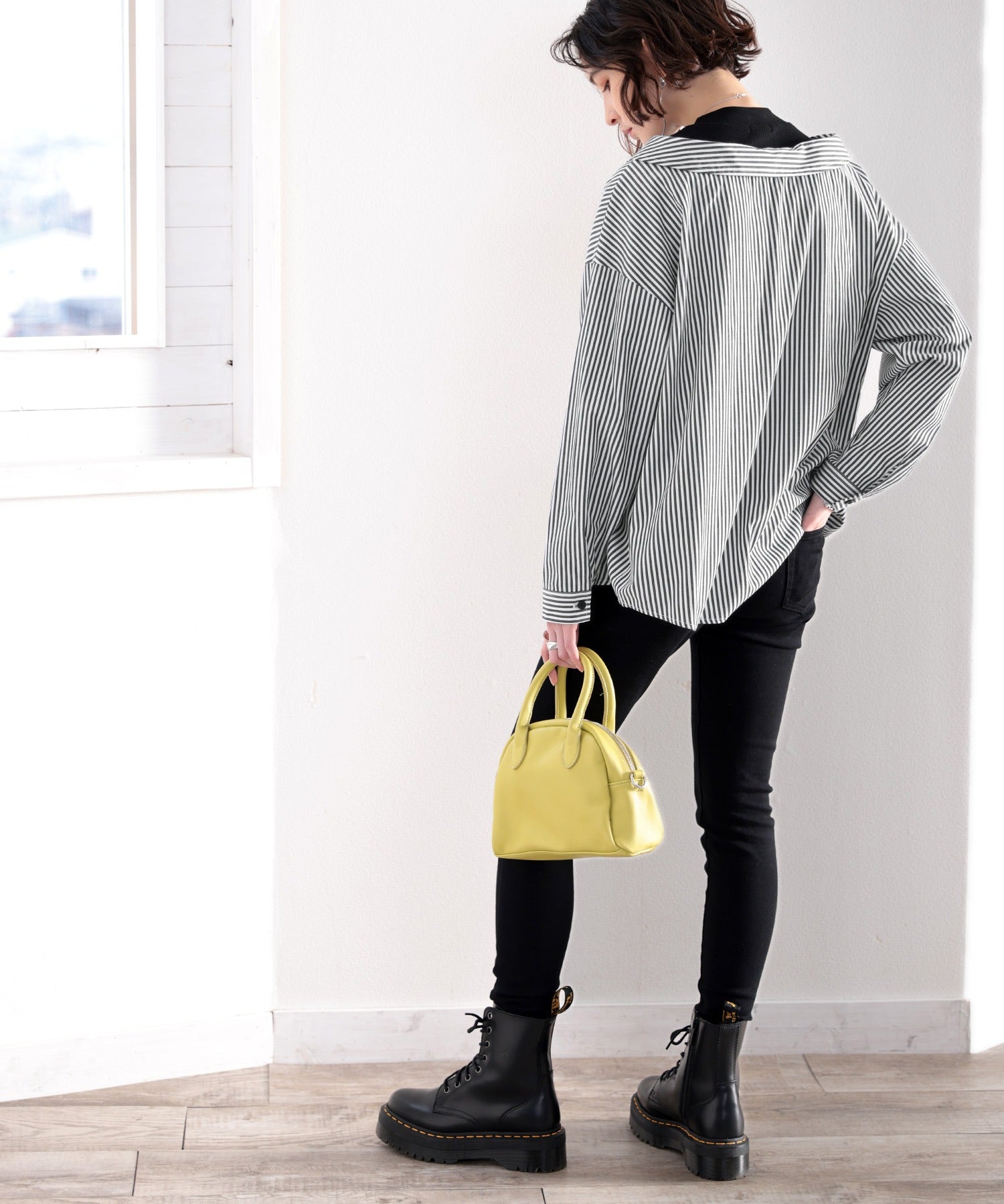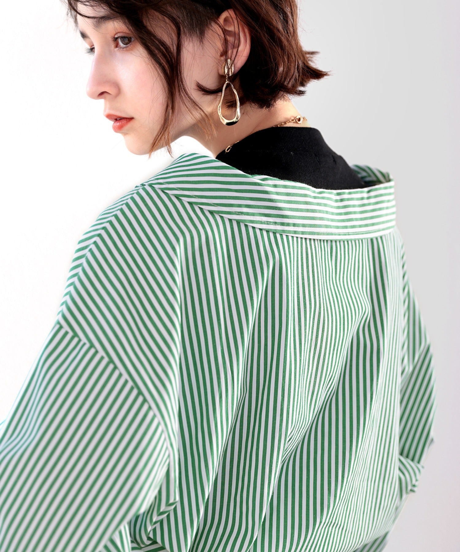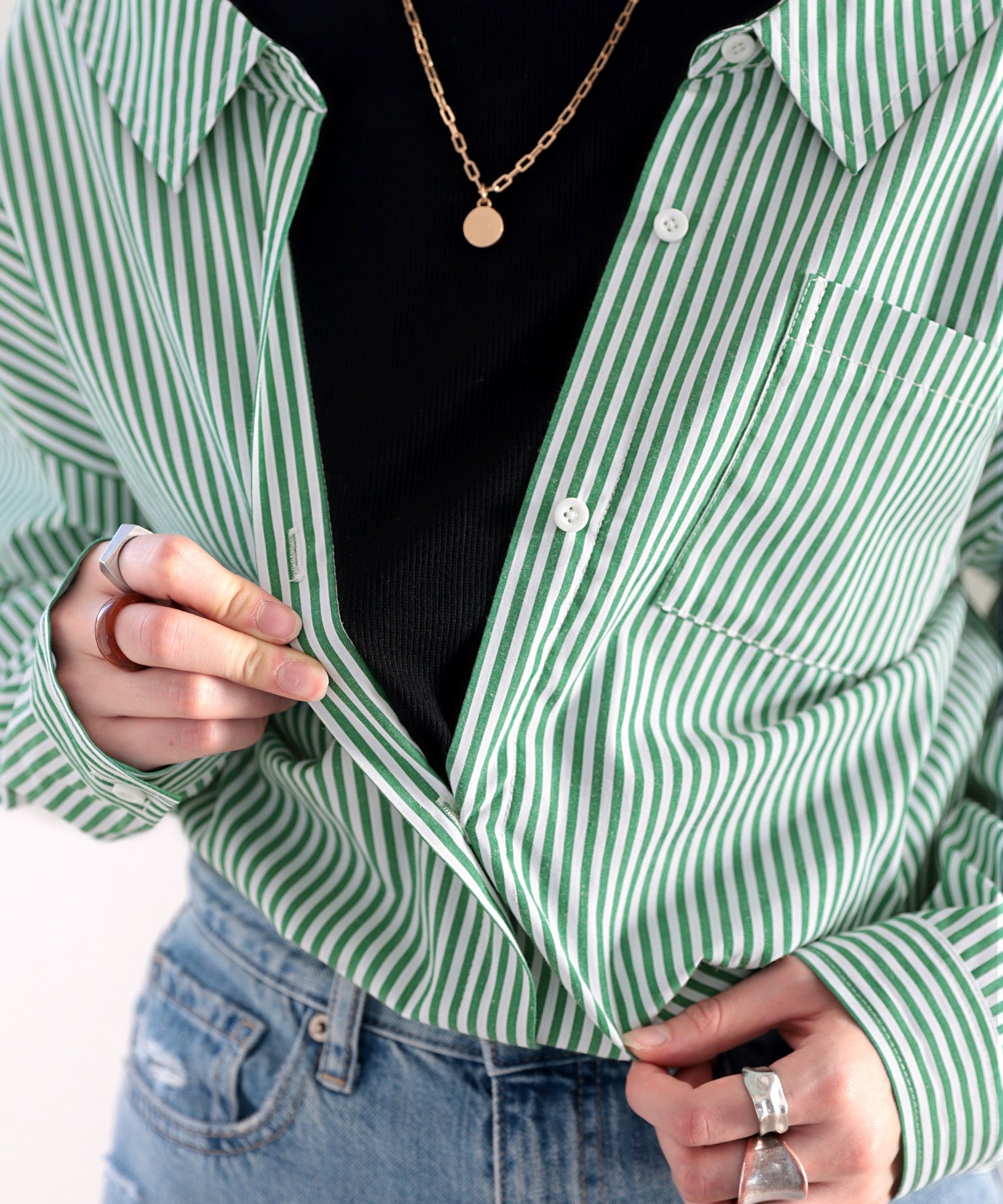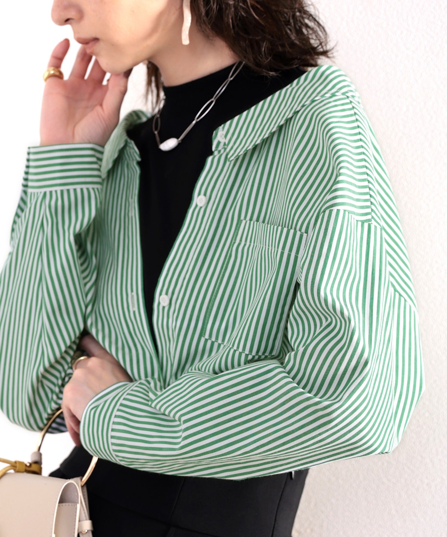 ストライプの抜き襟シャツ×黒ハイネックで旬の重ね着がすぐ楽しめる♪