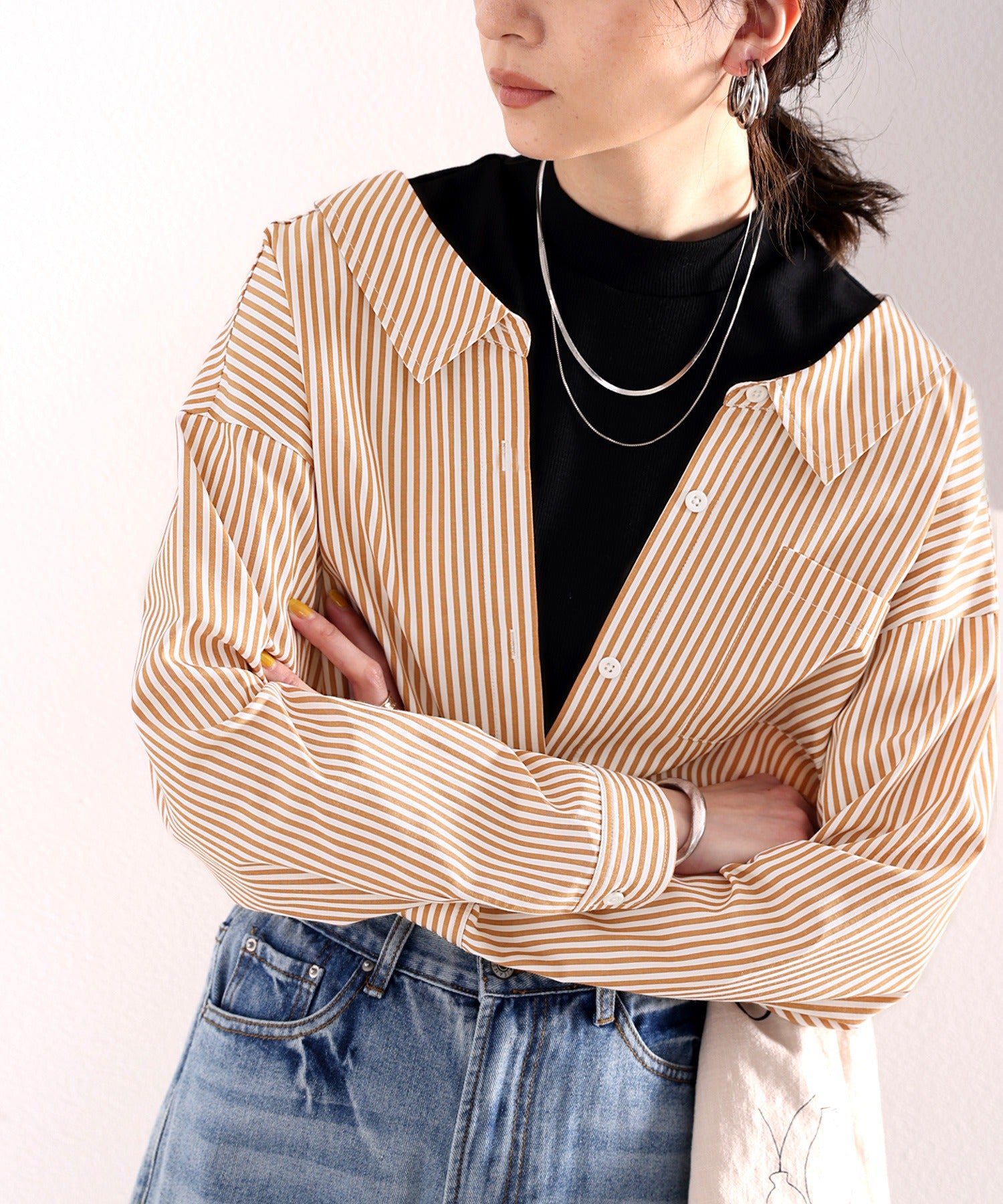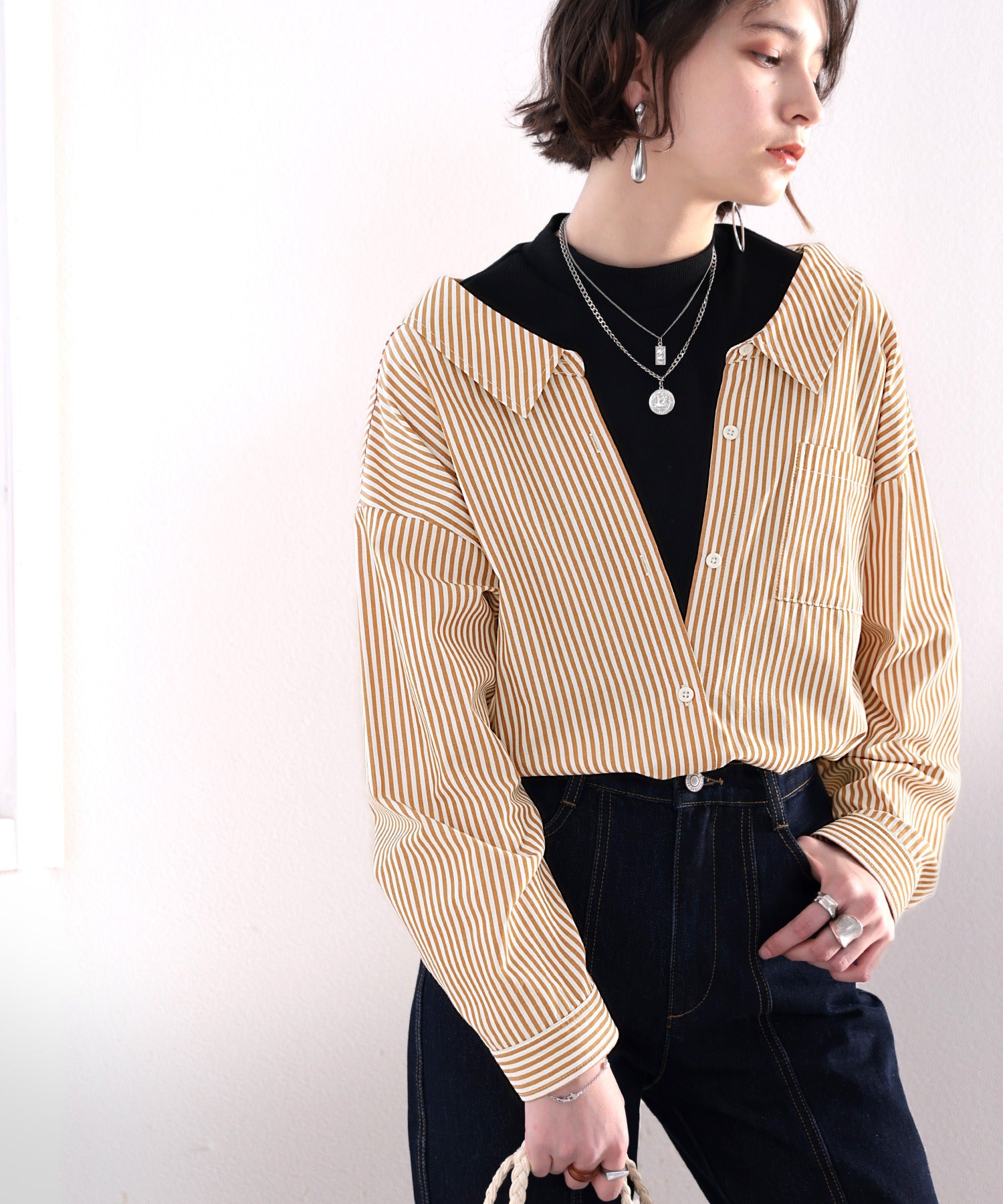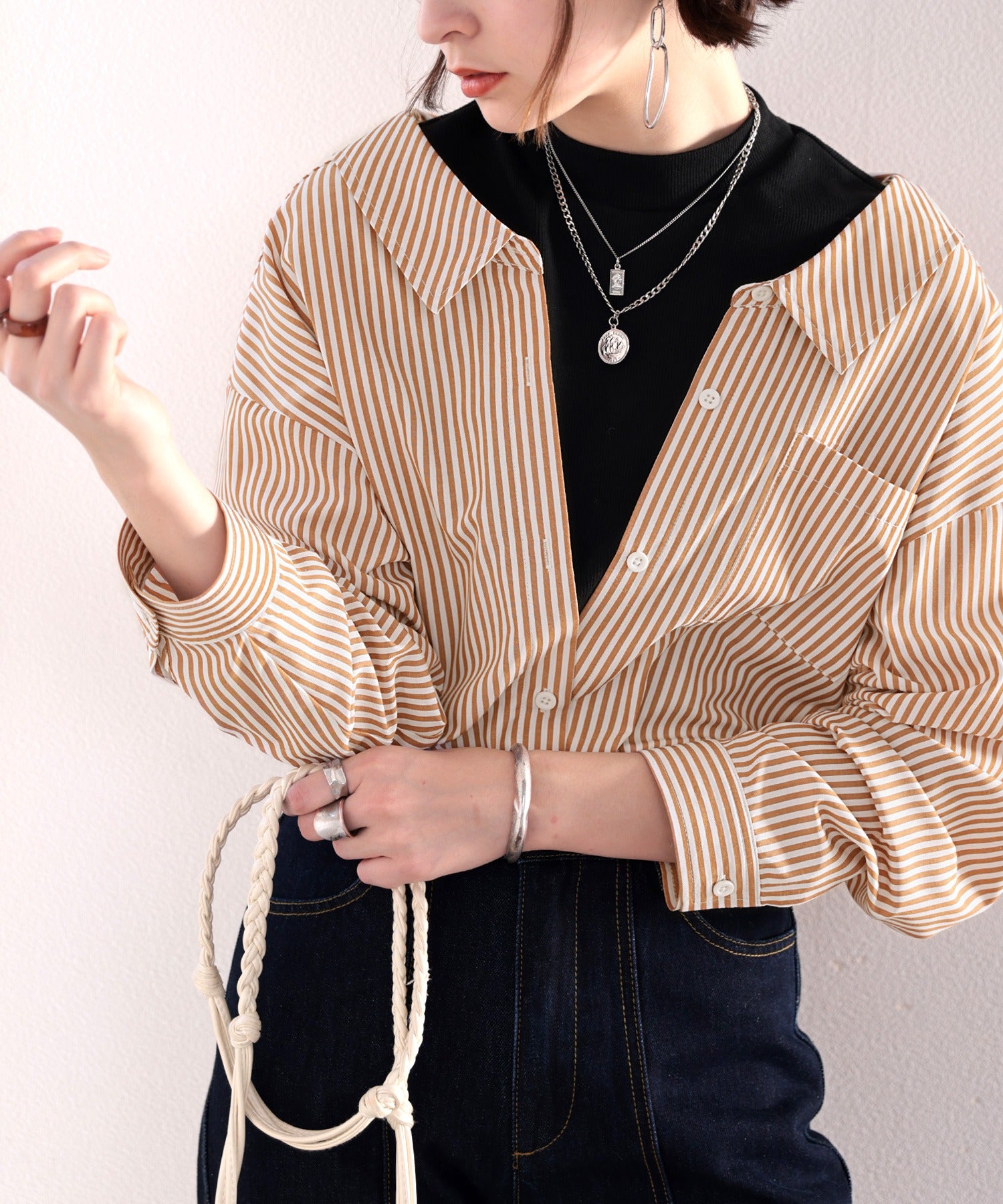 トレンドのカラーストライプシャツとハイネックカットソーがドッキング!