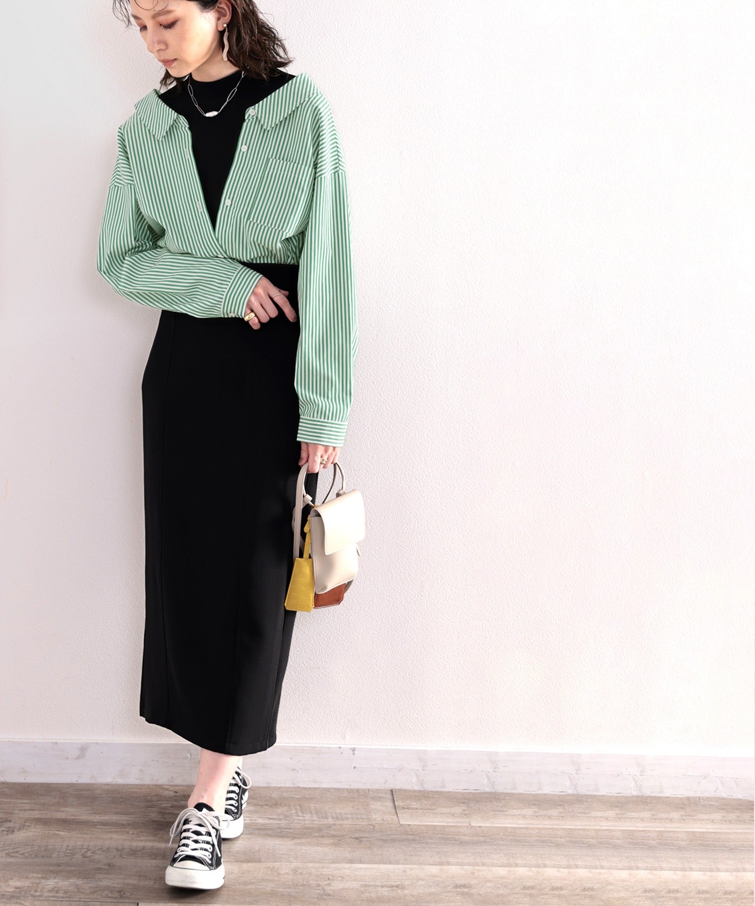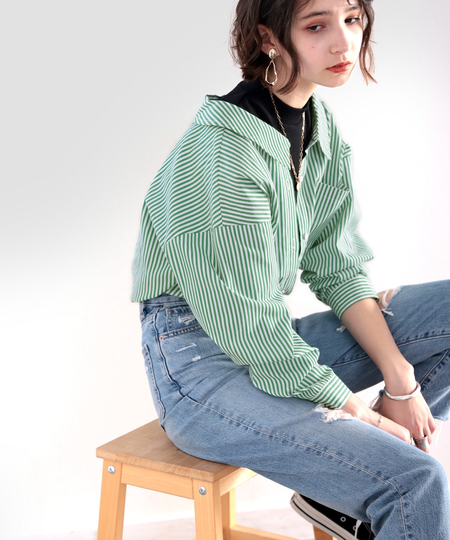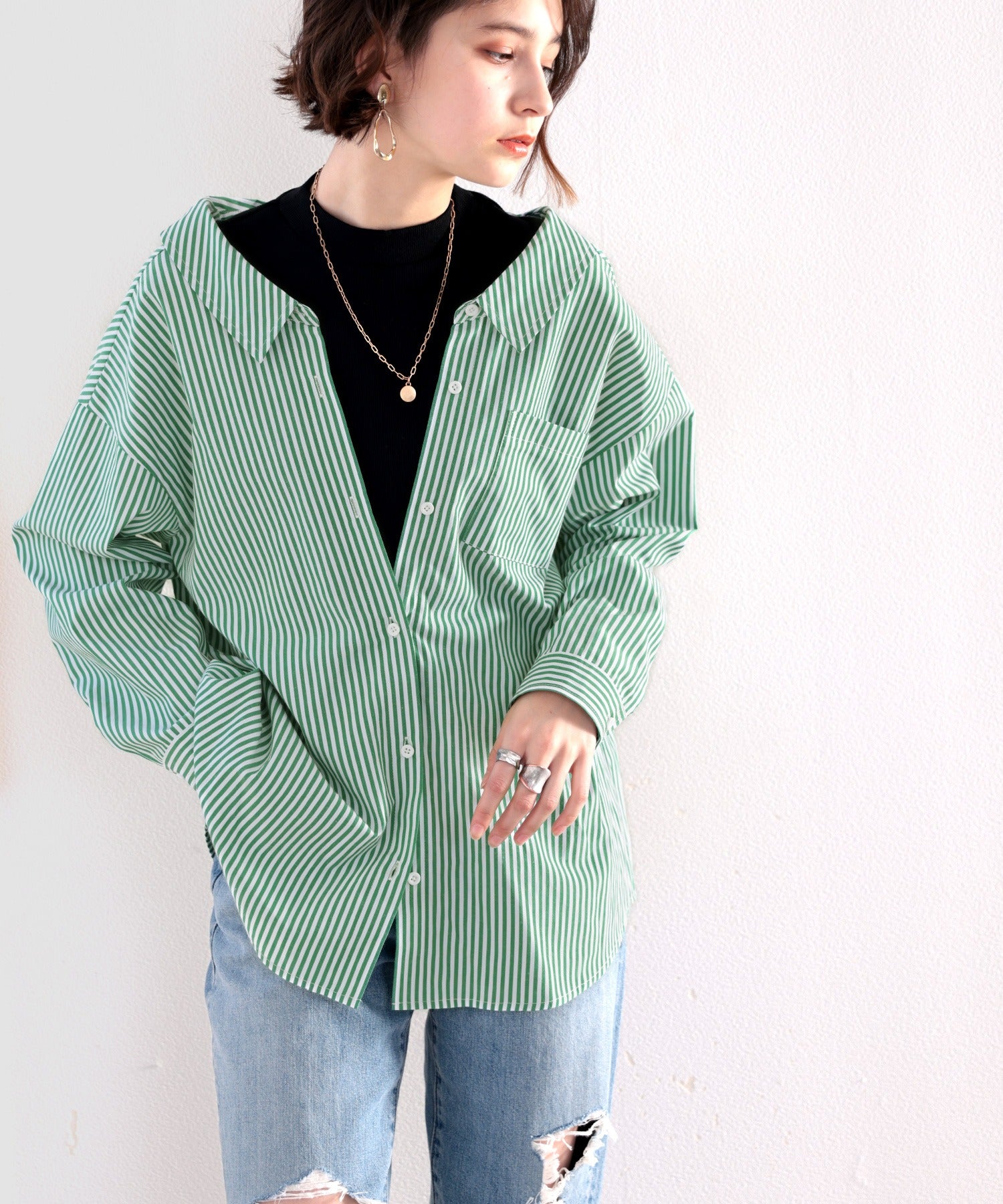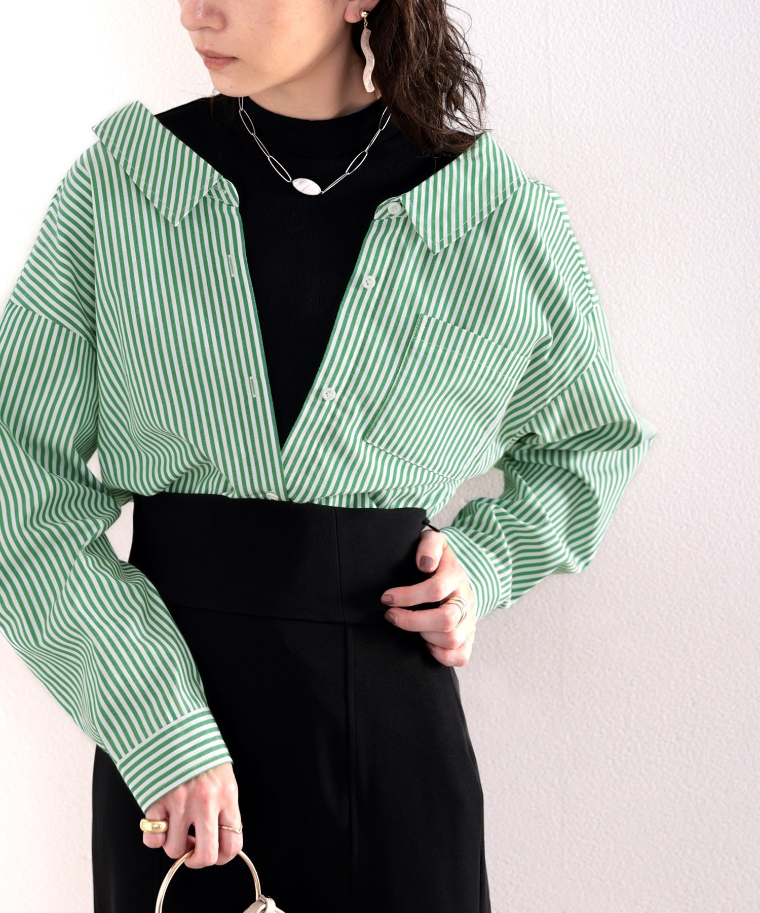 トレンドのカラーストライプシャツとハイネックカットソーがドッキング!