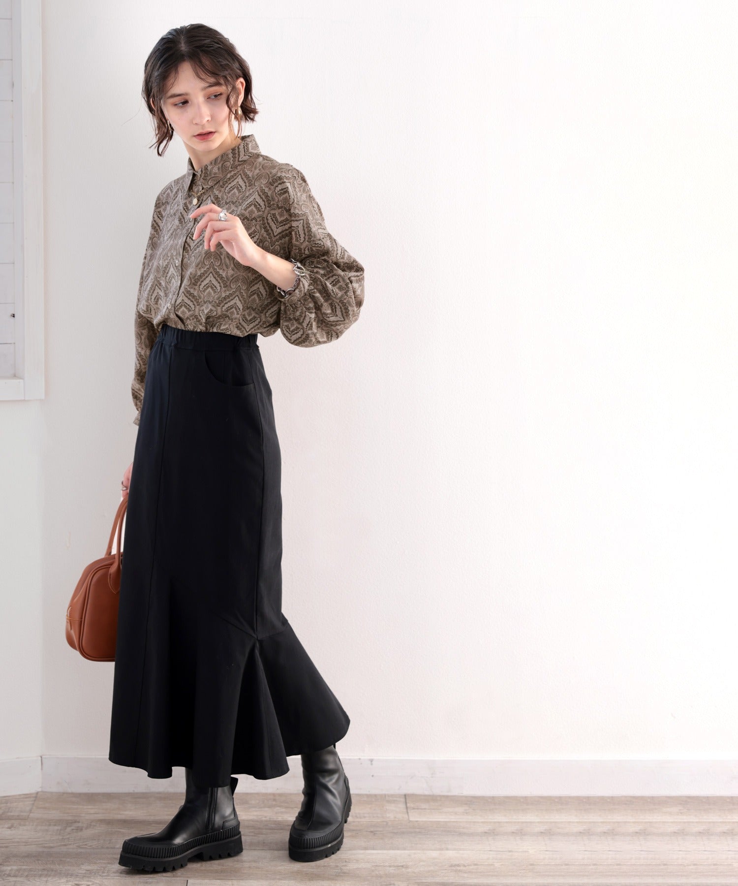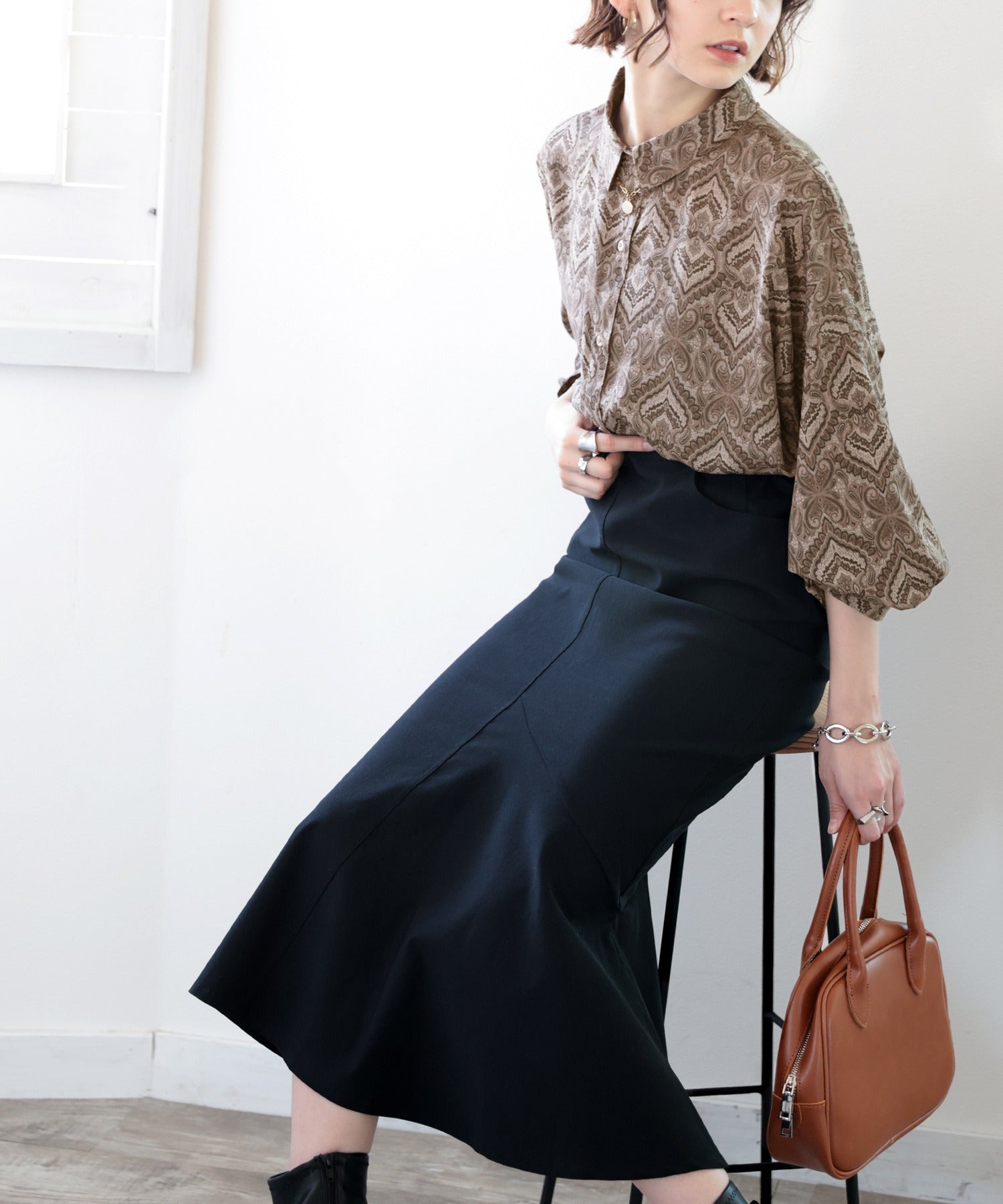 シックな黒のスカートと合わせるとモードな雰囲気にも。