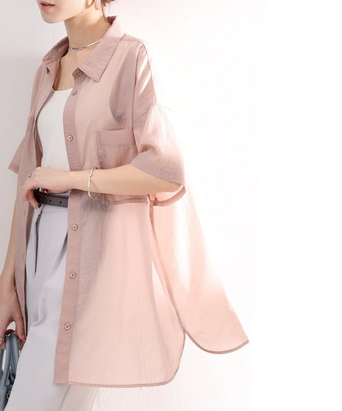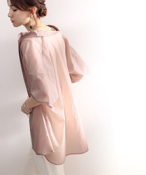 春色カラーのメンズライクシアーシャツ。