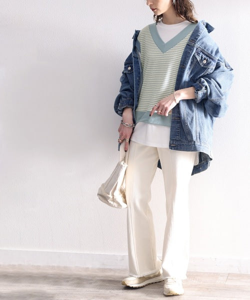 シンプルボトムスに合わせるだけで、簡単におしゃれな重ね着コーデが完成します。
