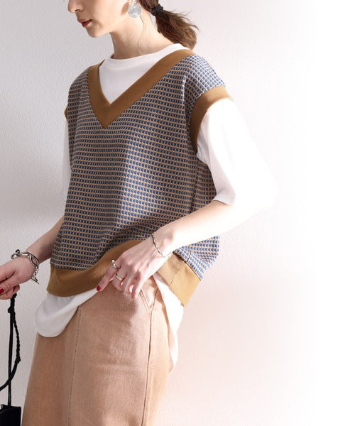ベストは表面感ある配色ドット幾何学柄で、クラシカルに仕上げました。