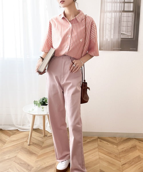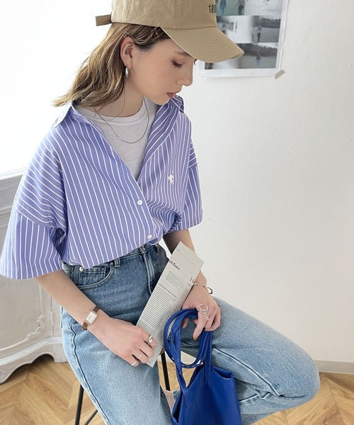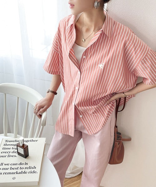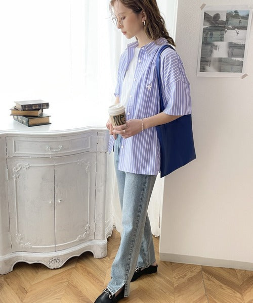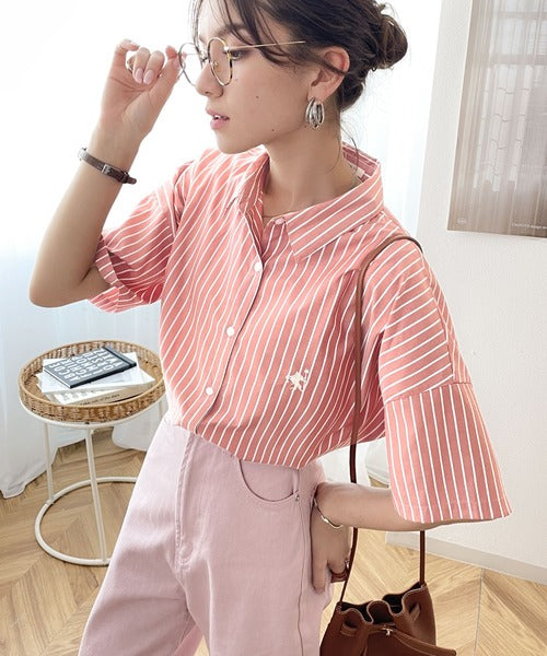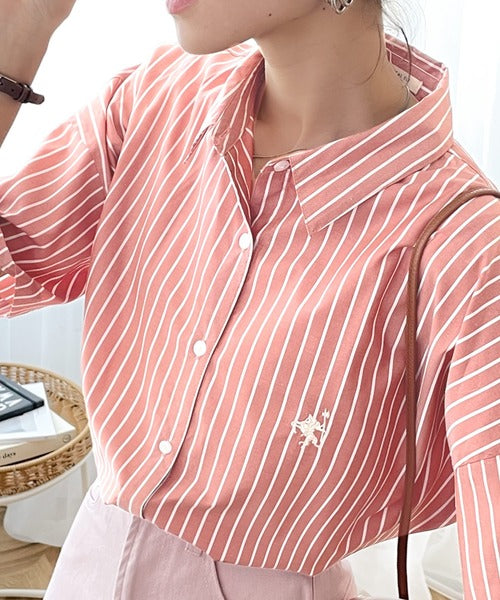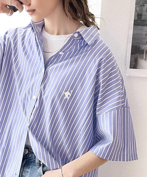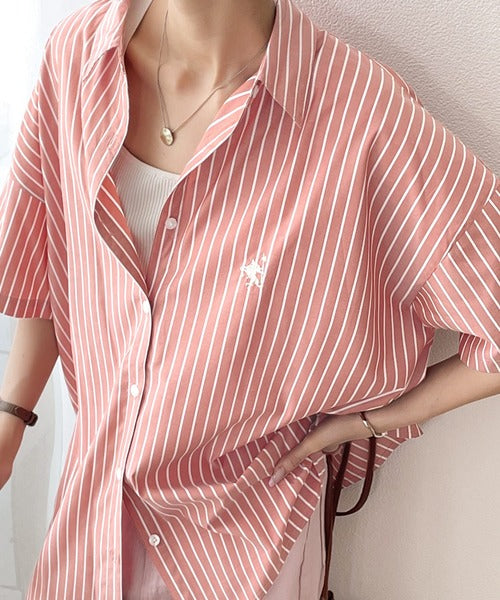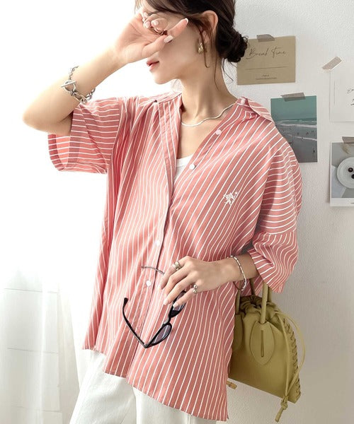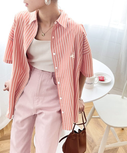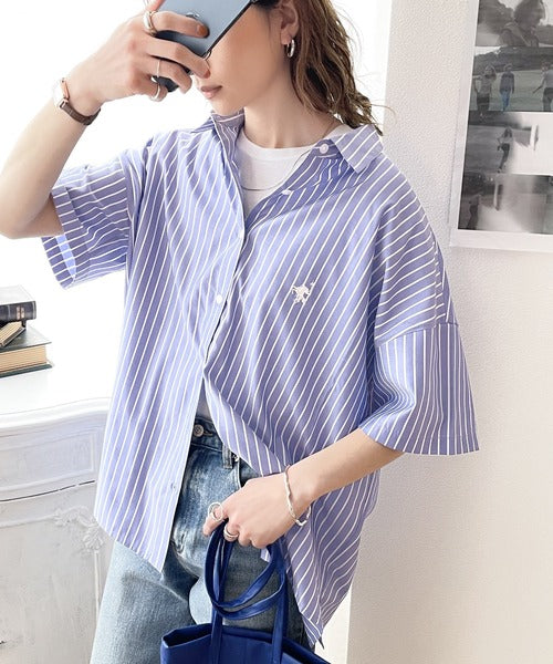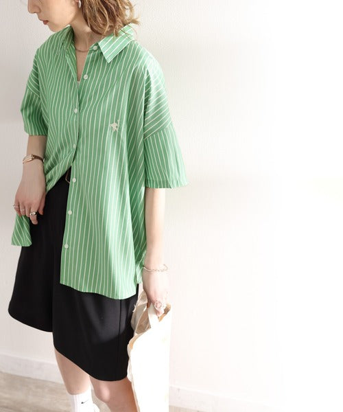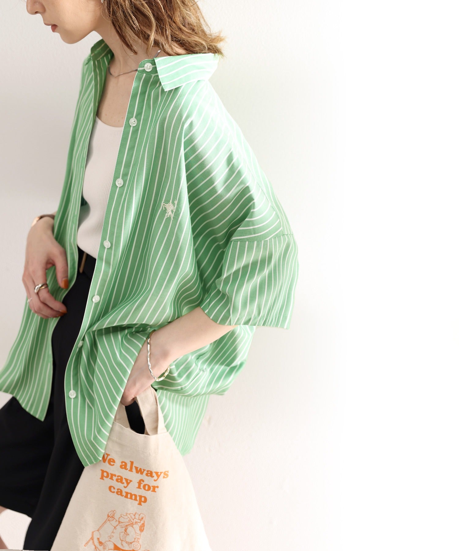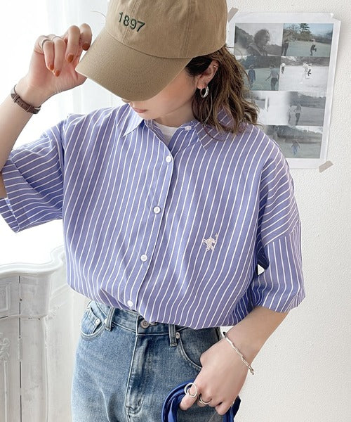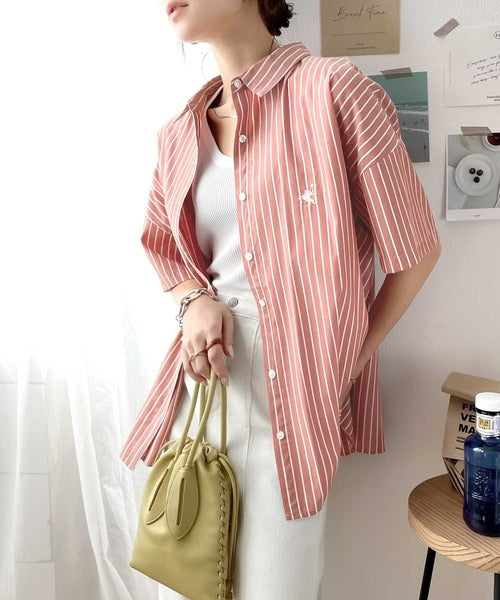 Happyストライプ!ワンポイント刺繍5分袖丈オーバーシャツ ce1010089