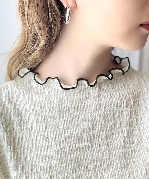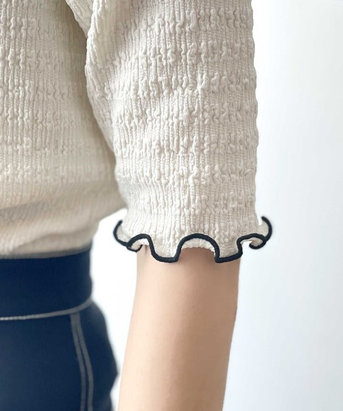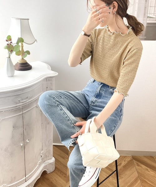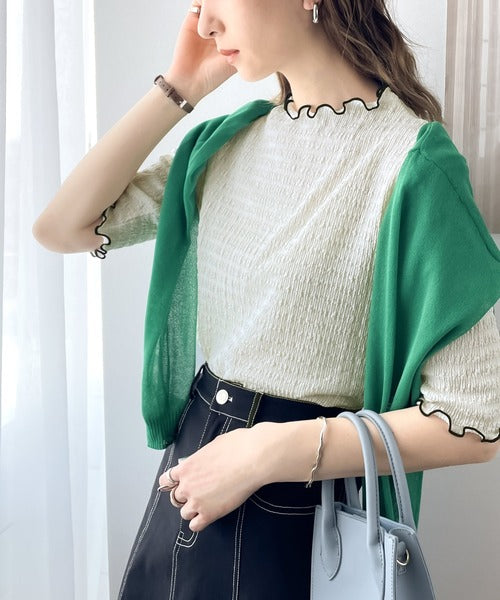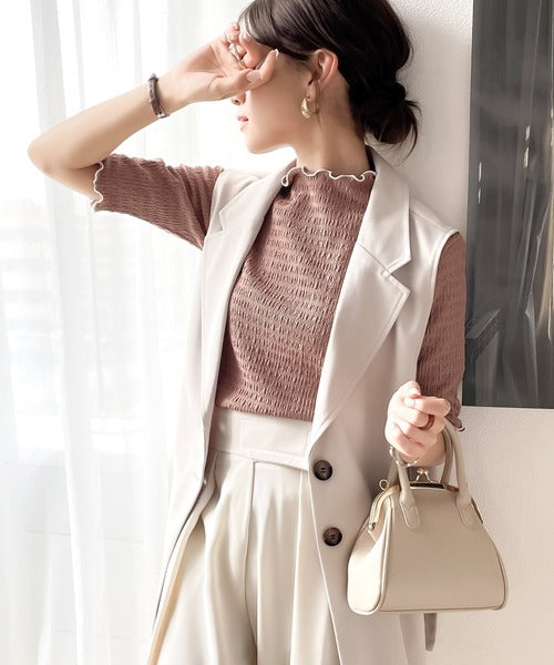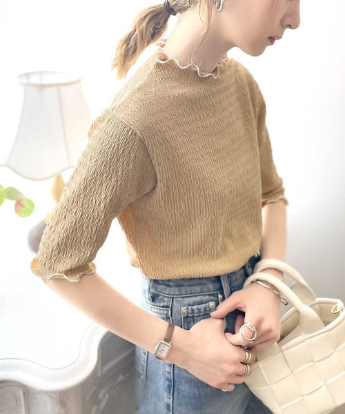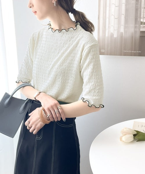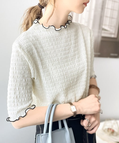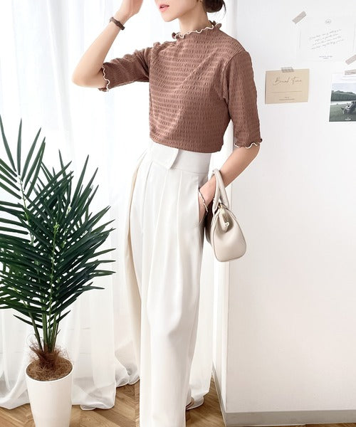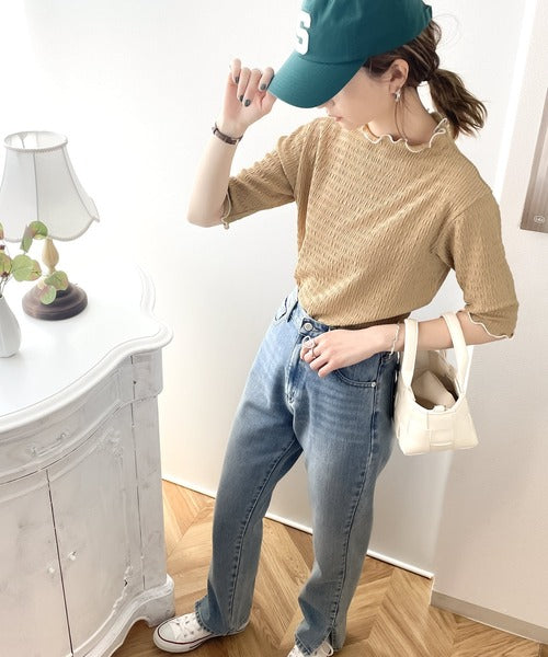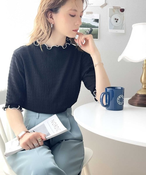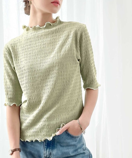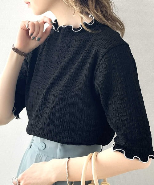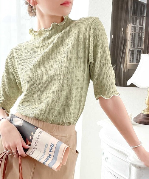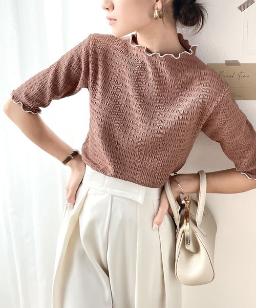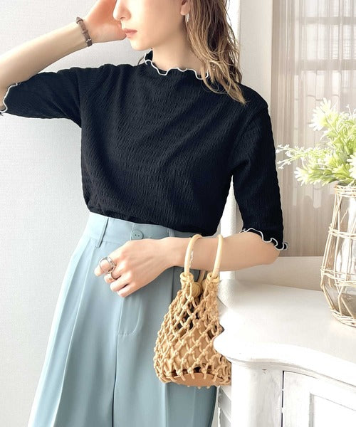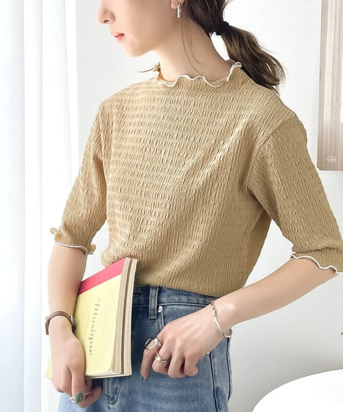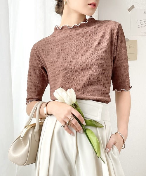 華やぐ1枚。配色メロウハイネック5分袖トップス ce1010137