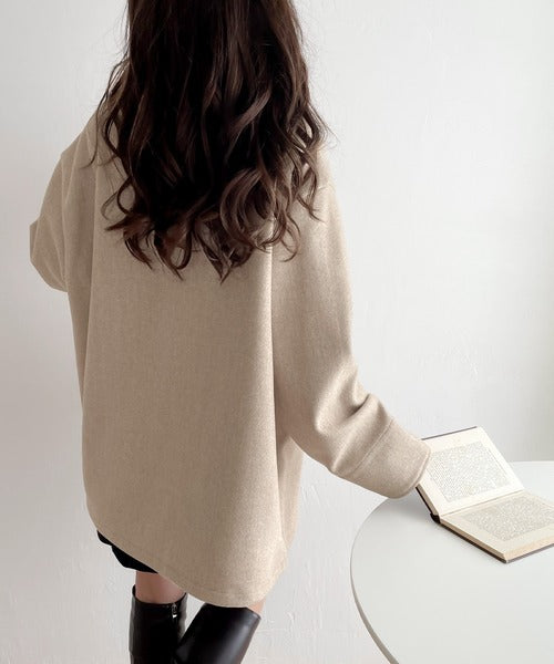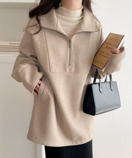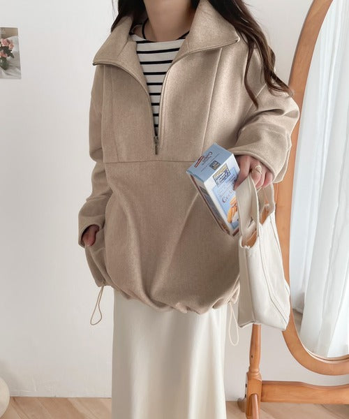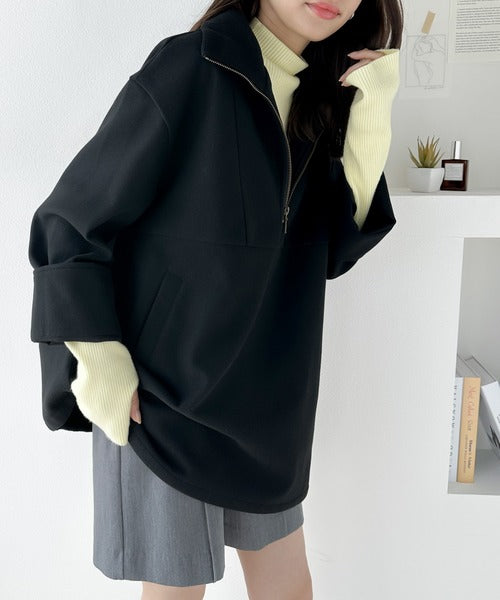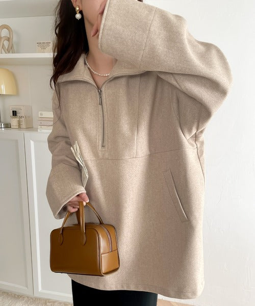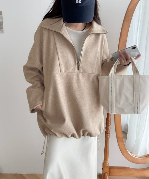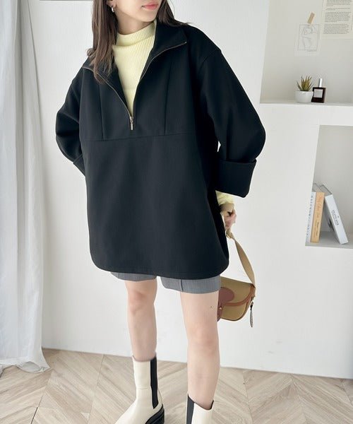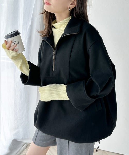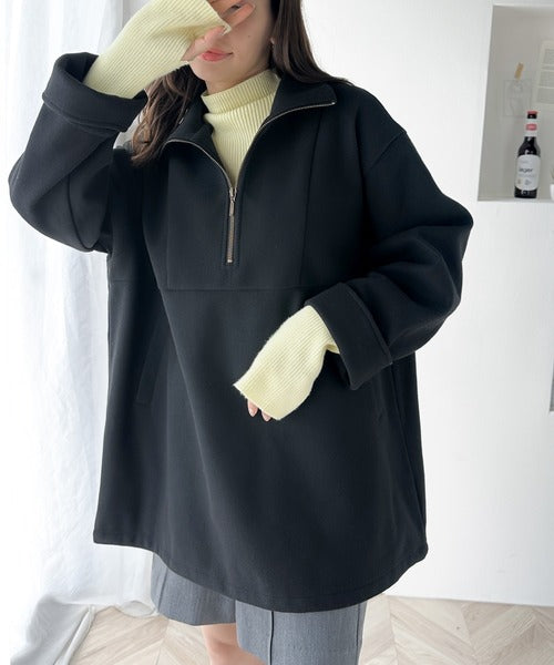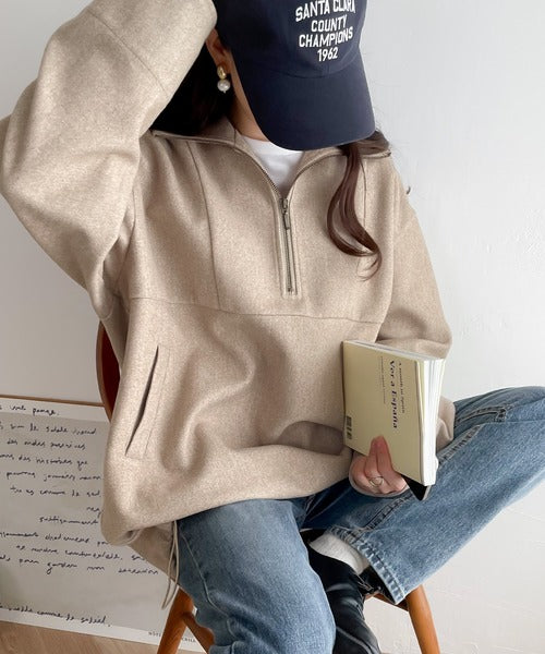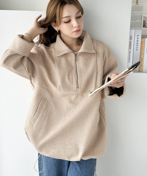 リラックス感のあるオーバーサイズのハーフジッププルオーバー。