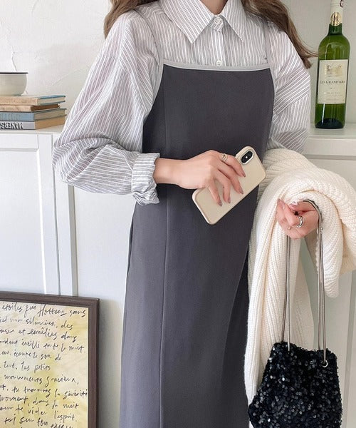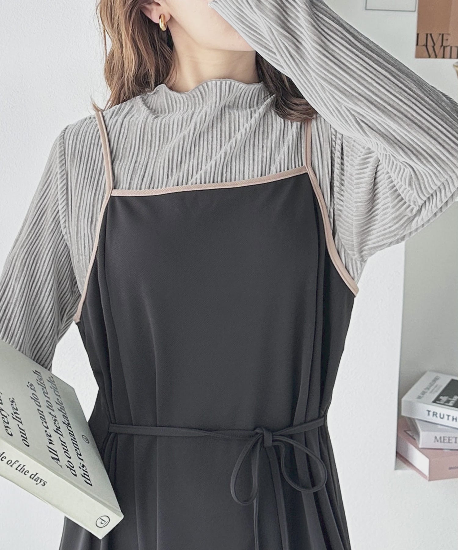 ワンピースと素材感が異なるものを選ぶと、スタイリングが
