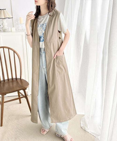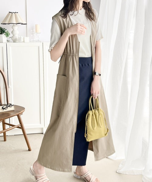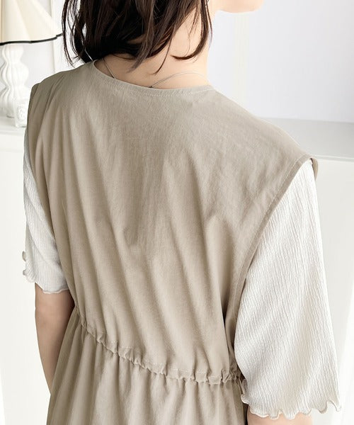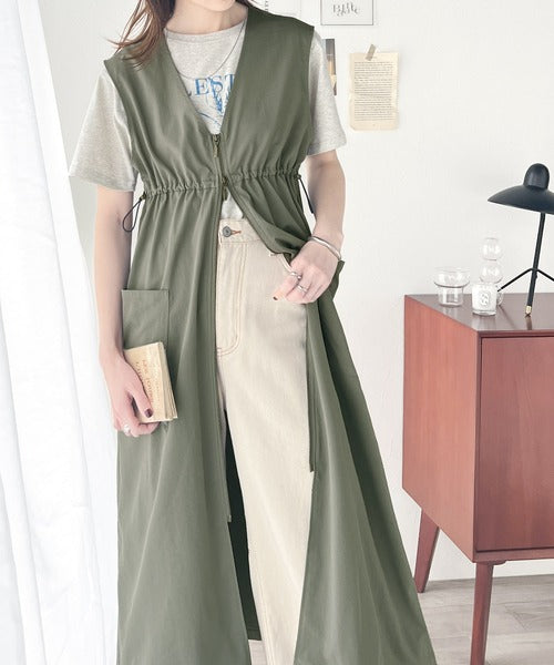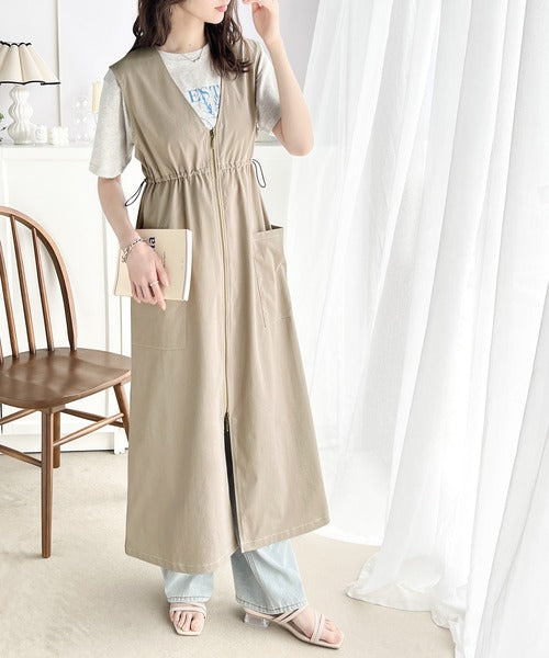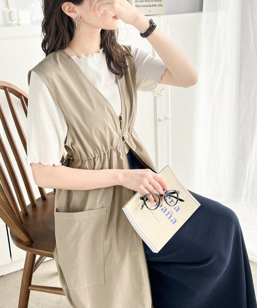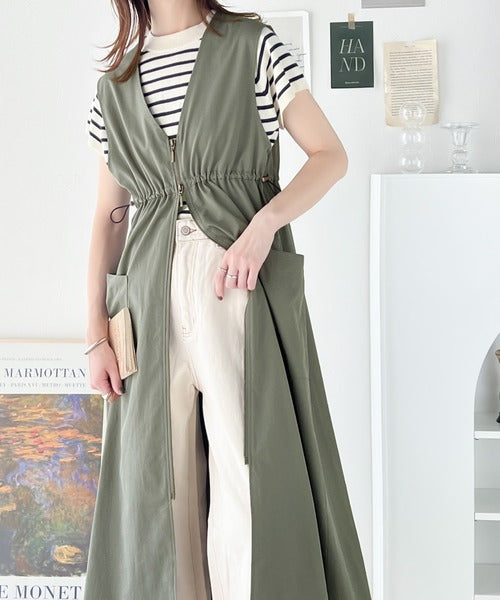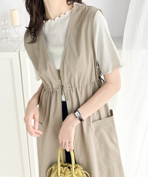 深めのVネックとシルエットが大人可愛いジレワンピース。