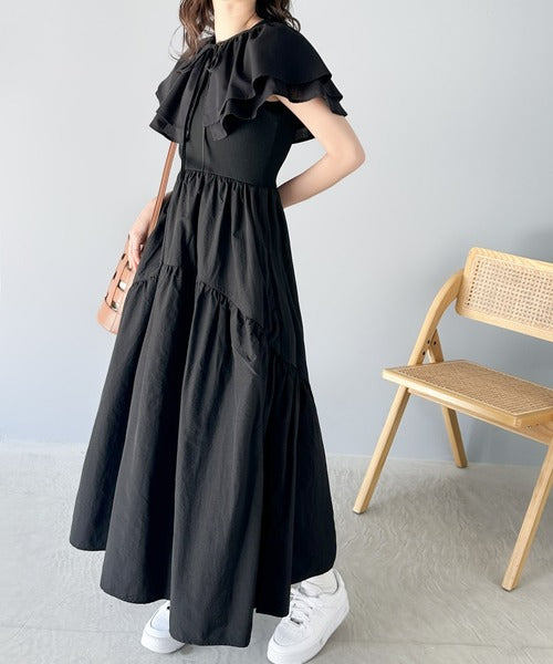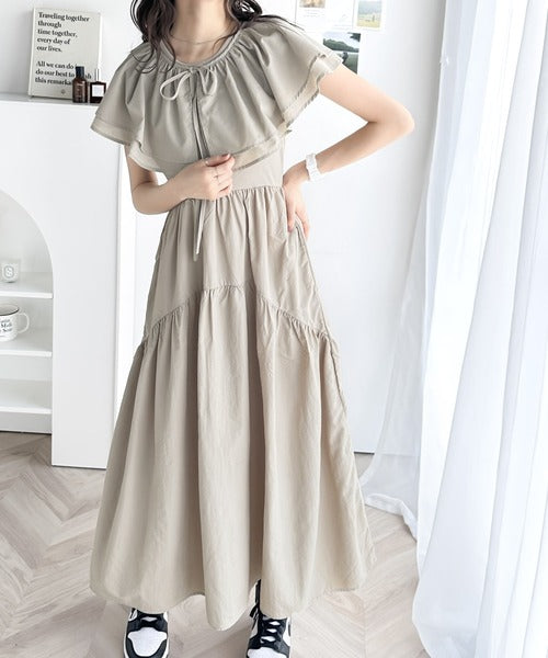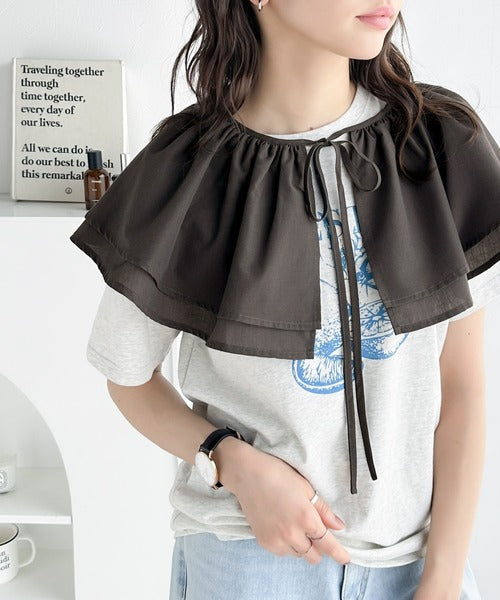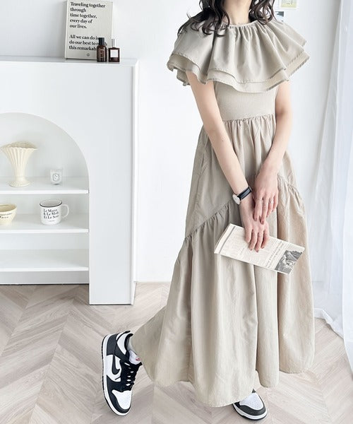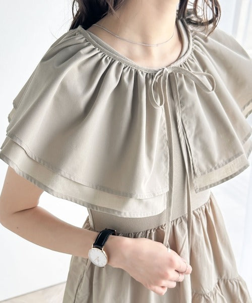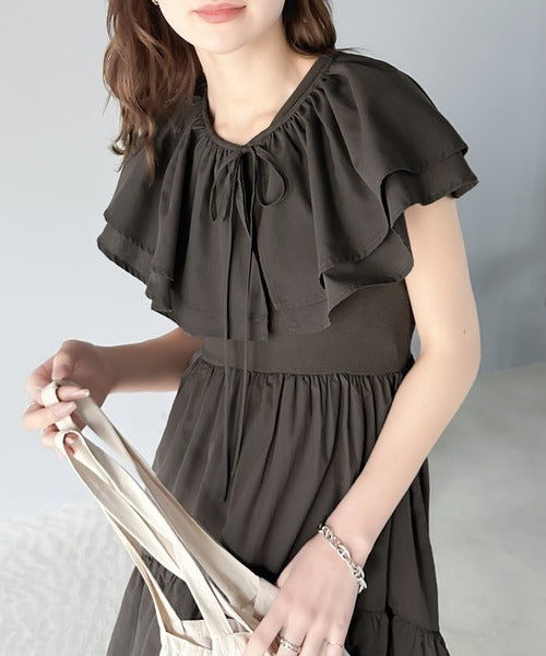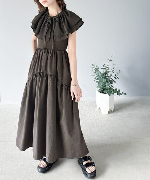 たっぷりギャザーが入ったフリルカラーはワンピースと合わせてるのはもちろん、