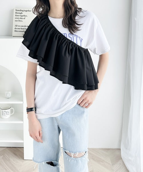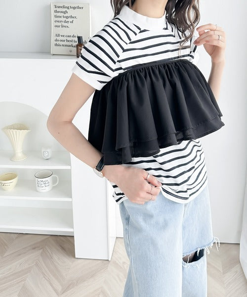 【素材】 上身頃:ポリエステル96%、ポリウレタン4% 下身頃:ナイロン100% フリル部分:ポリエステル80%、綿20%