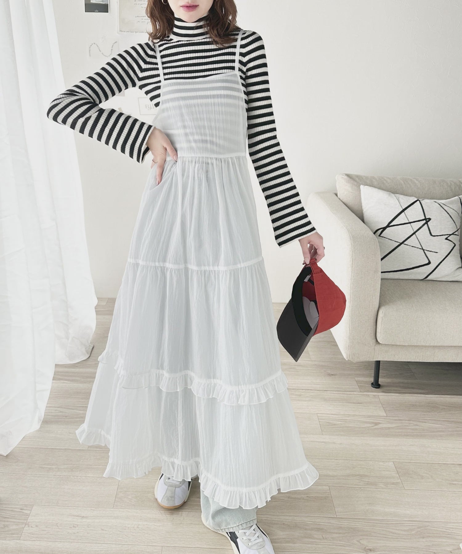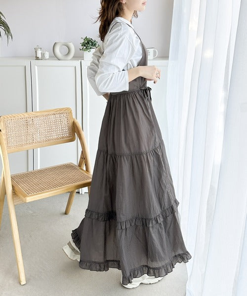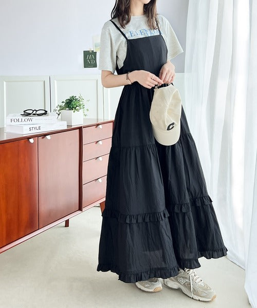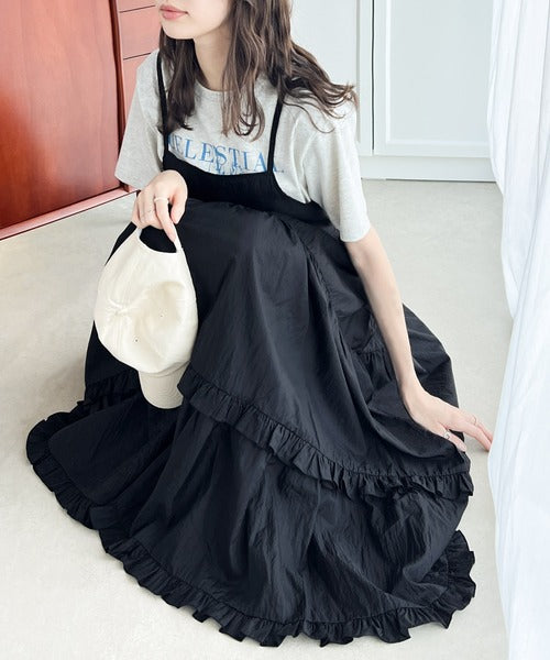 細い肩紐とボリュームのあるティアードスカートのバランスが