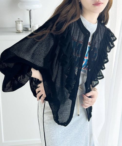 甘いディテールのフリルも、スタンドカラーとメッシュ素材で大人ニュアンス。