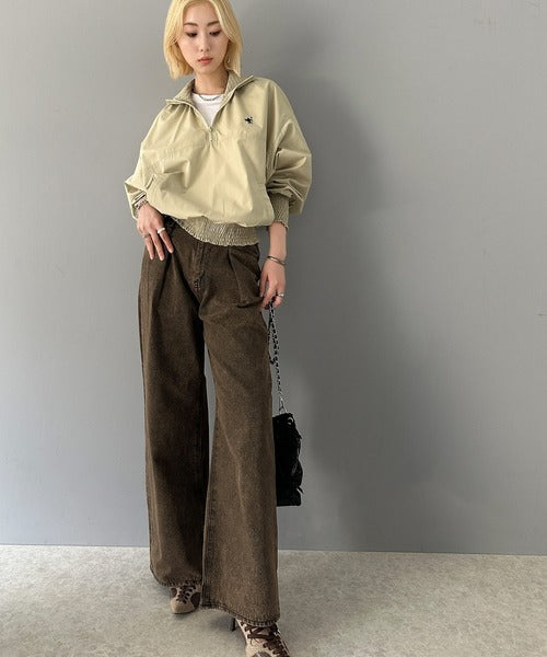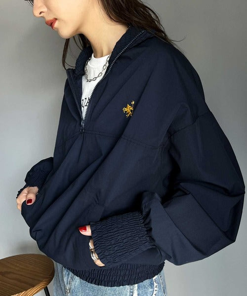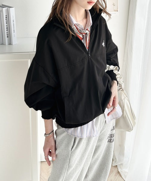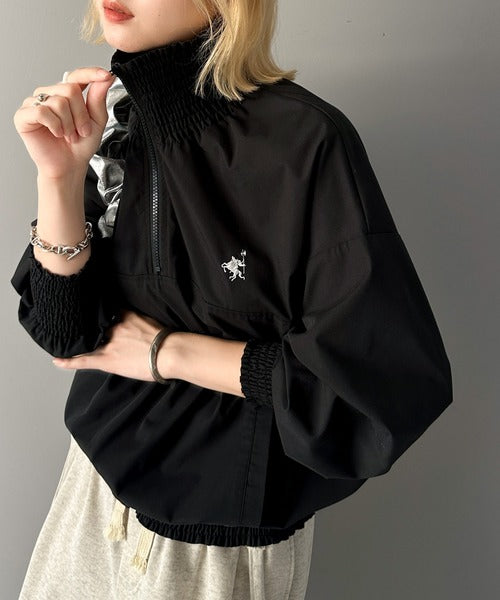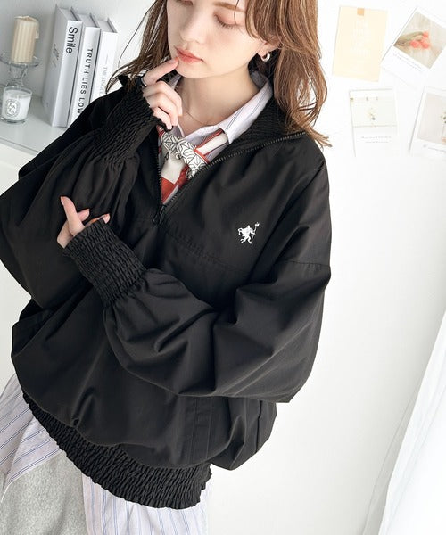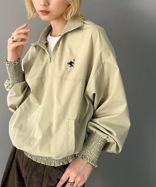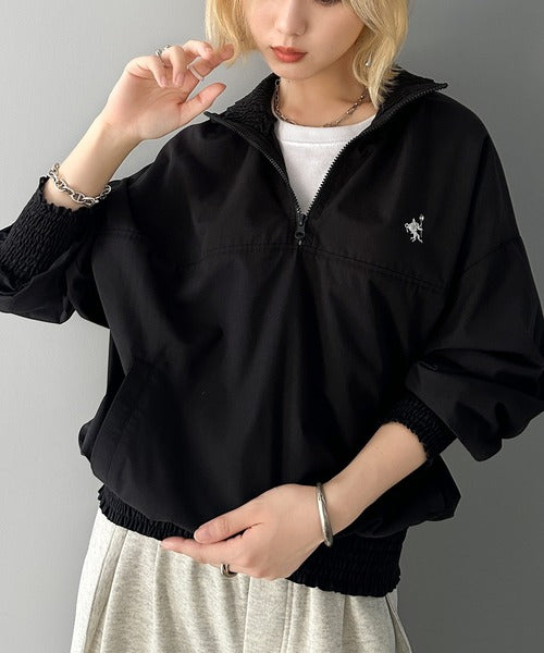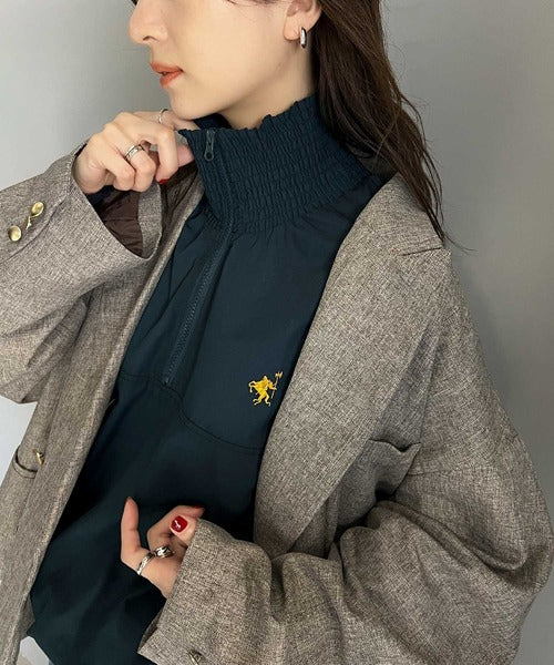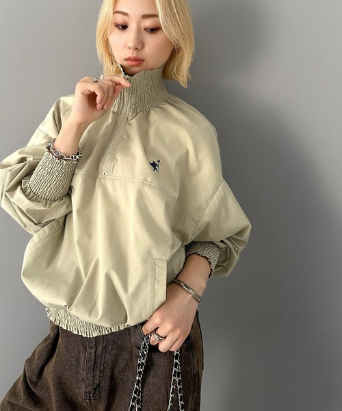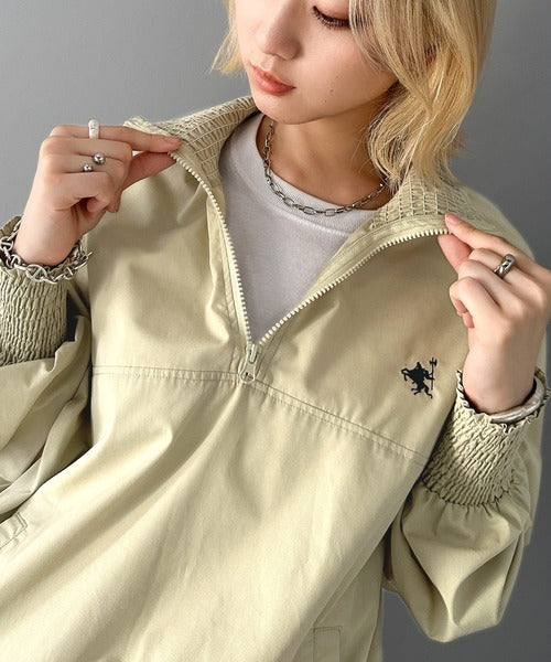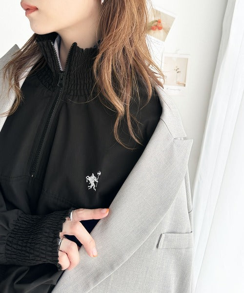シャーリングになったハーフジップの開閉具合でトップス感覚でも、アウターとしても着用できるプルオーバー。