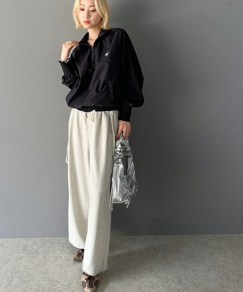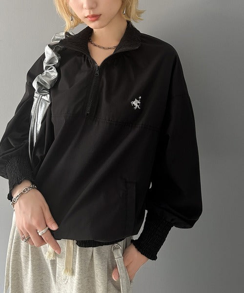 衿・袖口・裾のシャーリングがアクセントになったハーフジッププルオーバー。