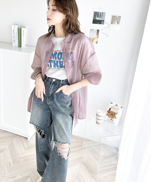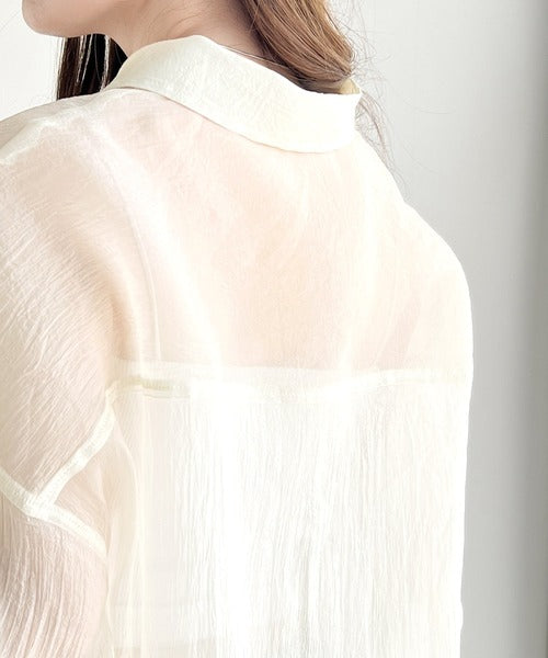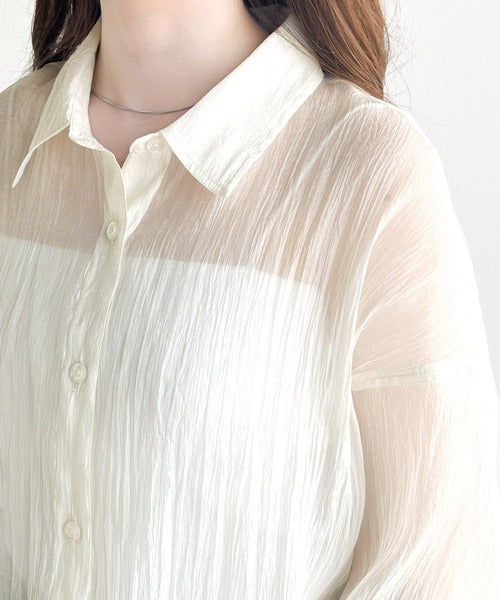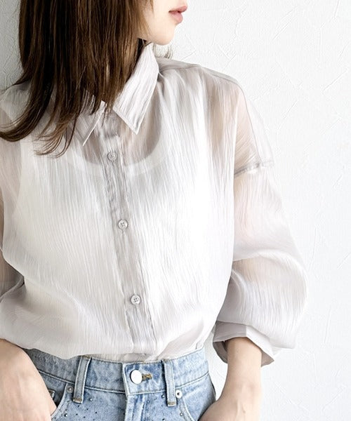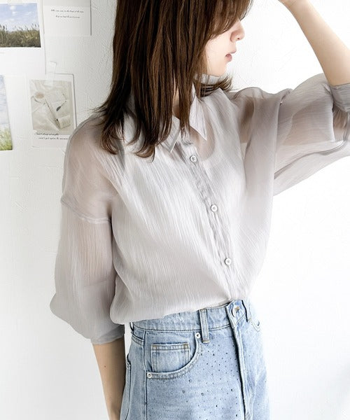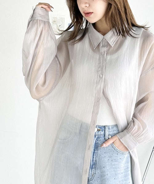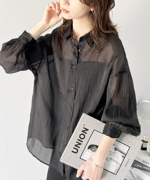 トレンドの微光沢感あるシアー素材を使用したゆるシルエットシャツです。