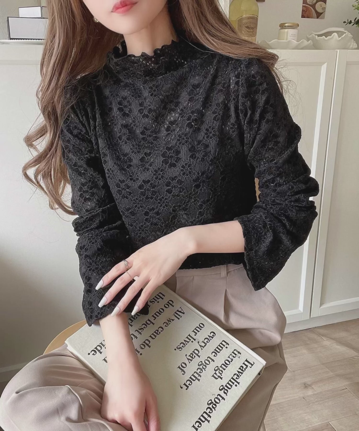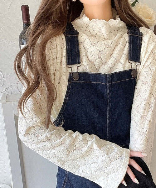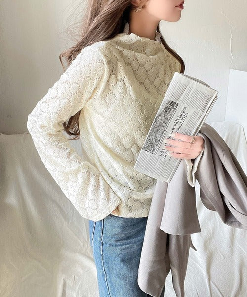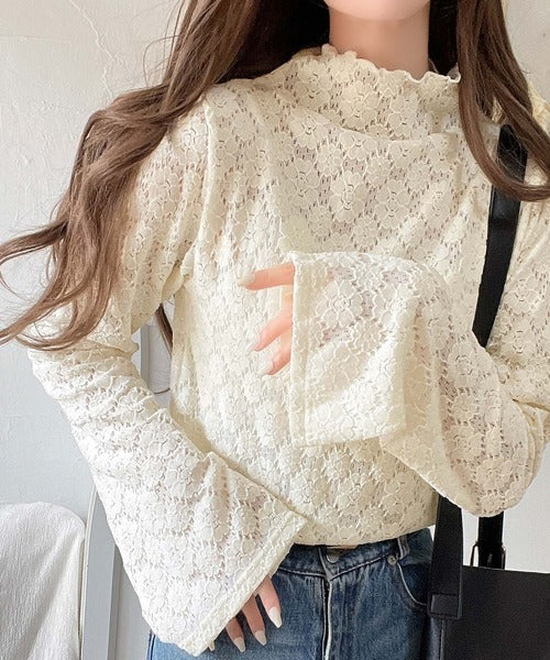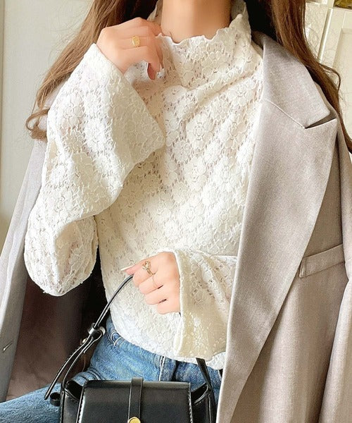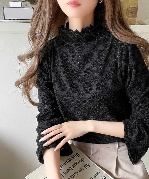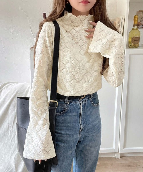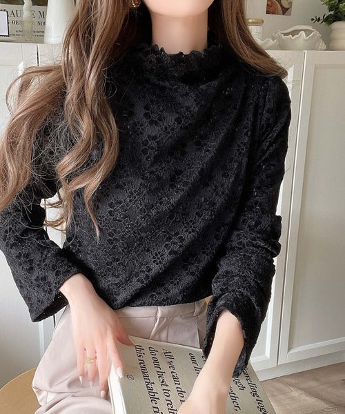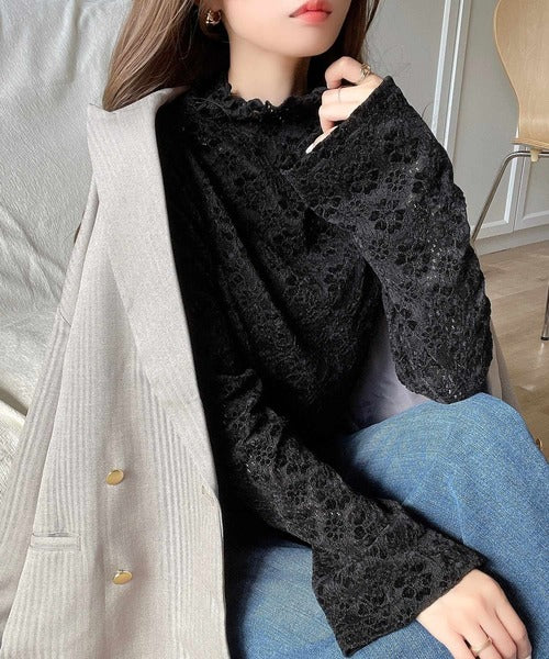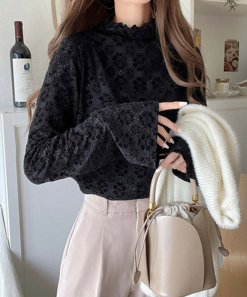 フレア袖フラワー起毛レースハイネックトップスの登場。