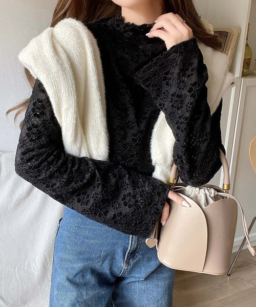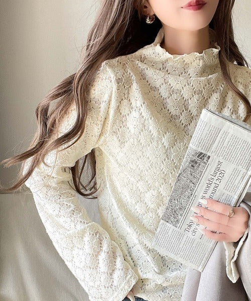 起毛感のある花柄レースがフェミニンな印象の、トレンド先取りプチハイネック。