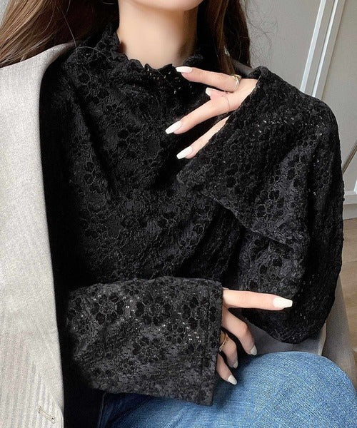 華やかさ漂う大人レディな印象。フラワー起毛レースフレア袖ハイネックプルオーバー ce1010364