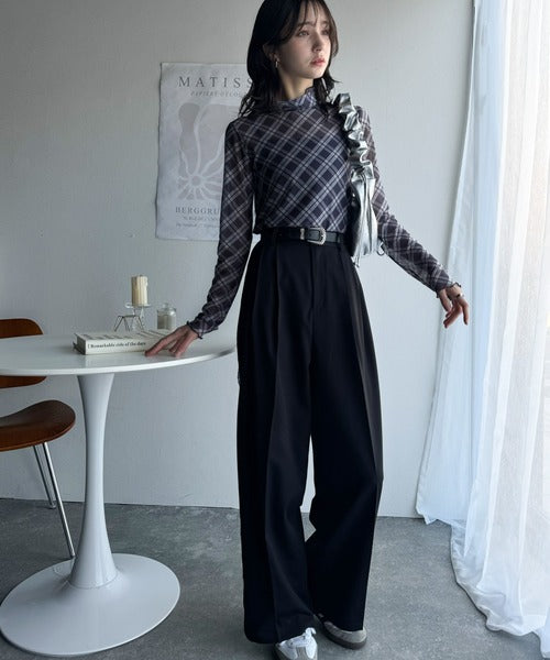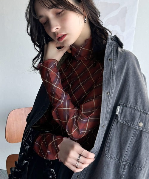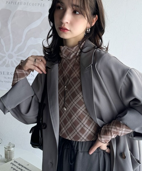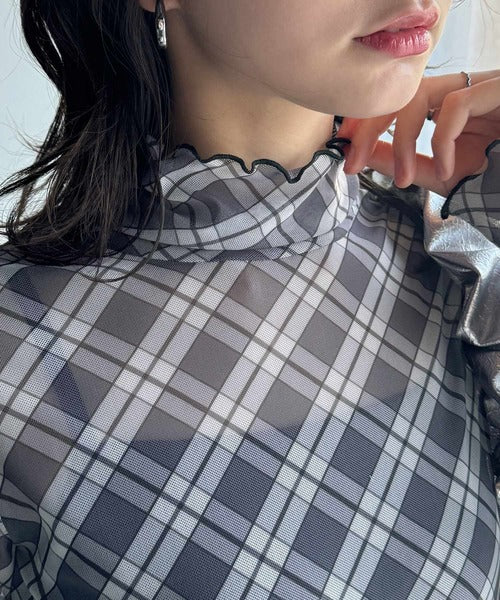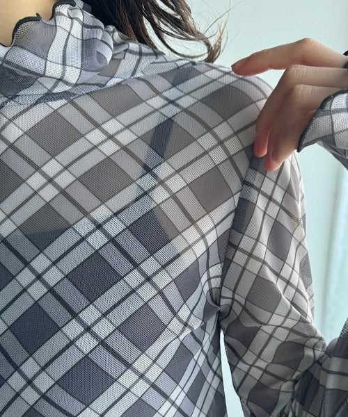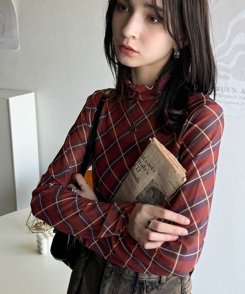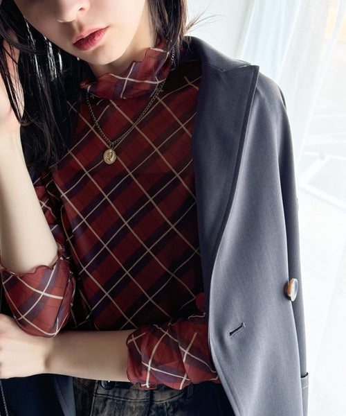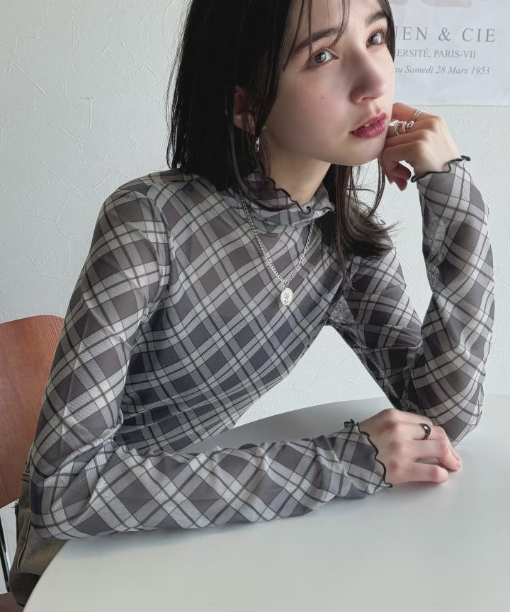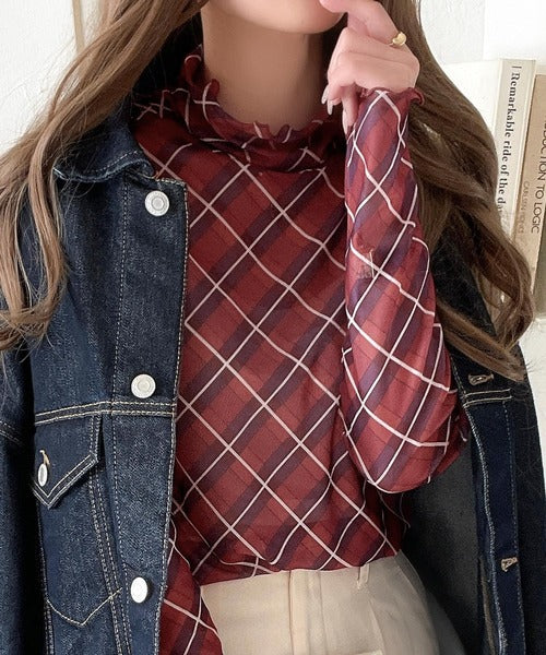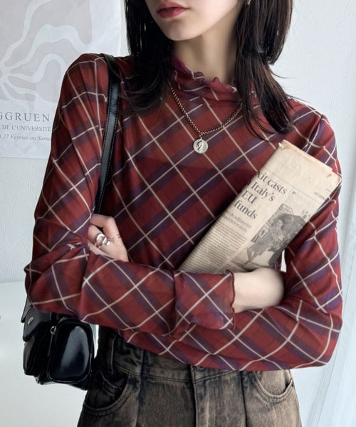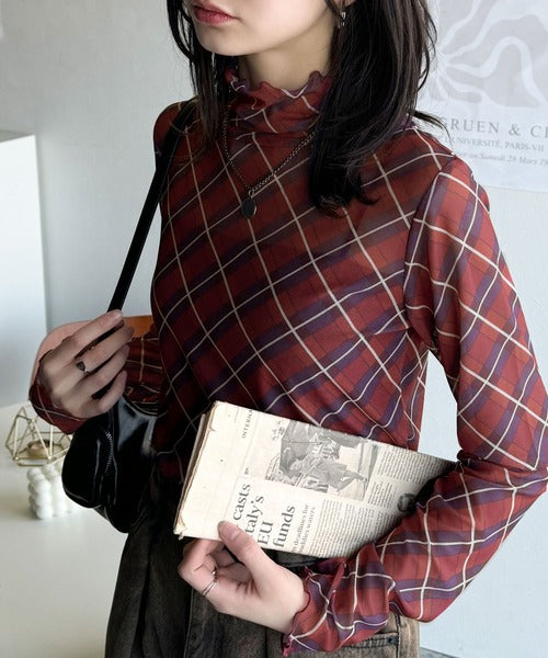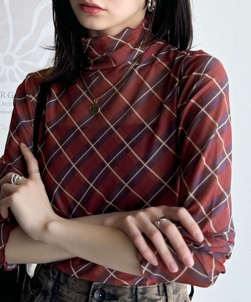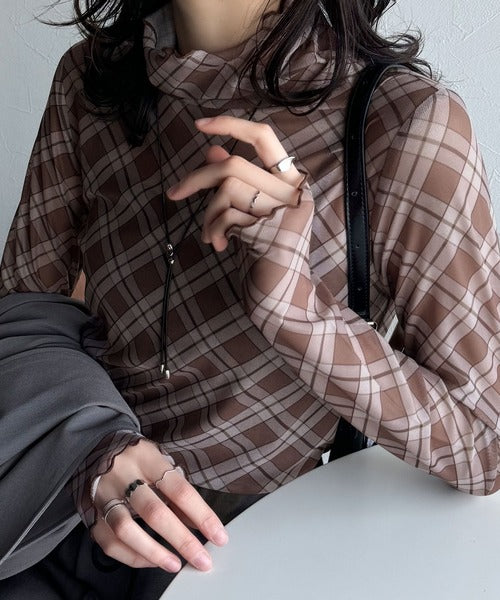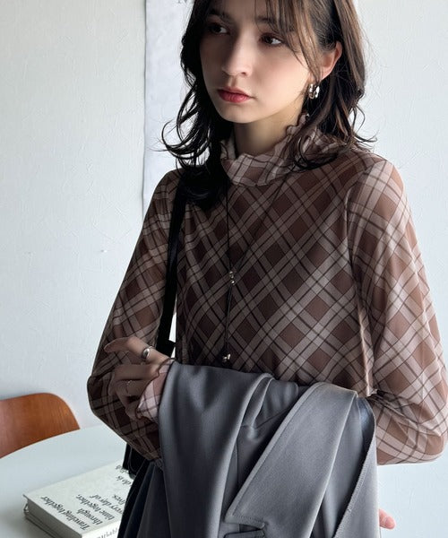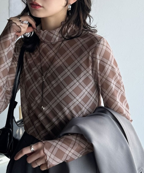 洗練された魅力を引き出す。チェックシアーハイネックメロウトップス(長袖) ce1010418