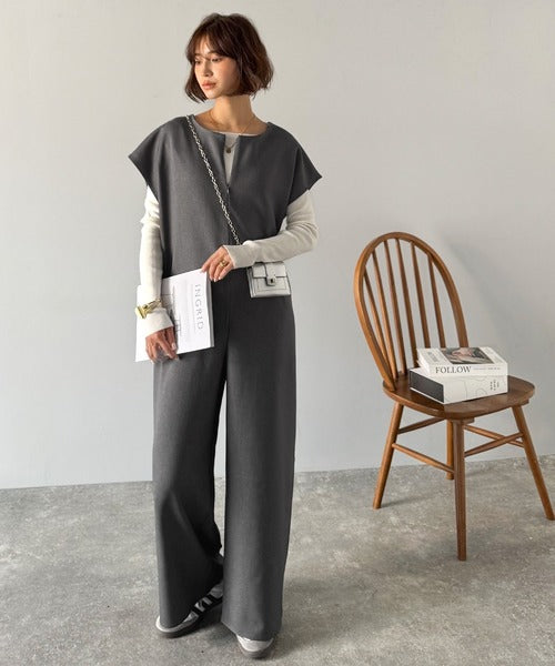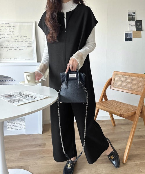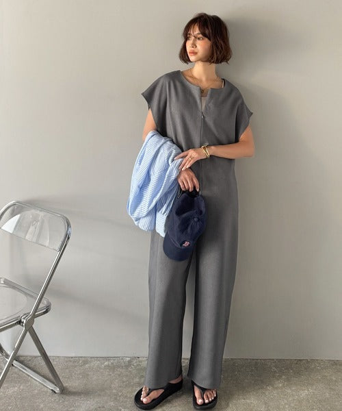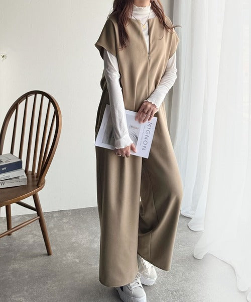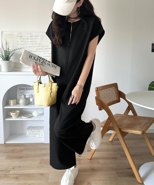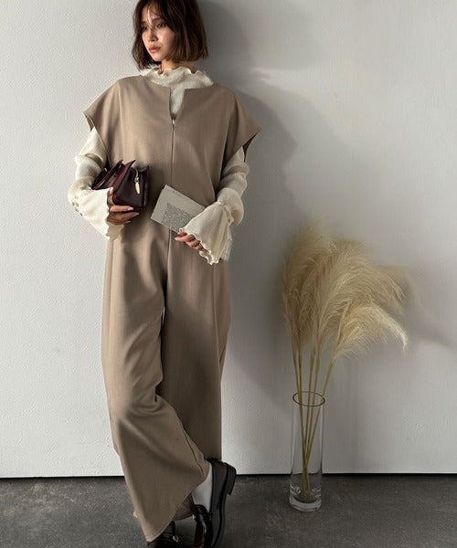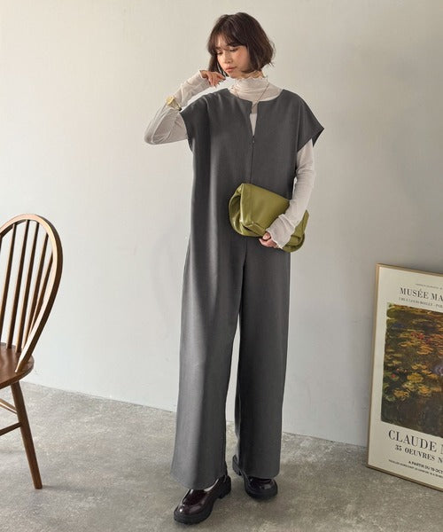 シンプルながら大人の抜け感を演出できるハーフジップオールインワン。