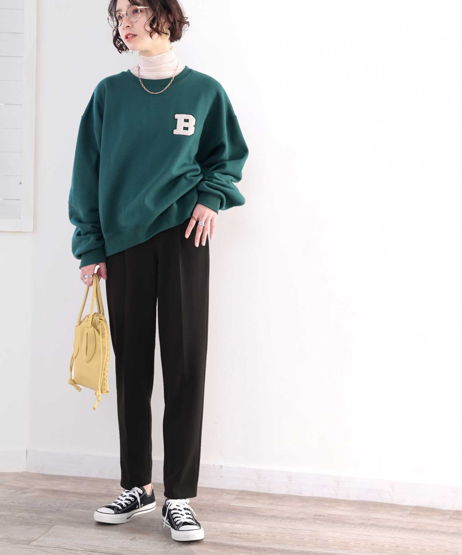 シンプルなデザインなので、足元はスニーカーと合わせればカジュアルスタイルに。