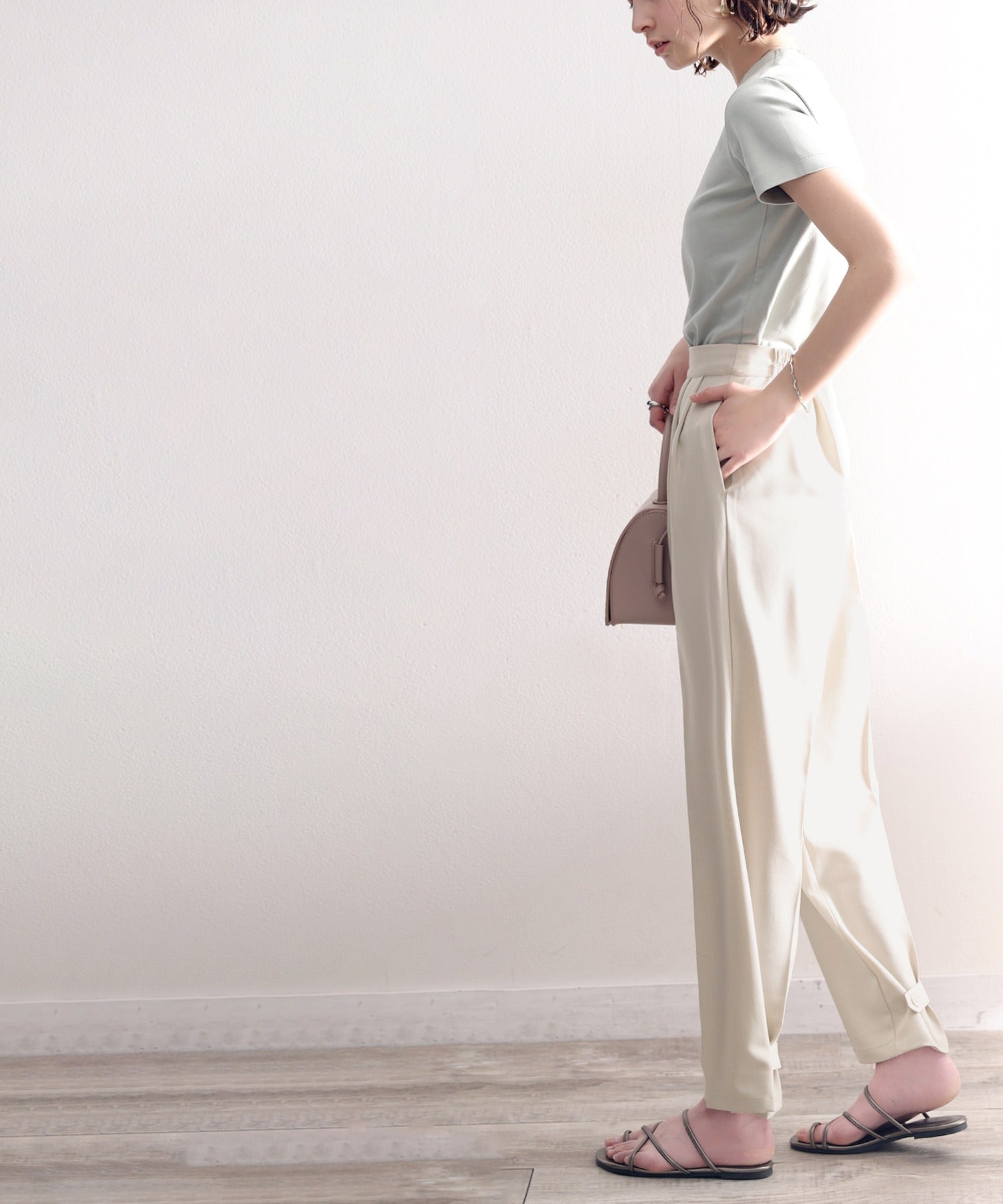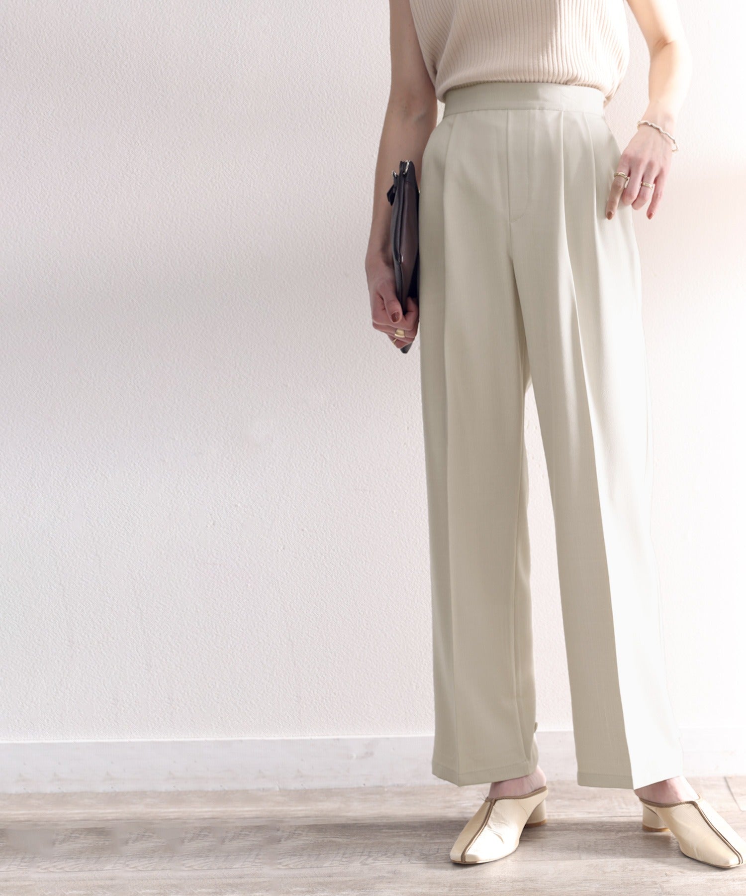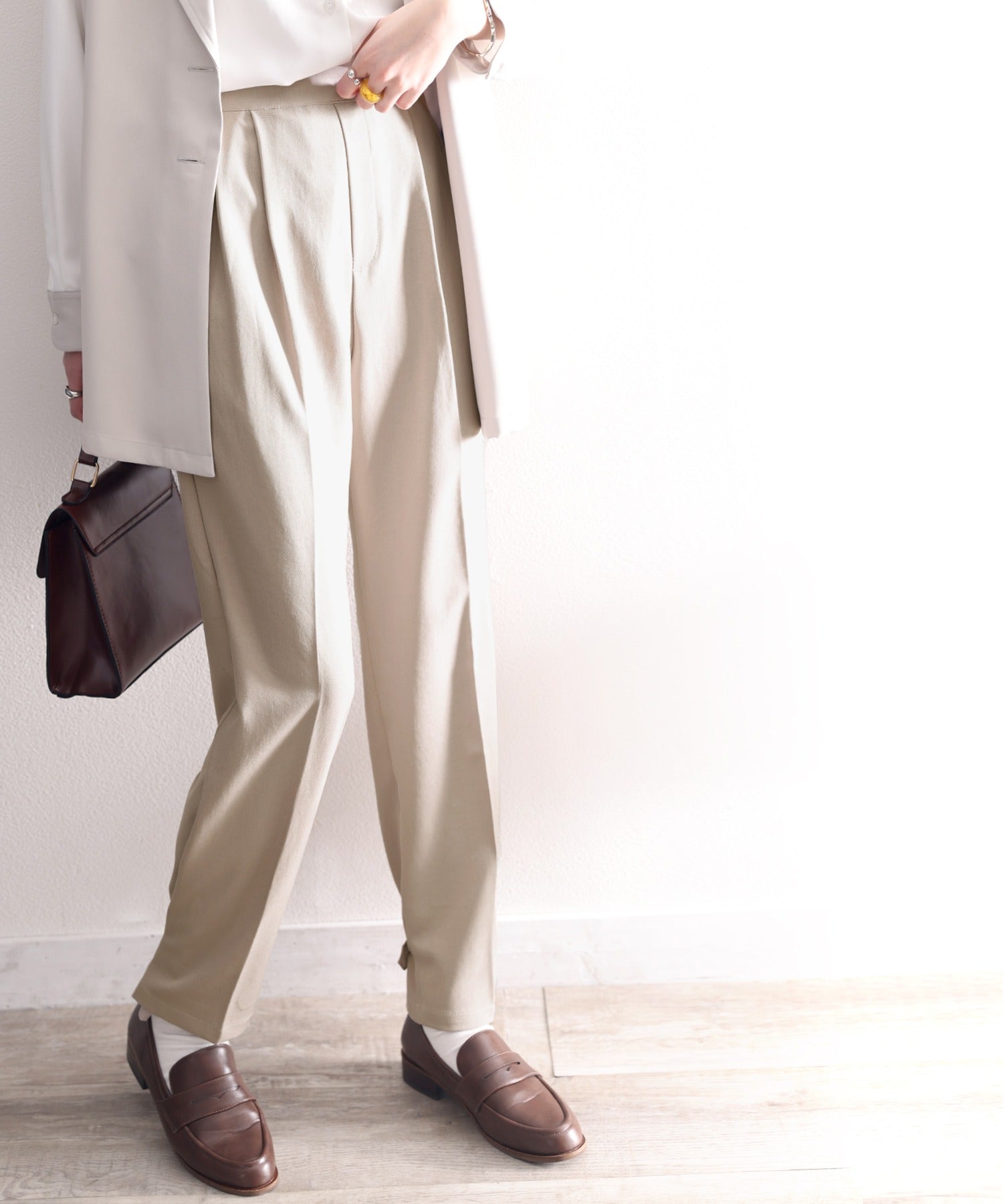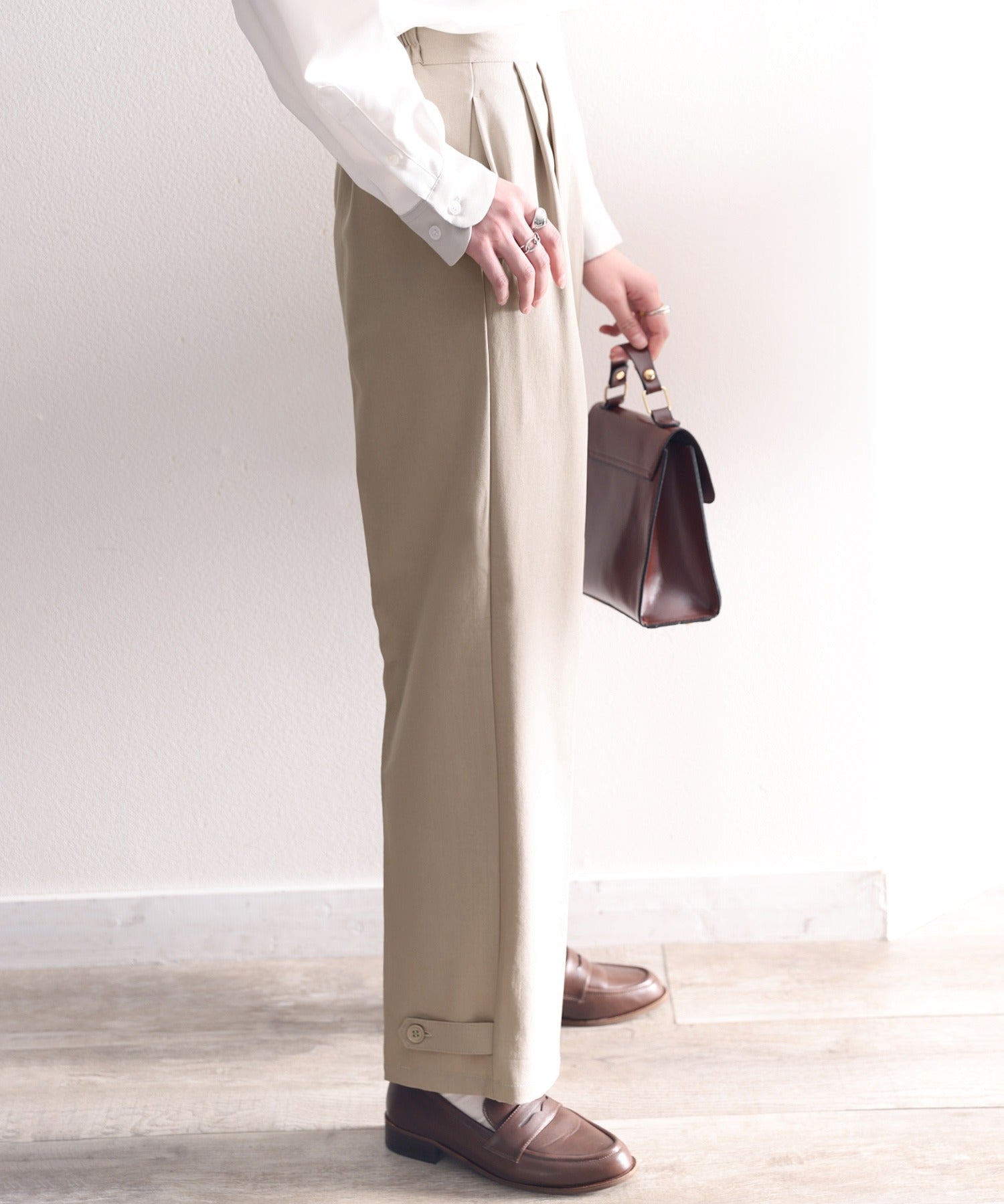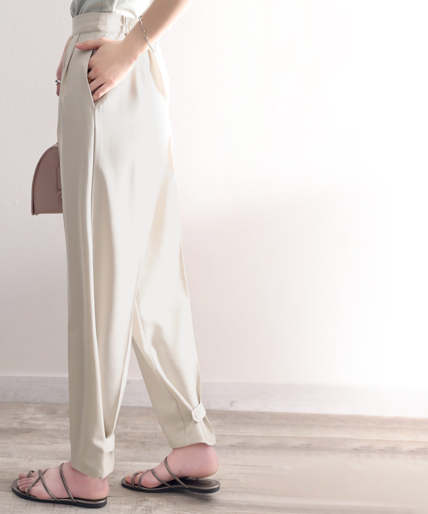 単調になりがちなパンツもこなれ感のある装いに。