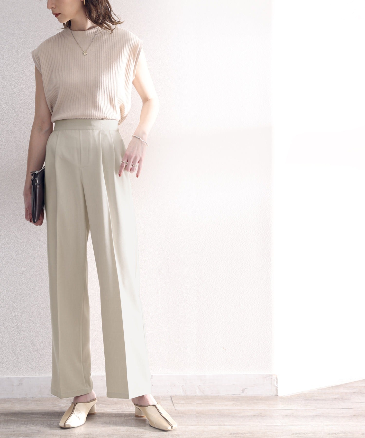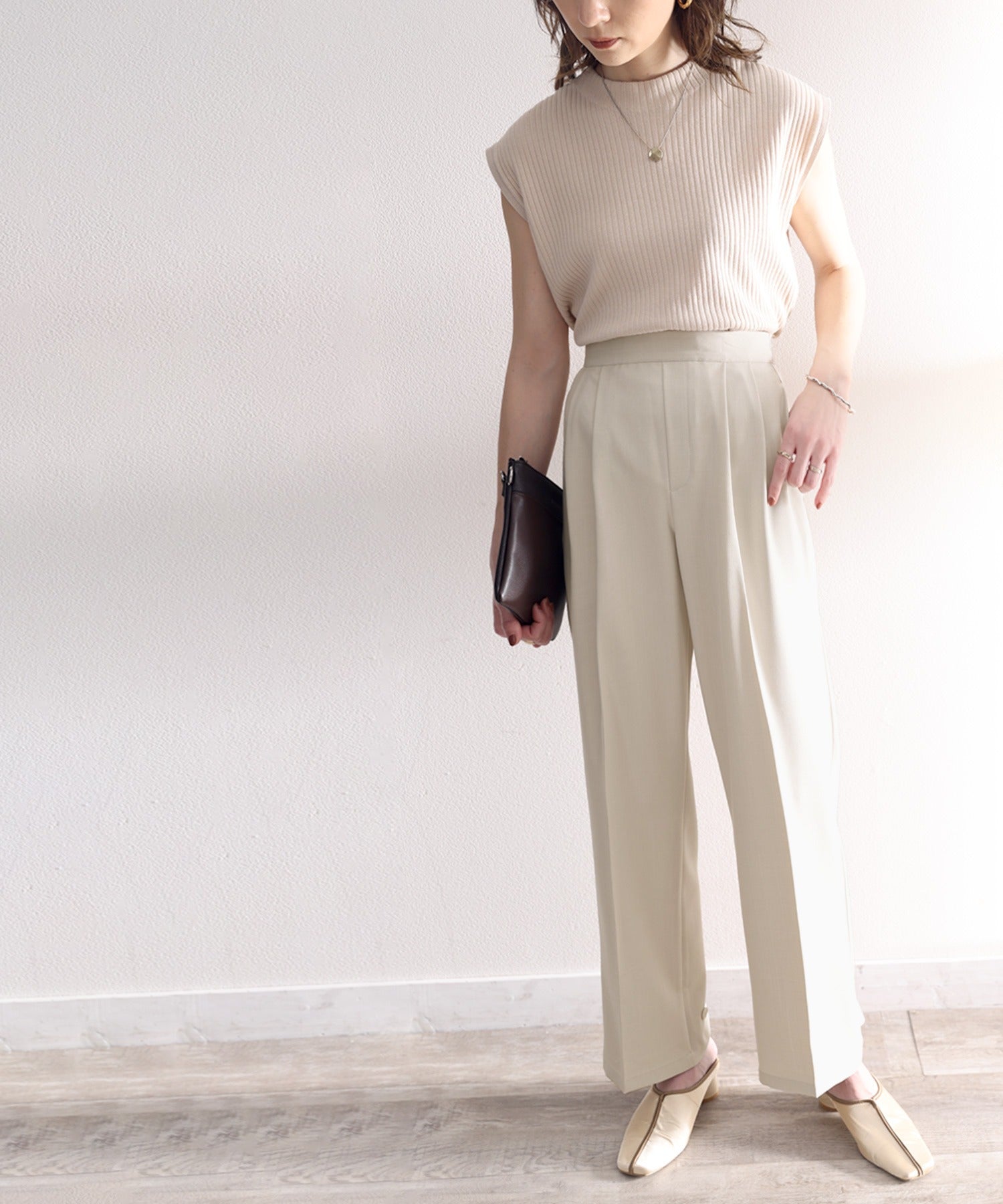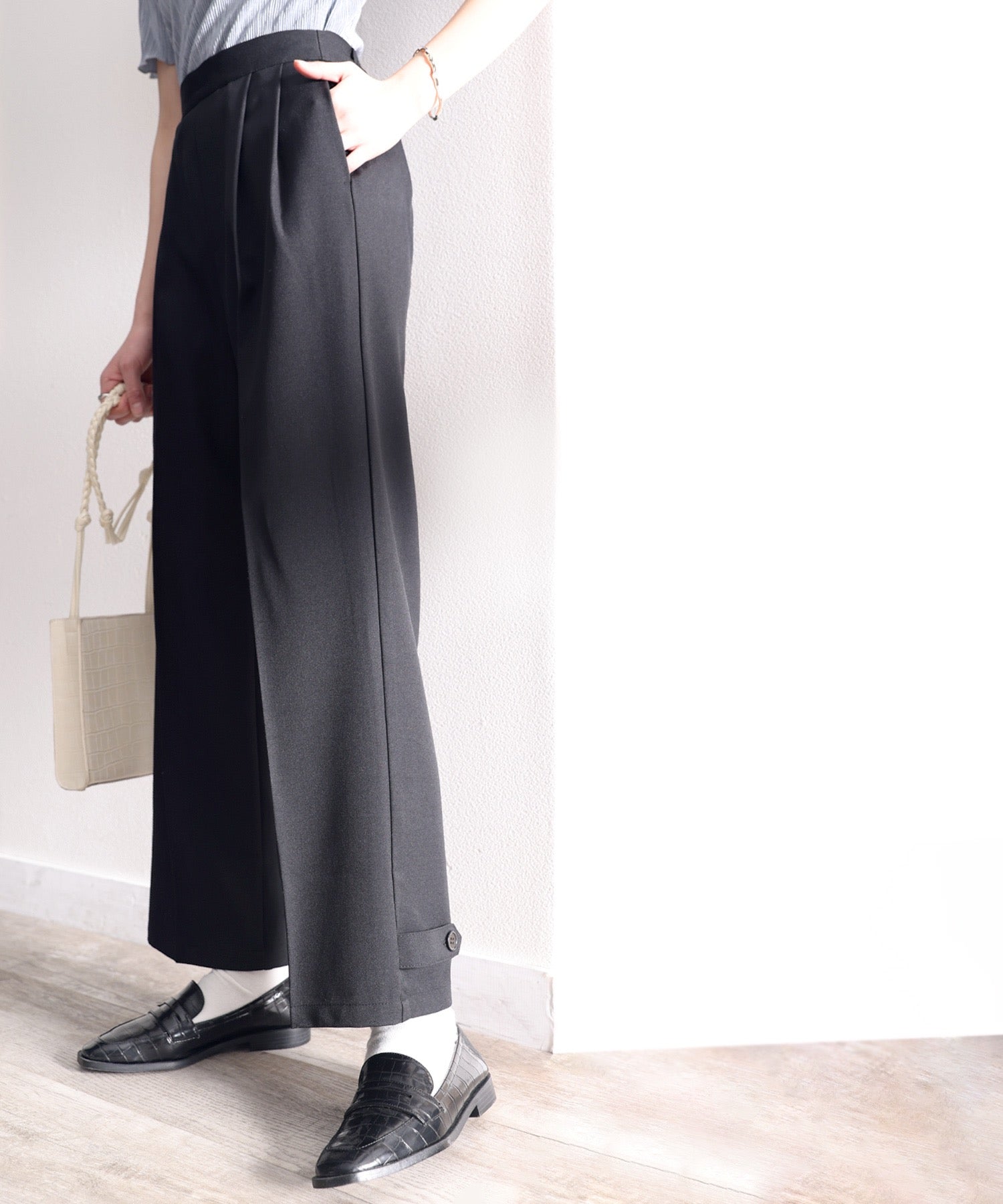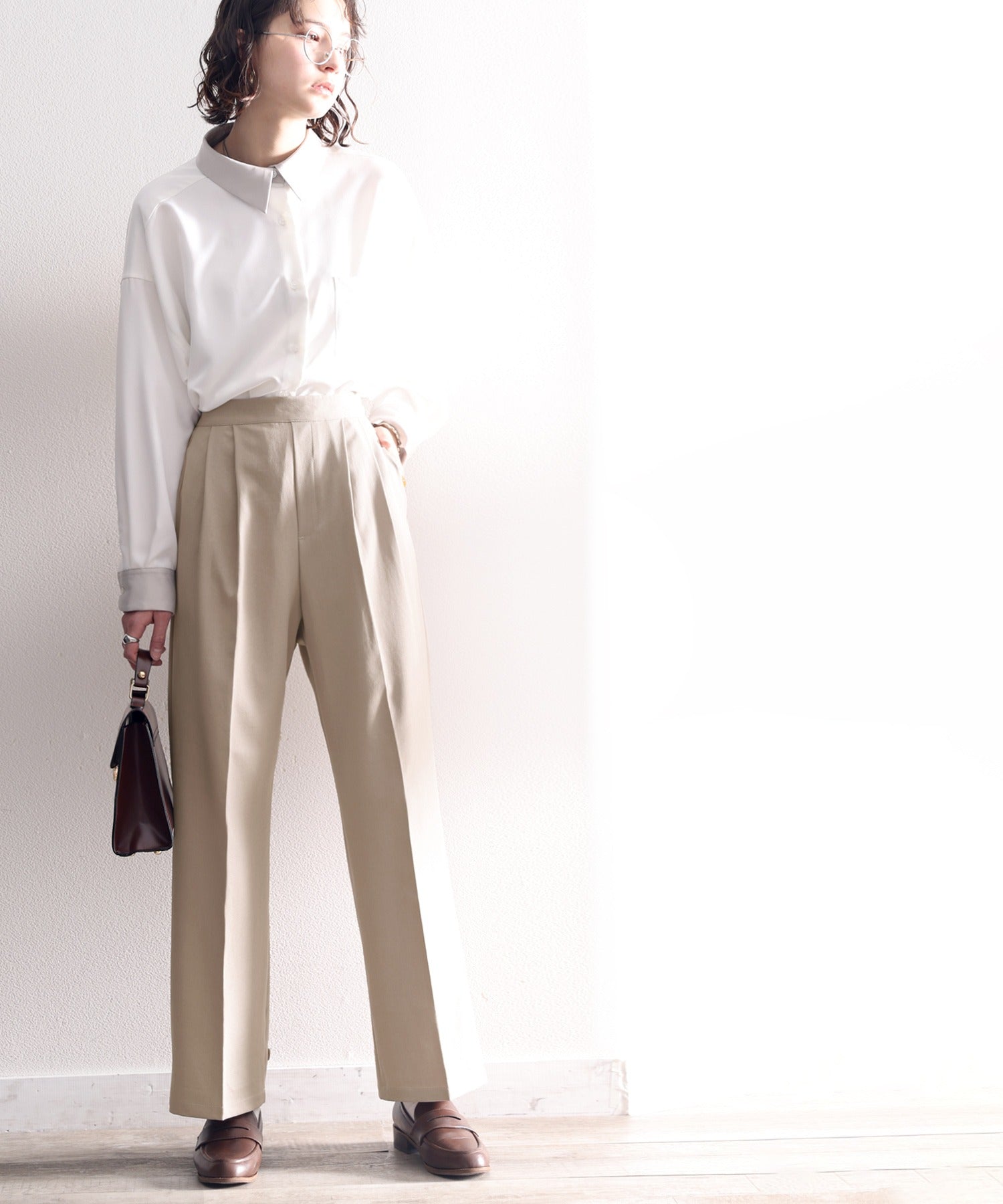 単調になりがちなパンツもこなれ感のある装いに。