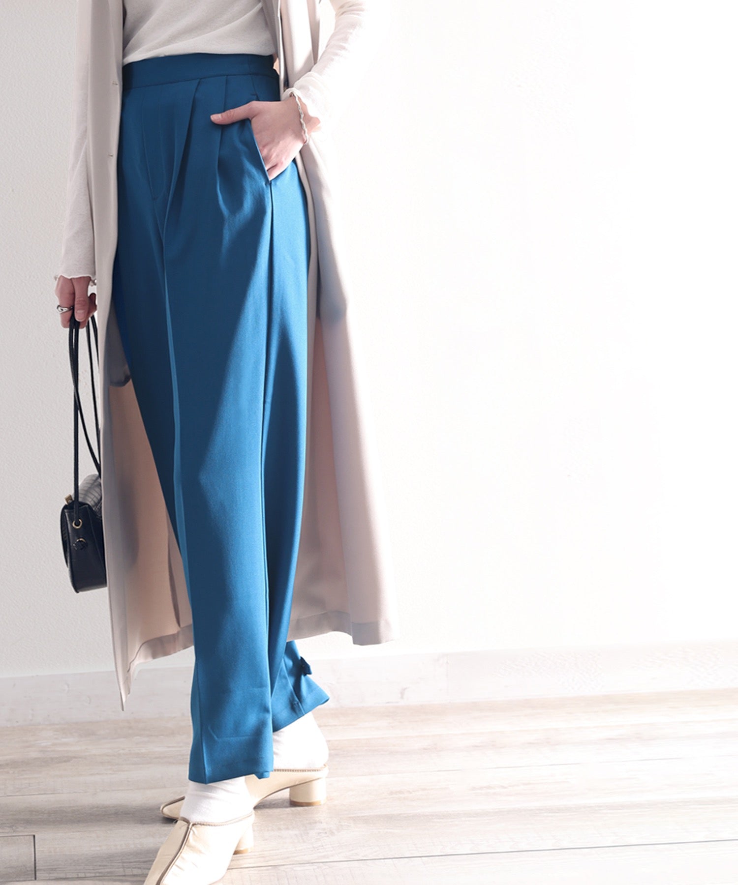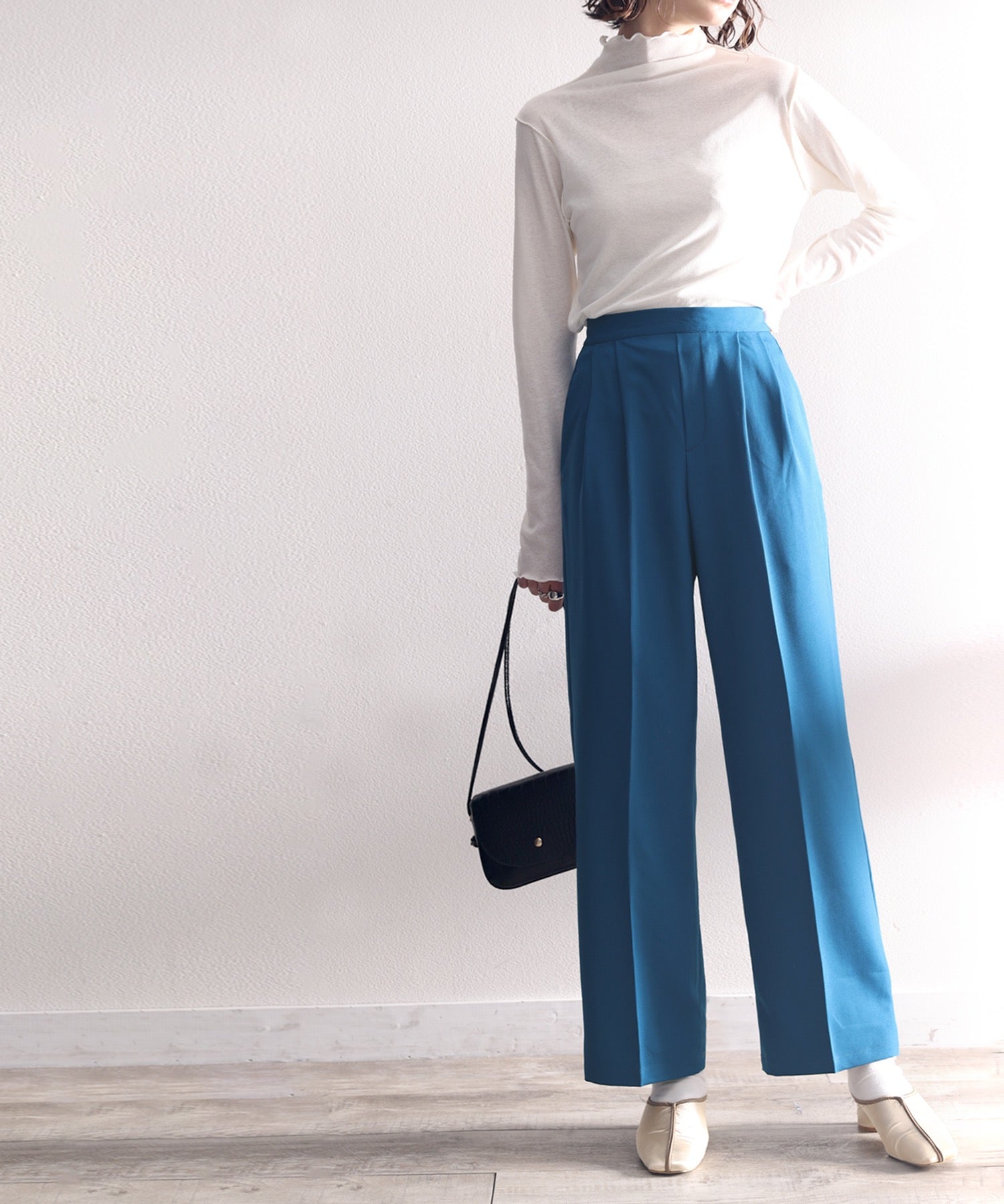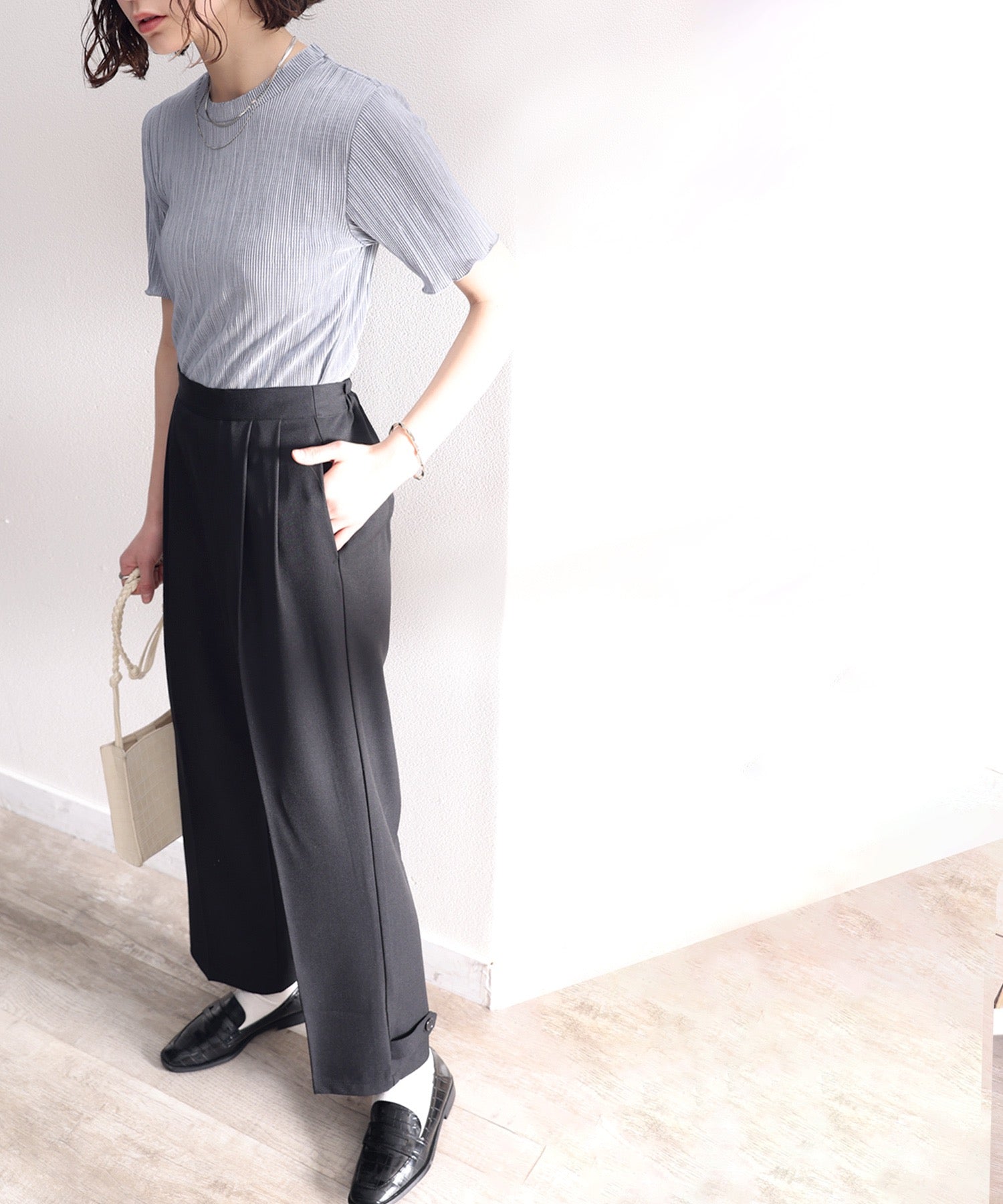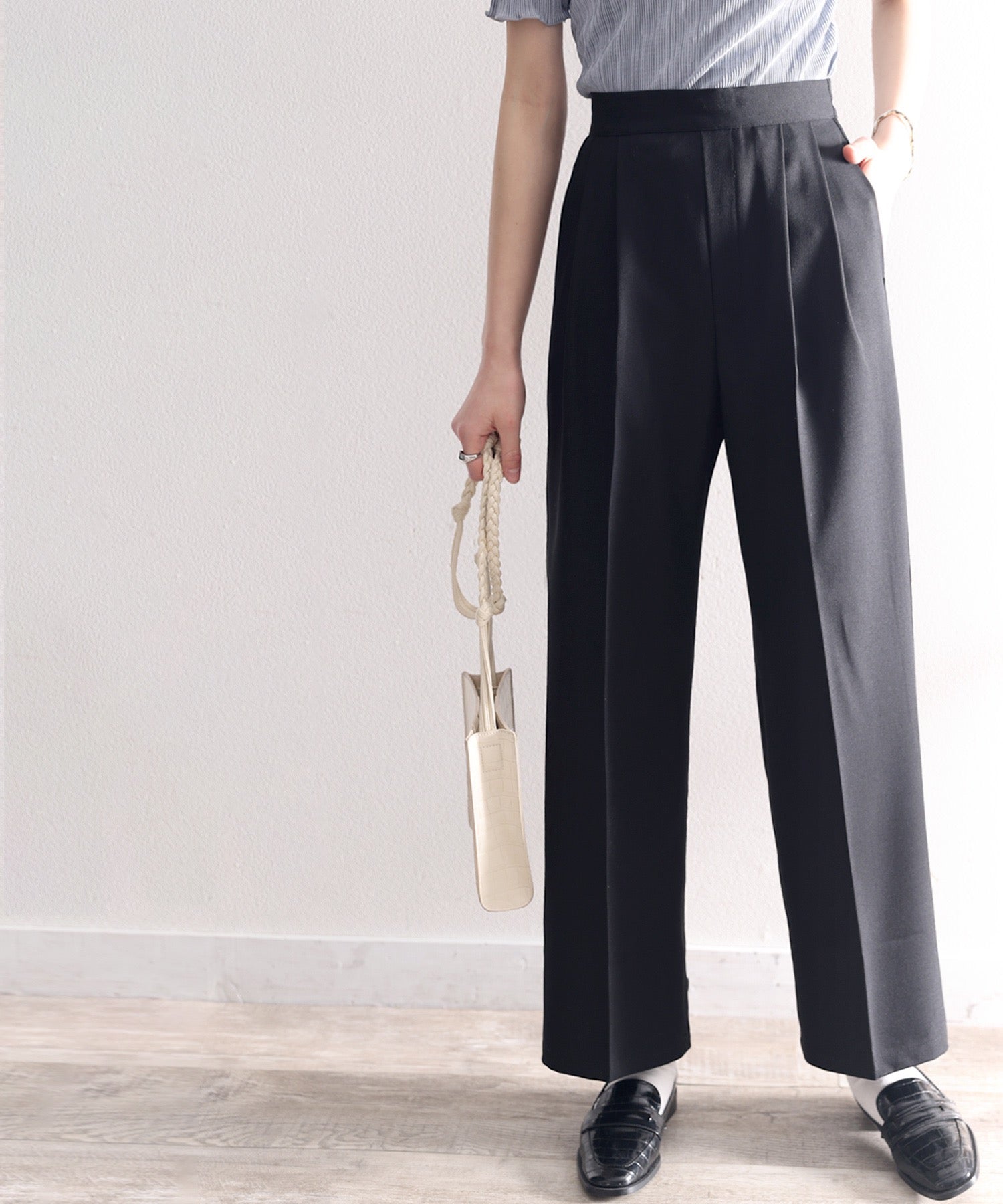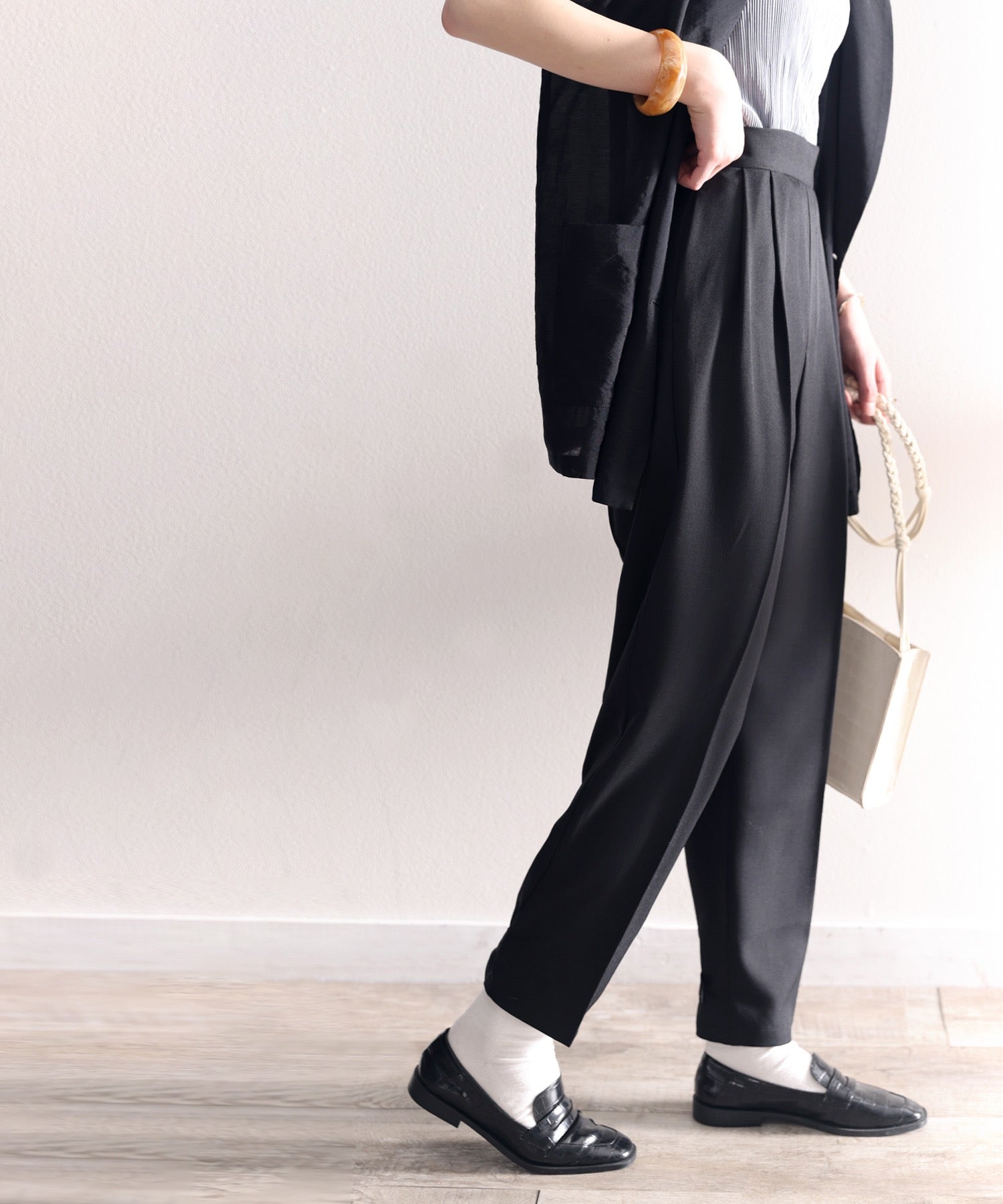 単調になりがちなパンツもこなれ感のある装いに。