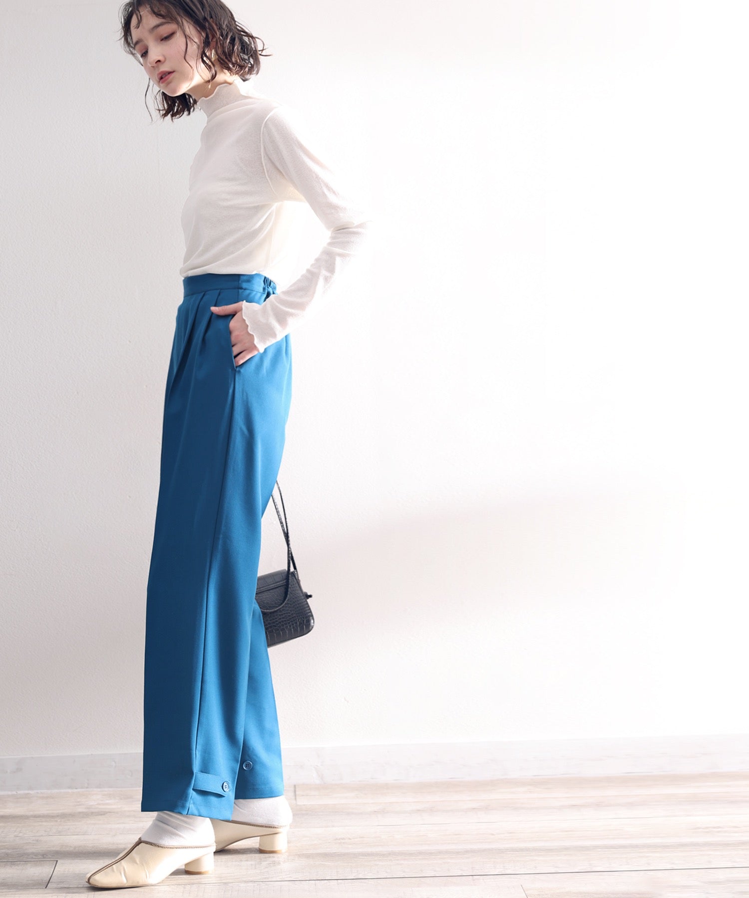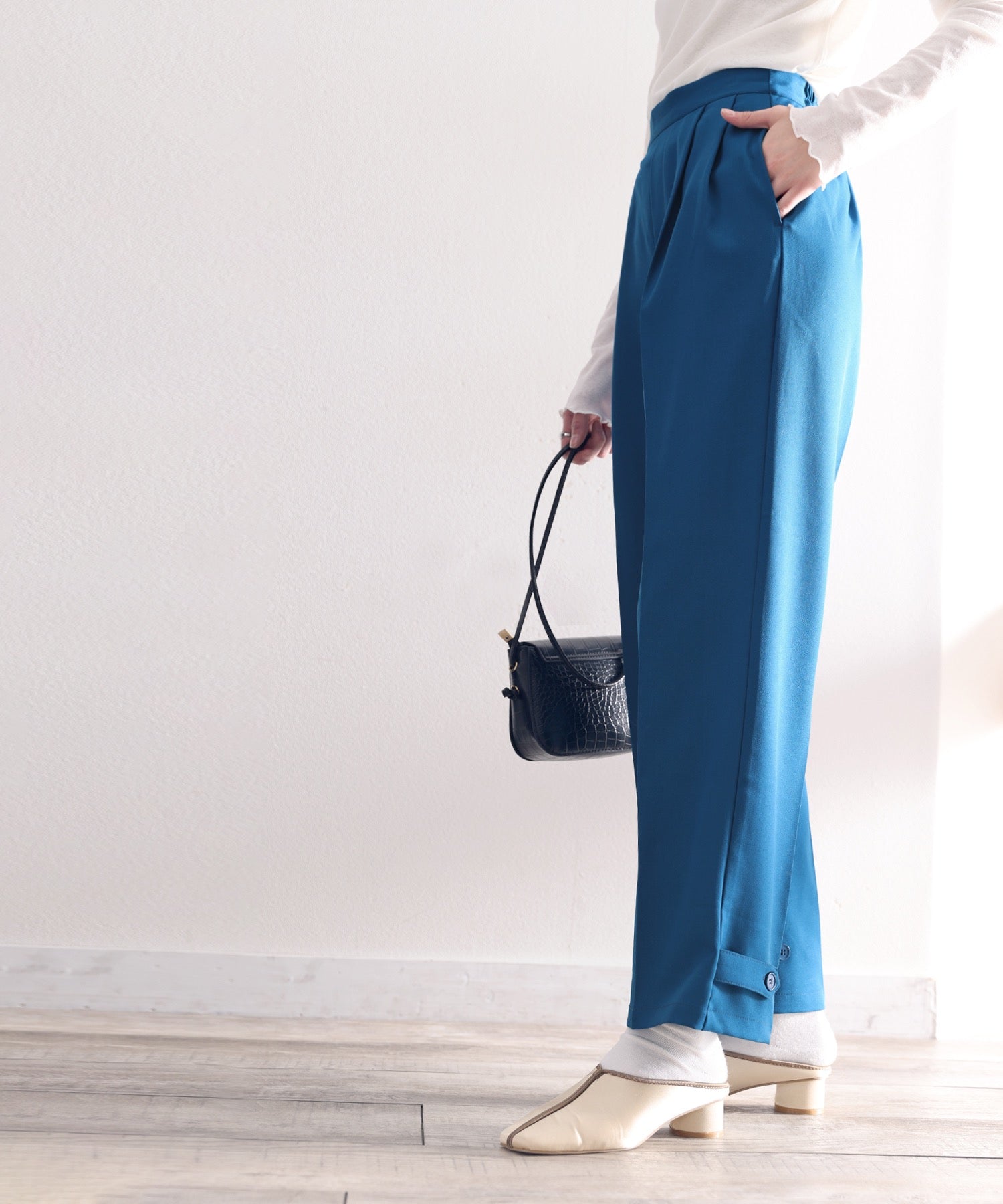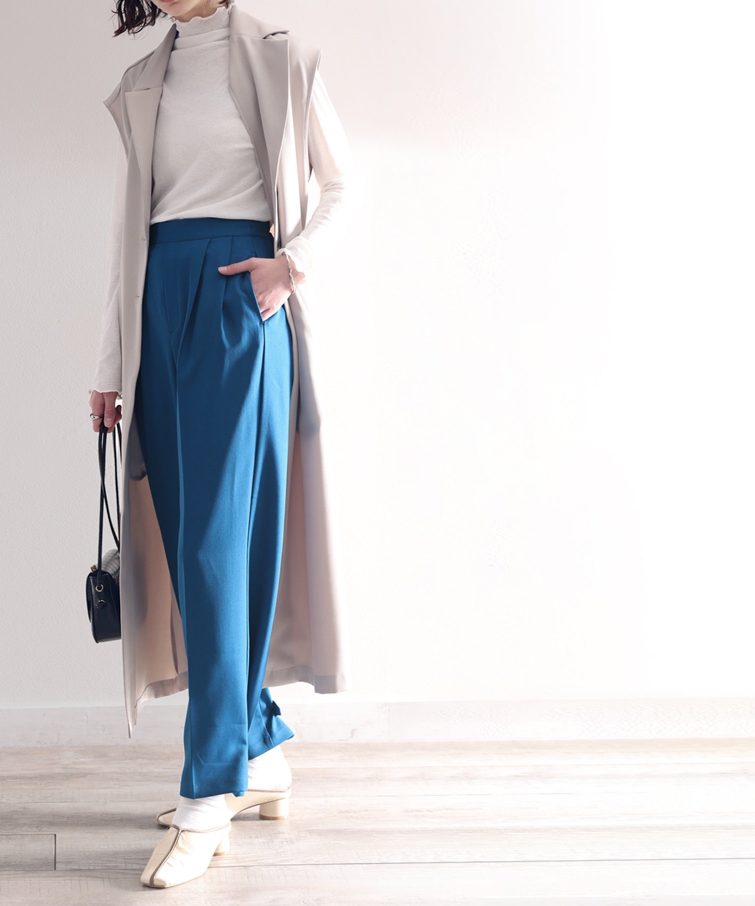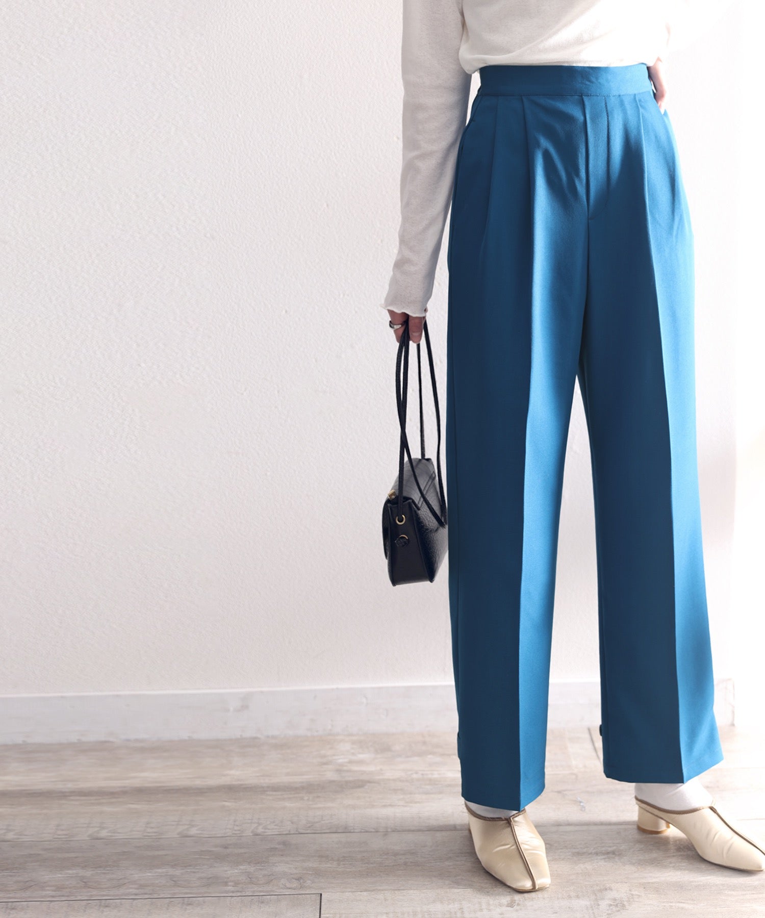単調になりがちなパンツもこなれ感のある装いに。