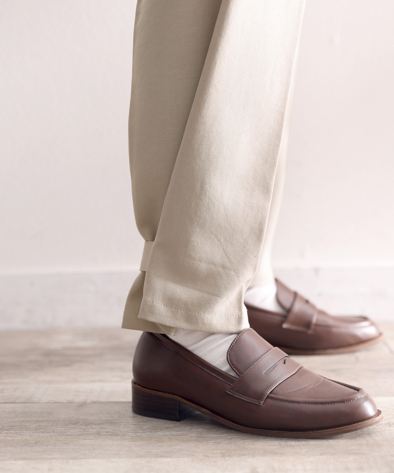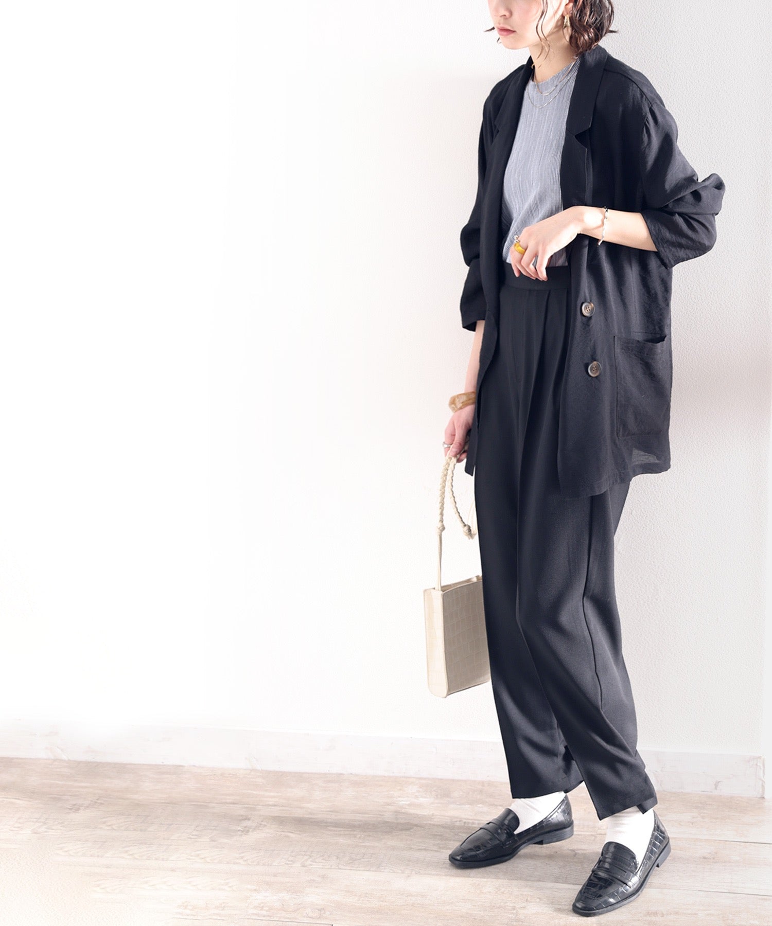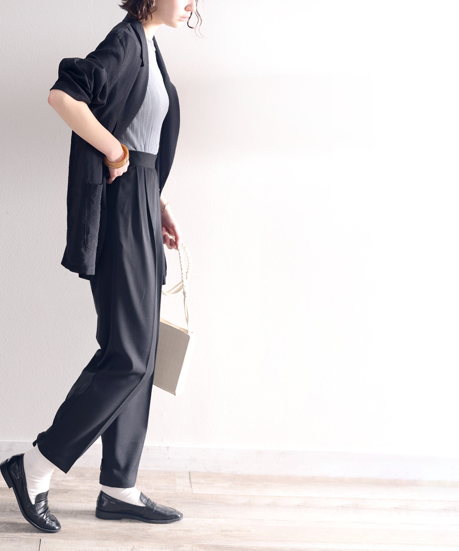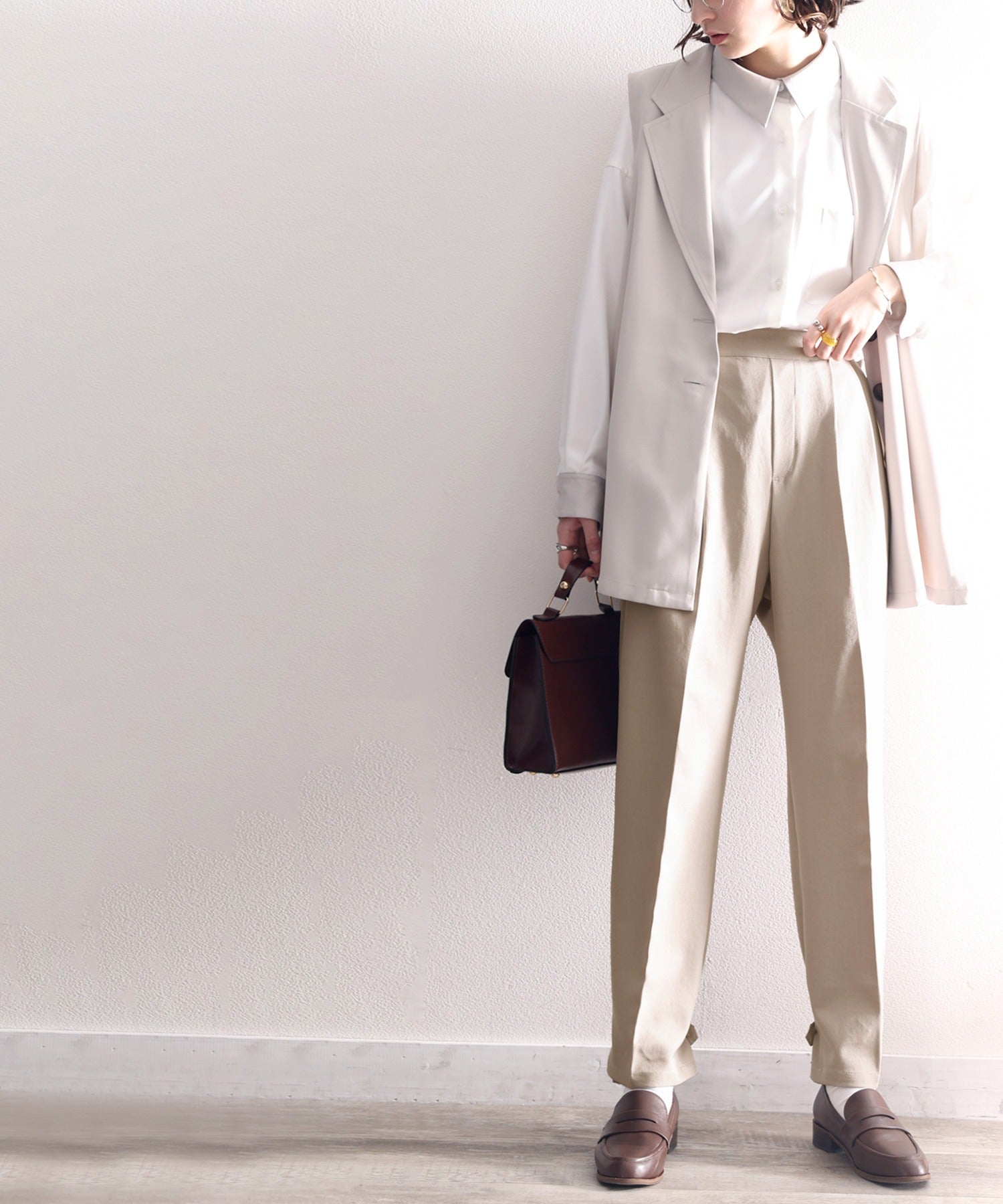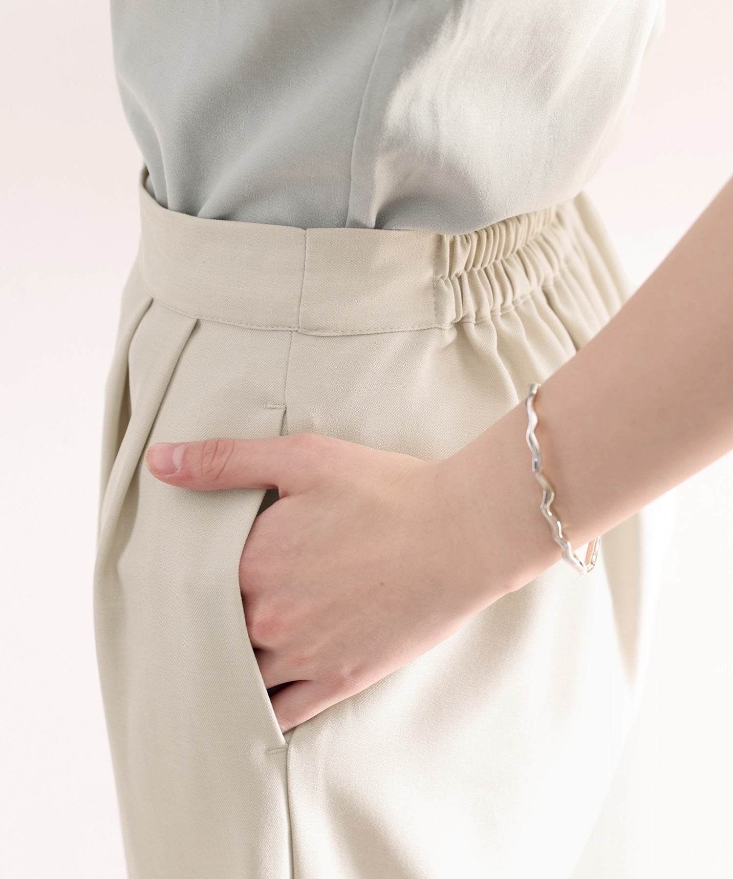 単調になりがちなパンツもこなれ感のある装いに。