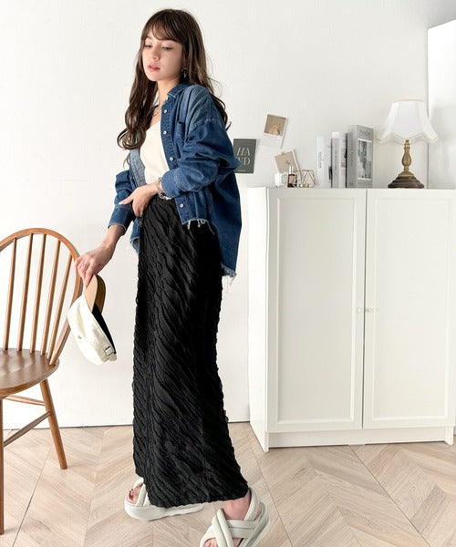 シンプルなトップスでも、スカートの存在感でスタイリングが引き立ちますよ☆