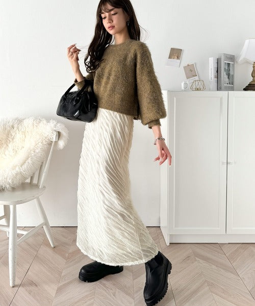 秋冬はシャギーニットやモヘアニットを合わせて暖かいコーデを楽しめますし、