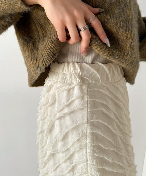 カットフリルバックスリットスカートは、モダンなデザインと女性らしさを兼ね備えた一着です。