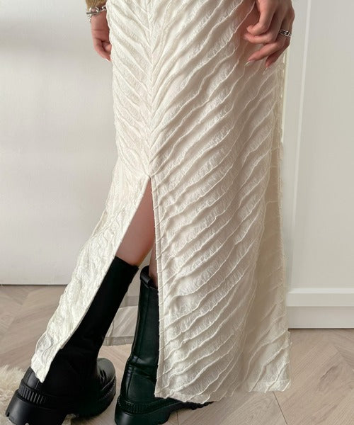 トレンド感溢れるスリットが、より一層の動きをもたらし、さりげなく足元を見せることで、洗練された印象を与えます。